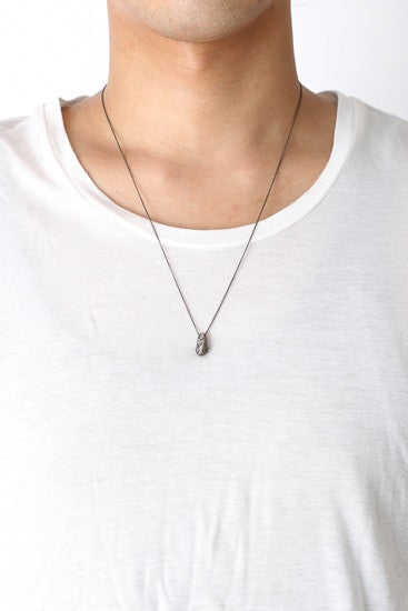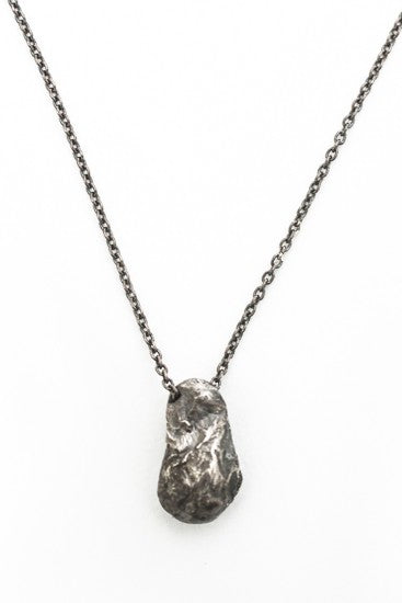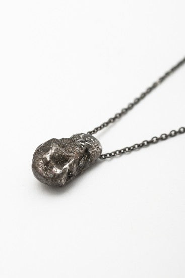 メルトストーンネックレス。シルバーの塊を溶かして隕石の様な、加工感を表現したトップをアクセントに。1つ1つハンドで製作している為、形状が異なります。チェーンも種類を2種類使用し切り替えているので、さりげなく個性的な雰囲気を楽しめます。引手の金具もiolom オリジナルで1つ1つハンドメイドで製作しています。