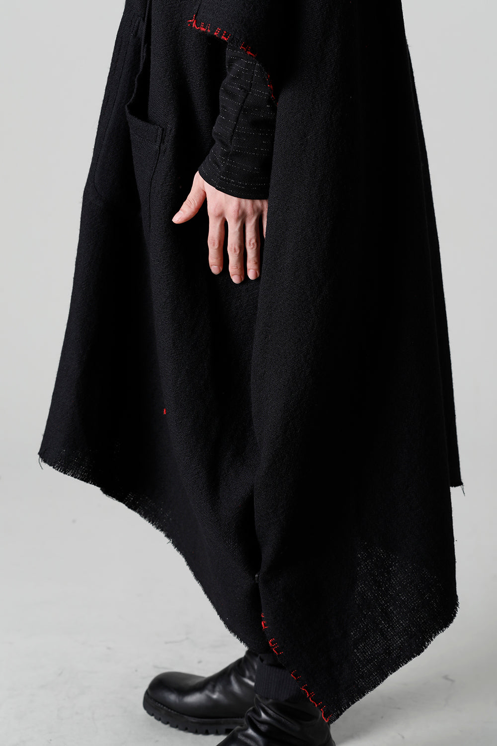 身頃の両端には生地の耳部分をそのまま使用し、裾は断ち切り始末。
