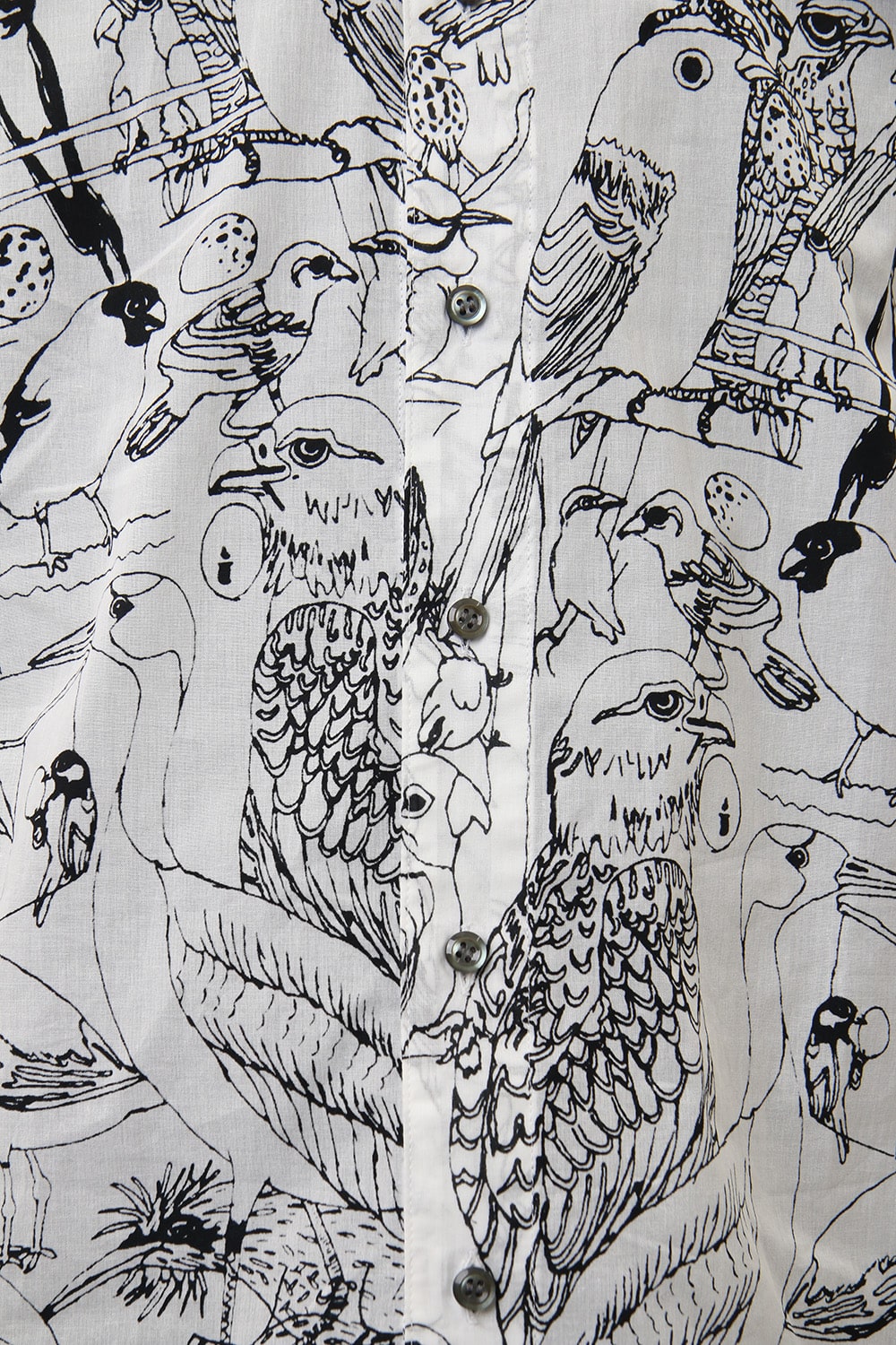 透け感のある50コットンボイル生地に城谷明子さんの描かれた鳥の絵をプリントしたレギュラーカラーシャツです。