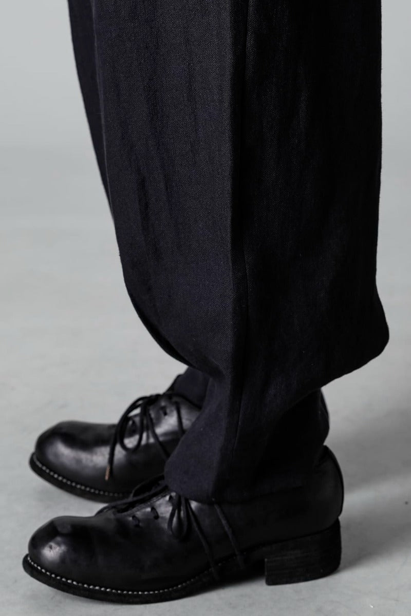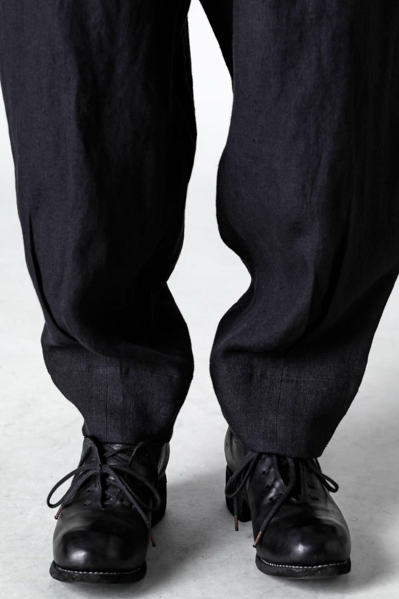 腰回りにゆとりがあり、裾にタックをとってメリハリをつけたユニークなワイドシルエットのパンツ。ヘリンボーン織りのリネン生地は柔らかく通気性のある春夏らしい生地。バイオウォッシュをかけることでこなれた雰囲気もあります。individualらしいアンニュイなスタイルを楽しみたいという方にオススメのアイテムです。