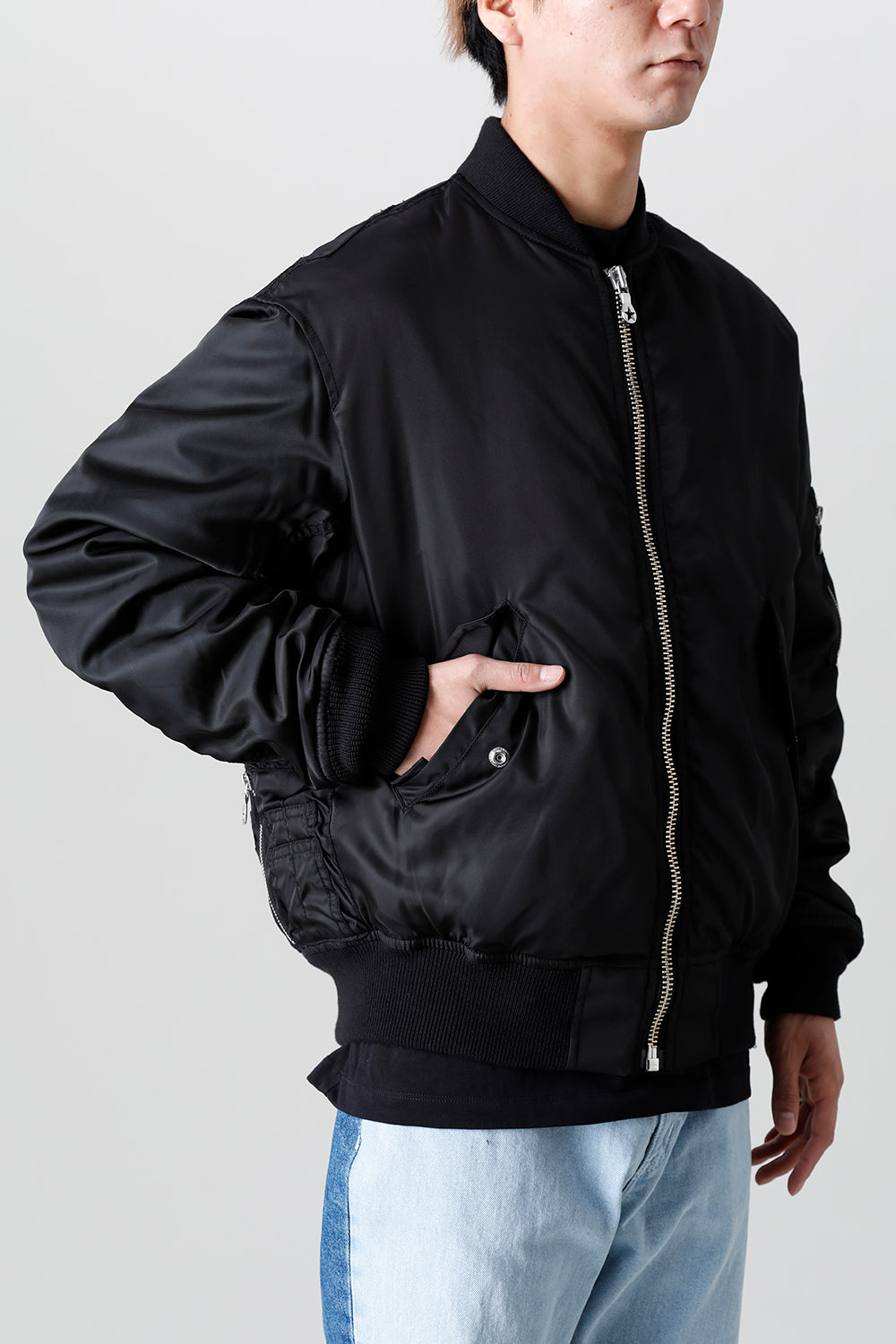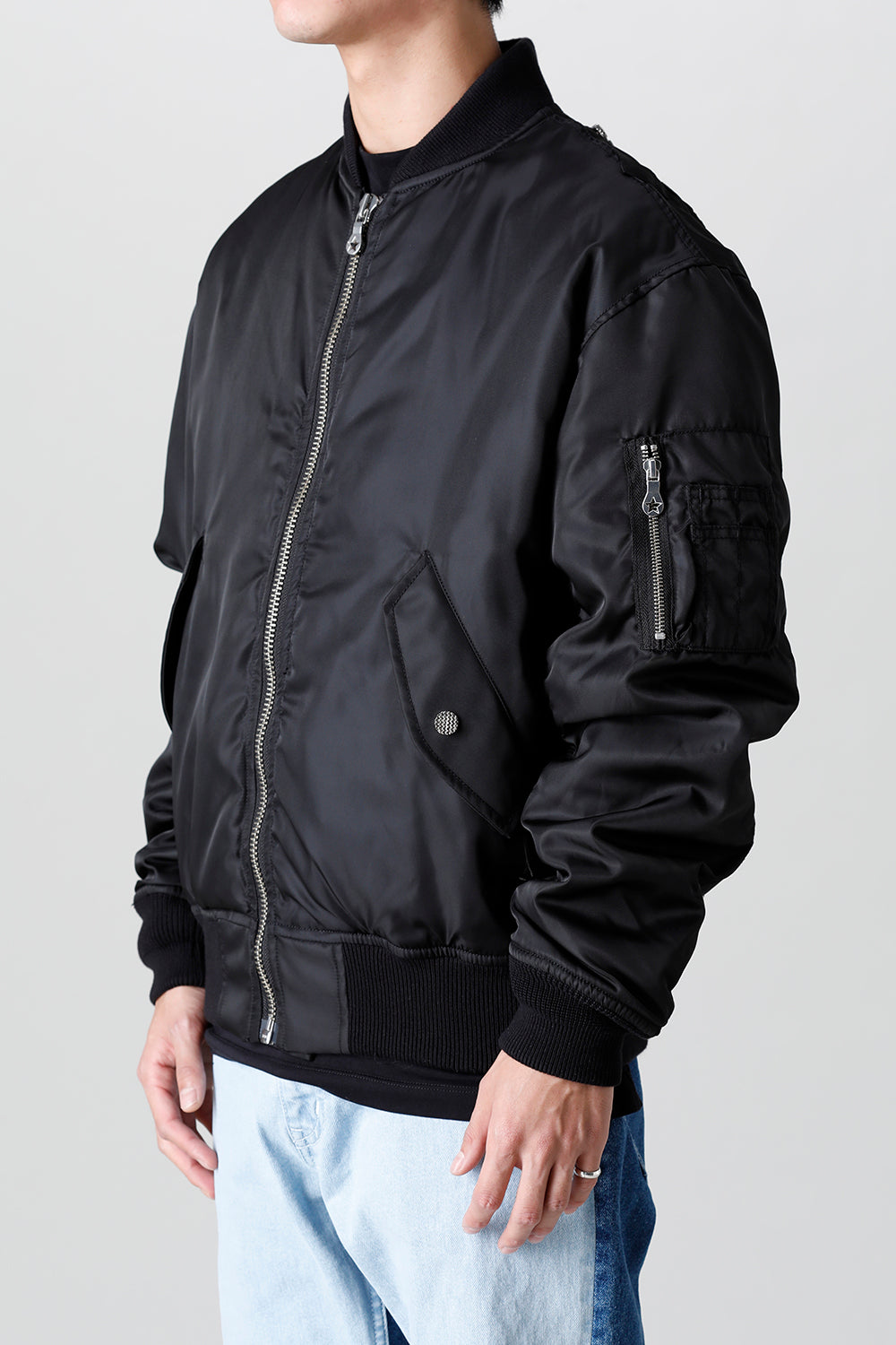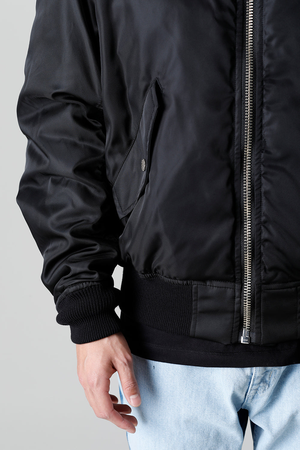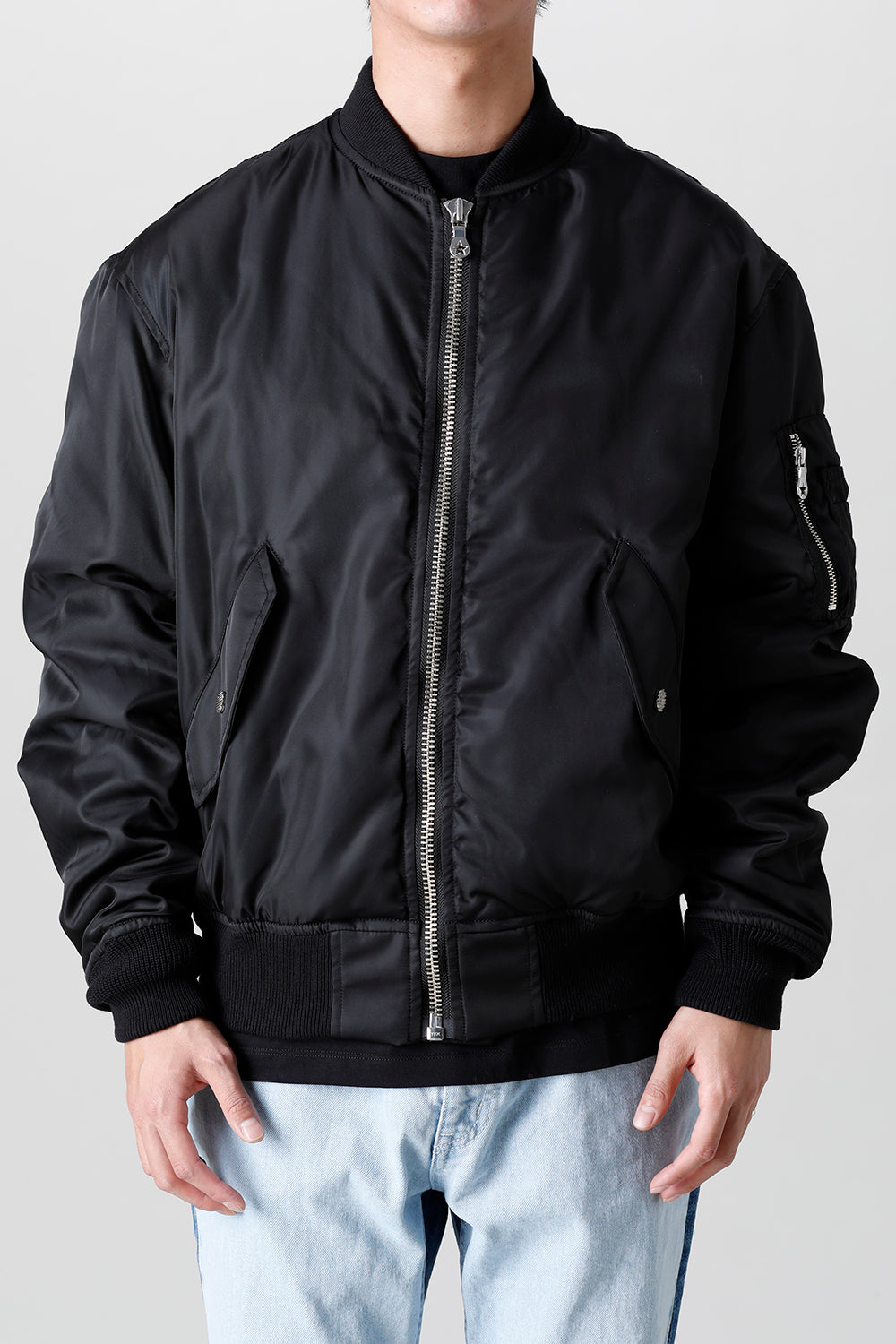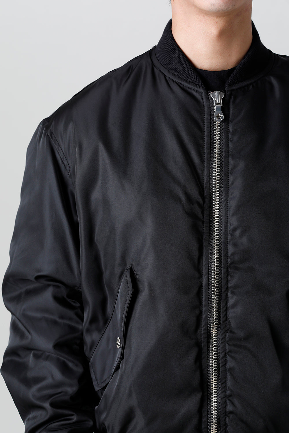 素材に光沢感豊かなナイロンツイルを使用したボンバージャケット。