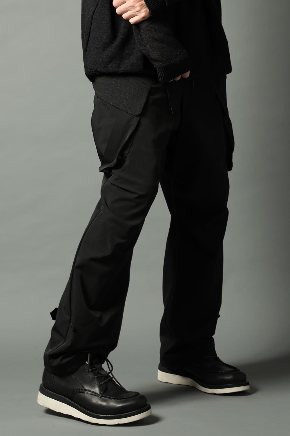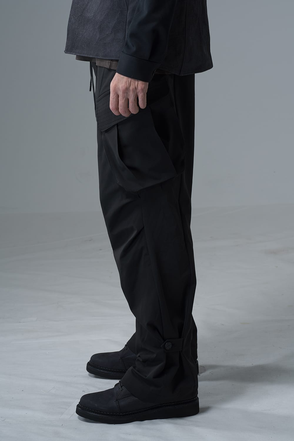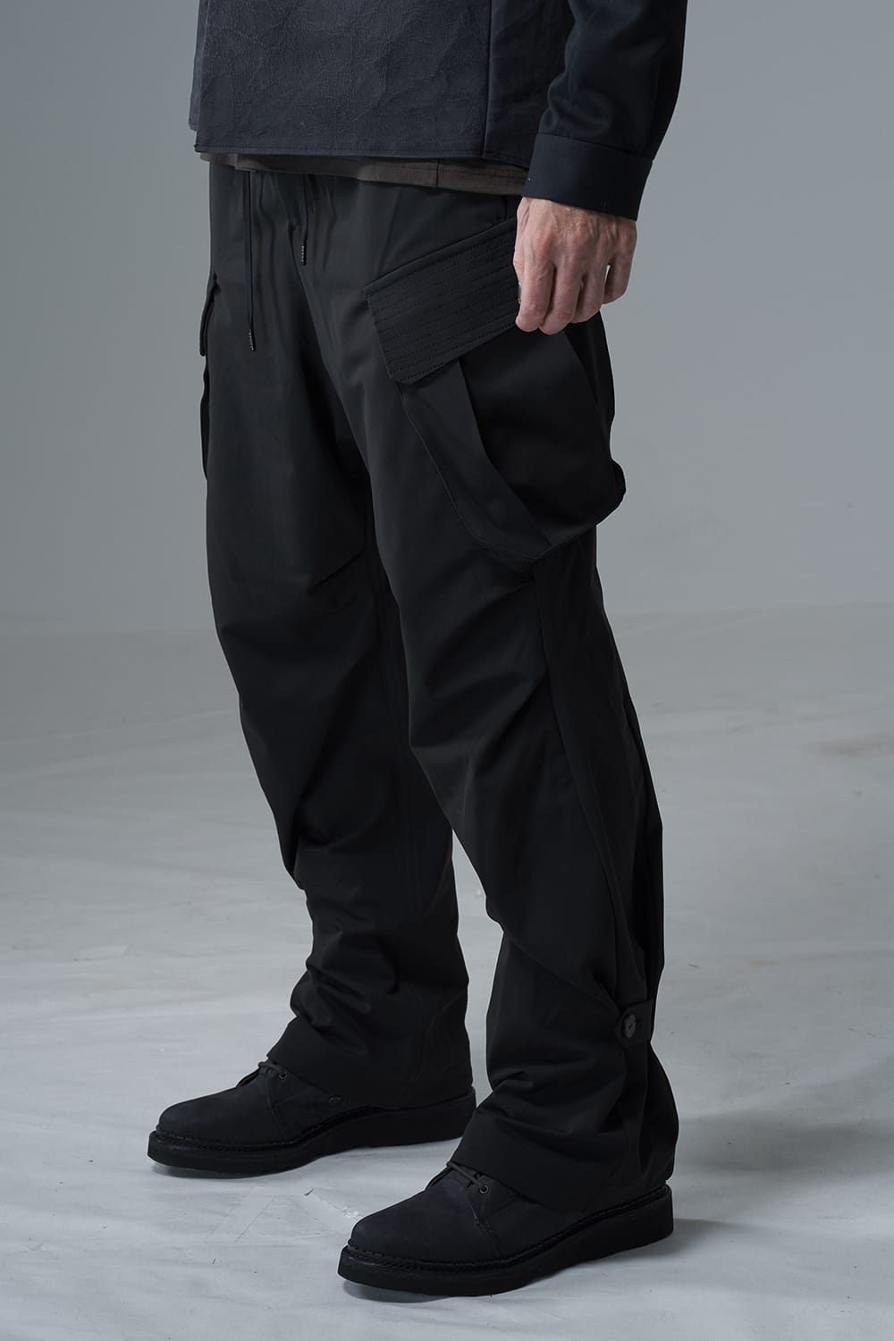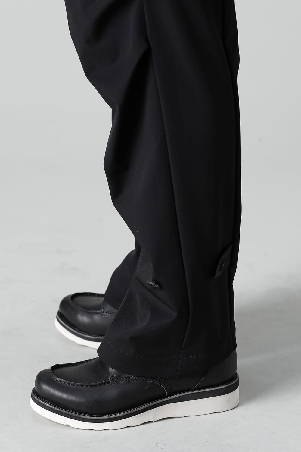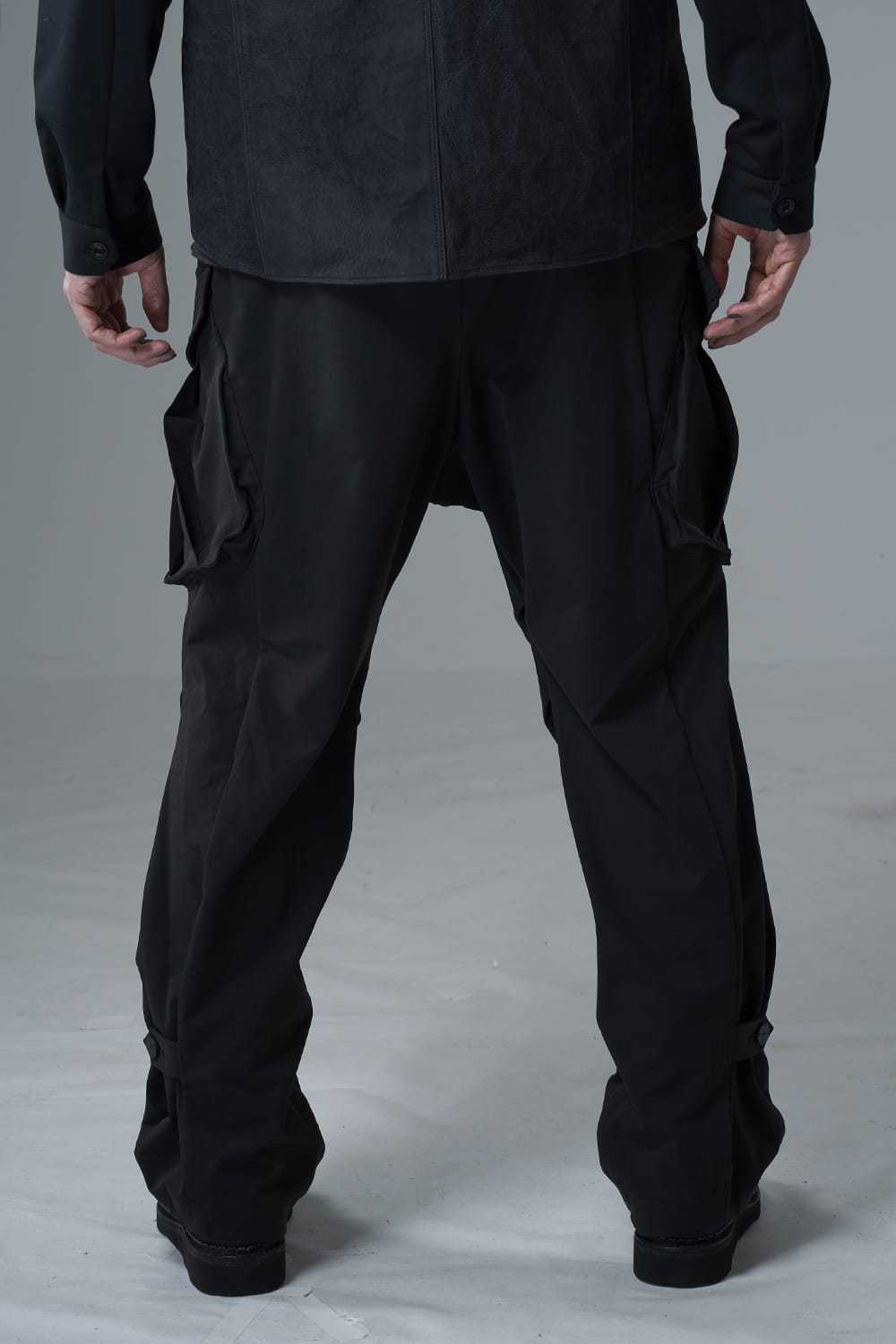 股上を深く取り、フランス軍M47 のカーゴパンツのディティールを合わせて独自のパターンで再構築しました。裾にはカーゴパンツのディティールを残してボタンで止めることによりシルエットに変化を与えることができます。