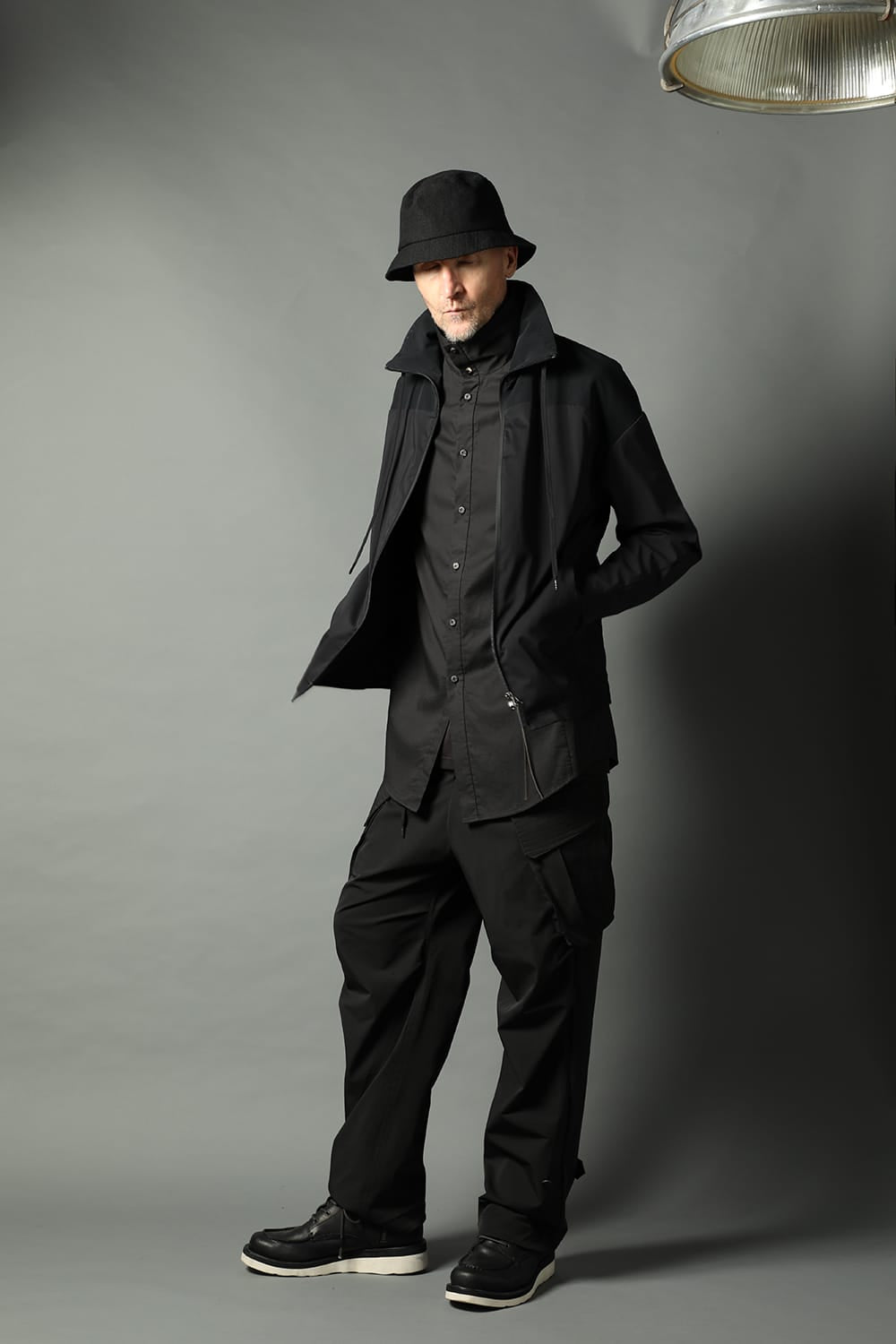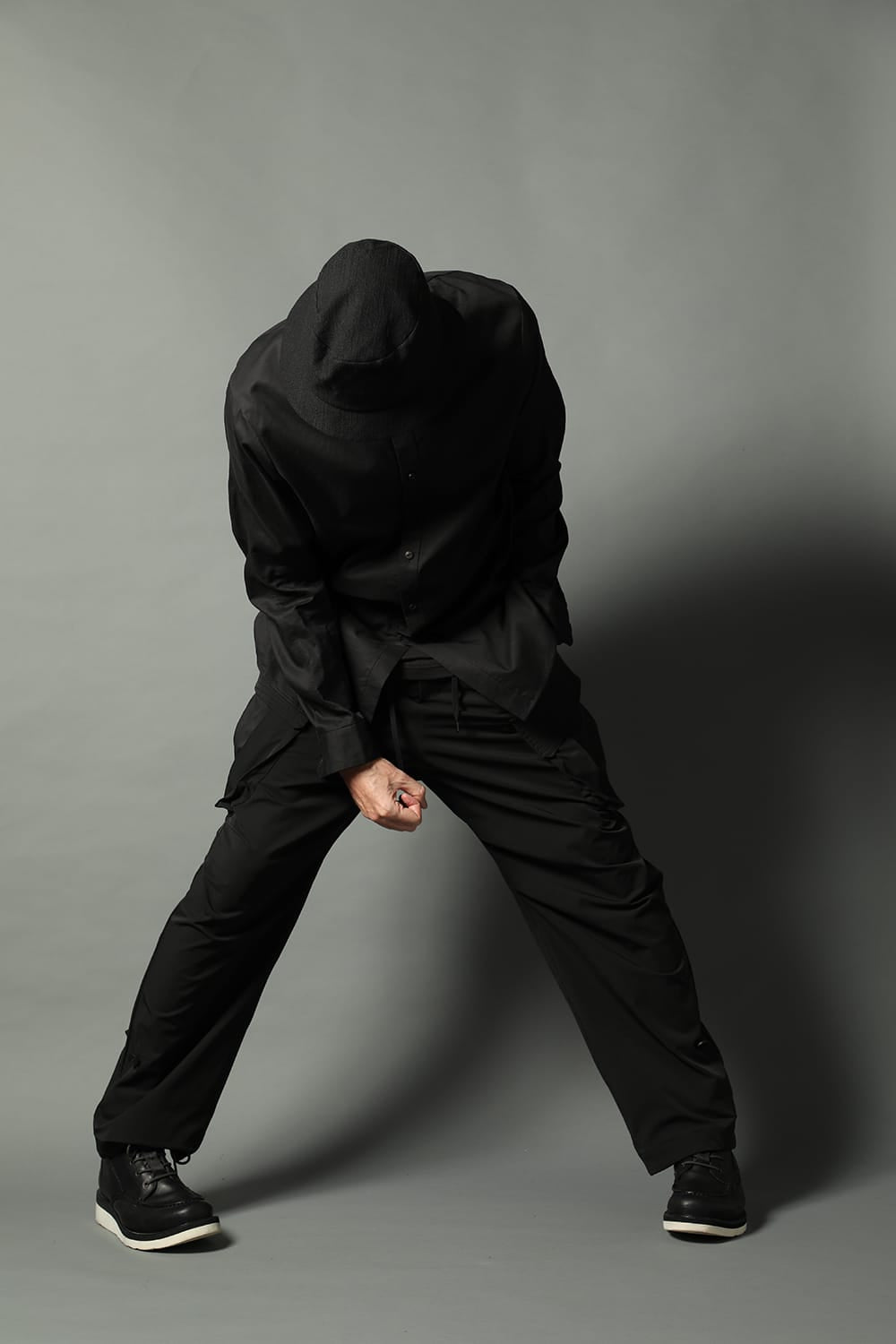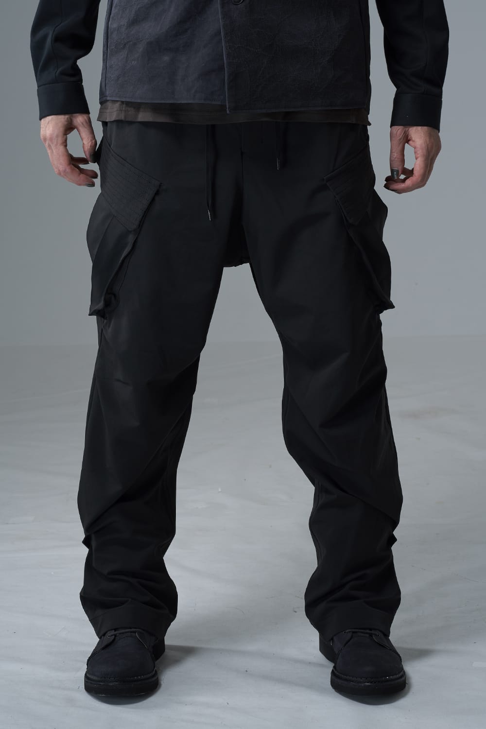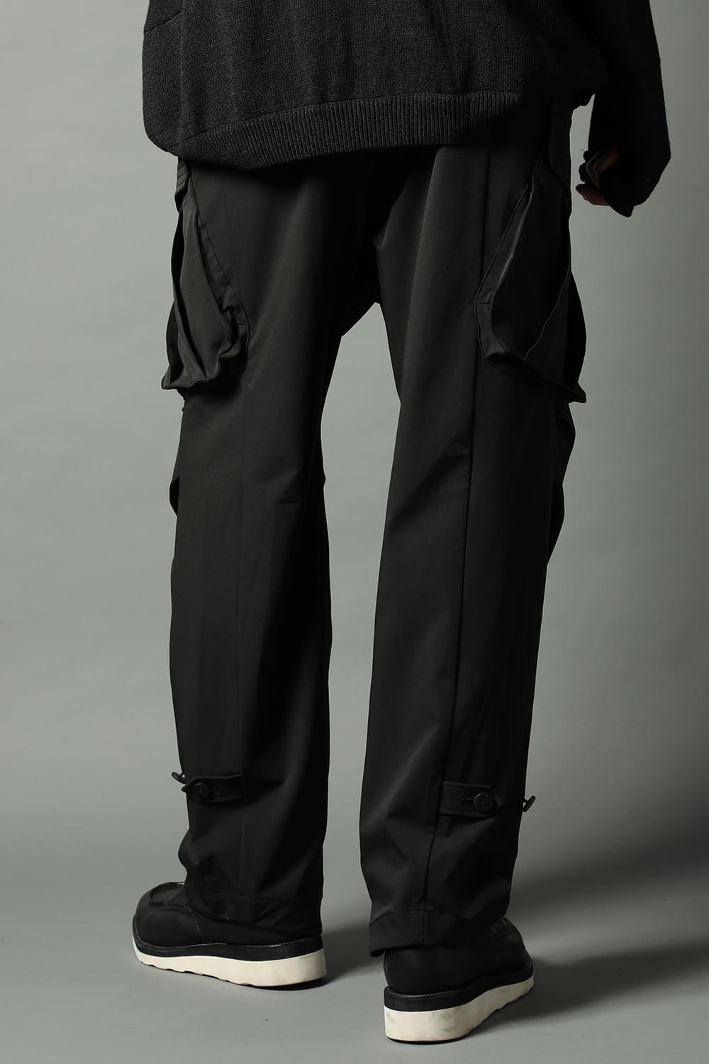 股上を深く取り、フランス軍M47 のカーゴパンツのディティールを合わせて独自のパターンで再構築しました。裾にはカーゴパンツのディティールを残してボタンで止めることによりシルエットに変化を与えることができます。