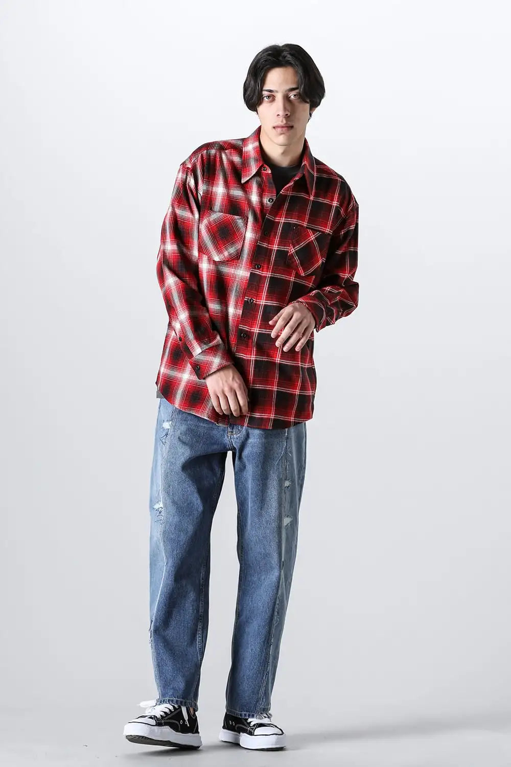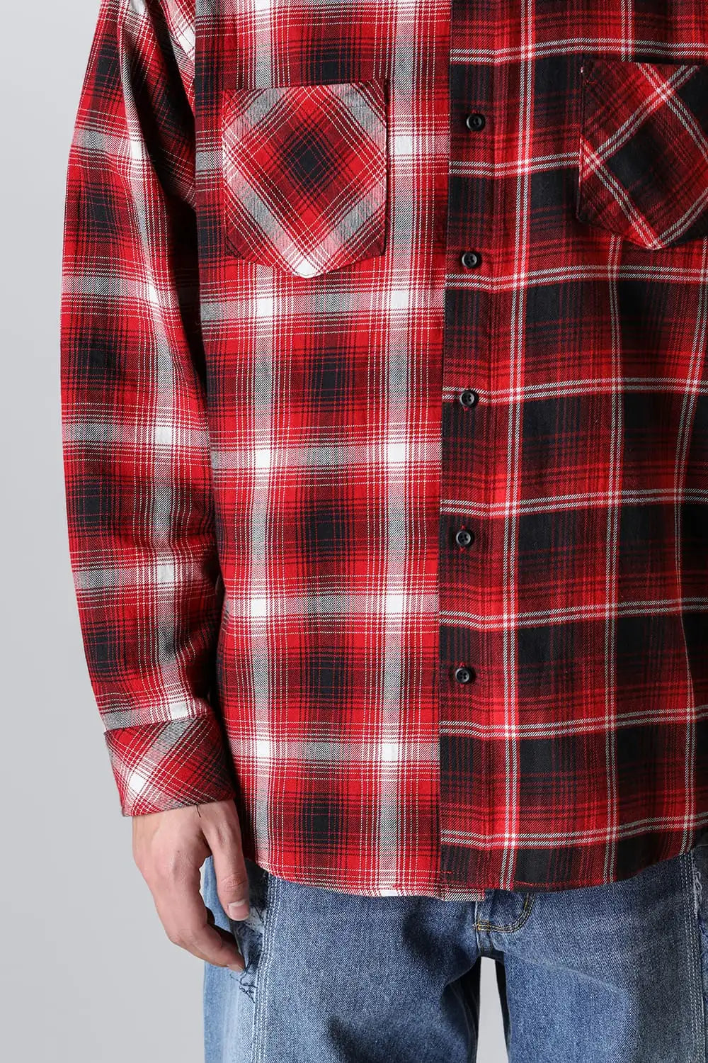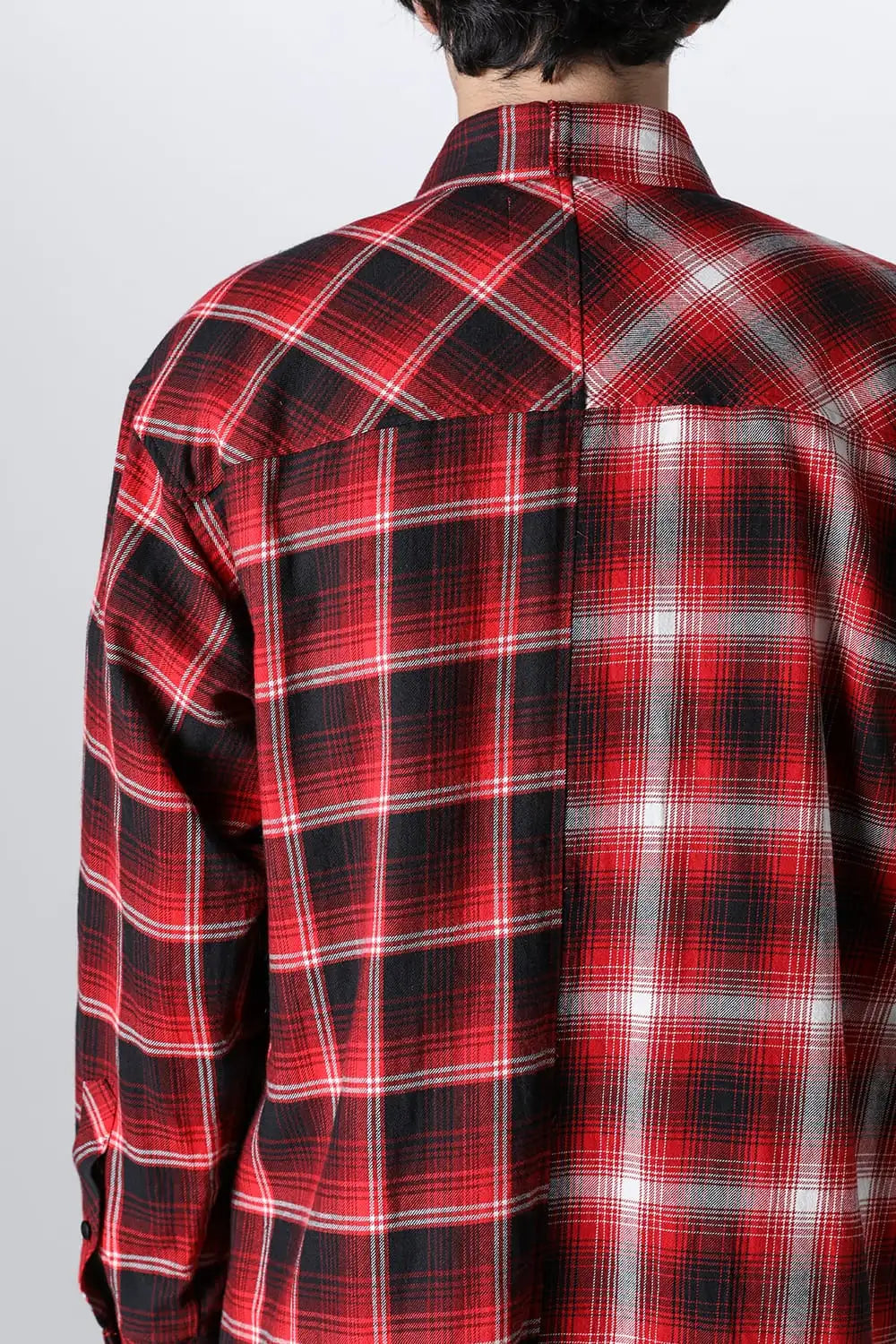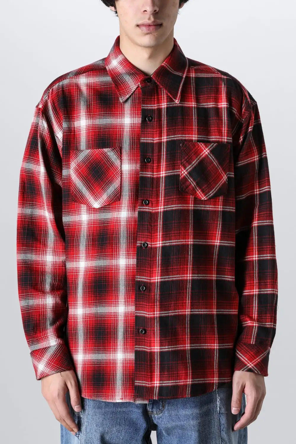 ・左右で別パターンのチェック生地をコンビ使いしたドッキングデザイン