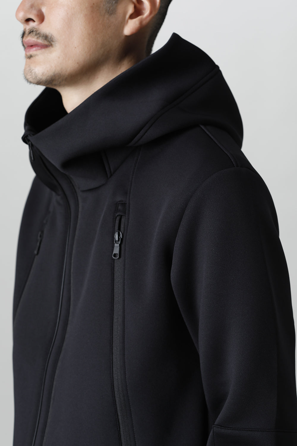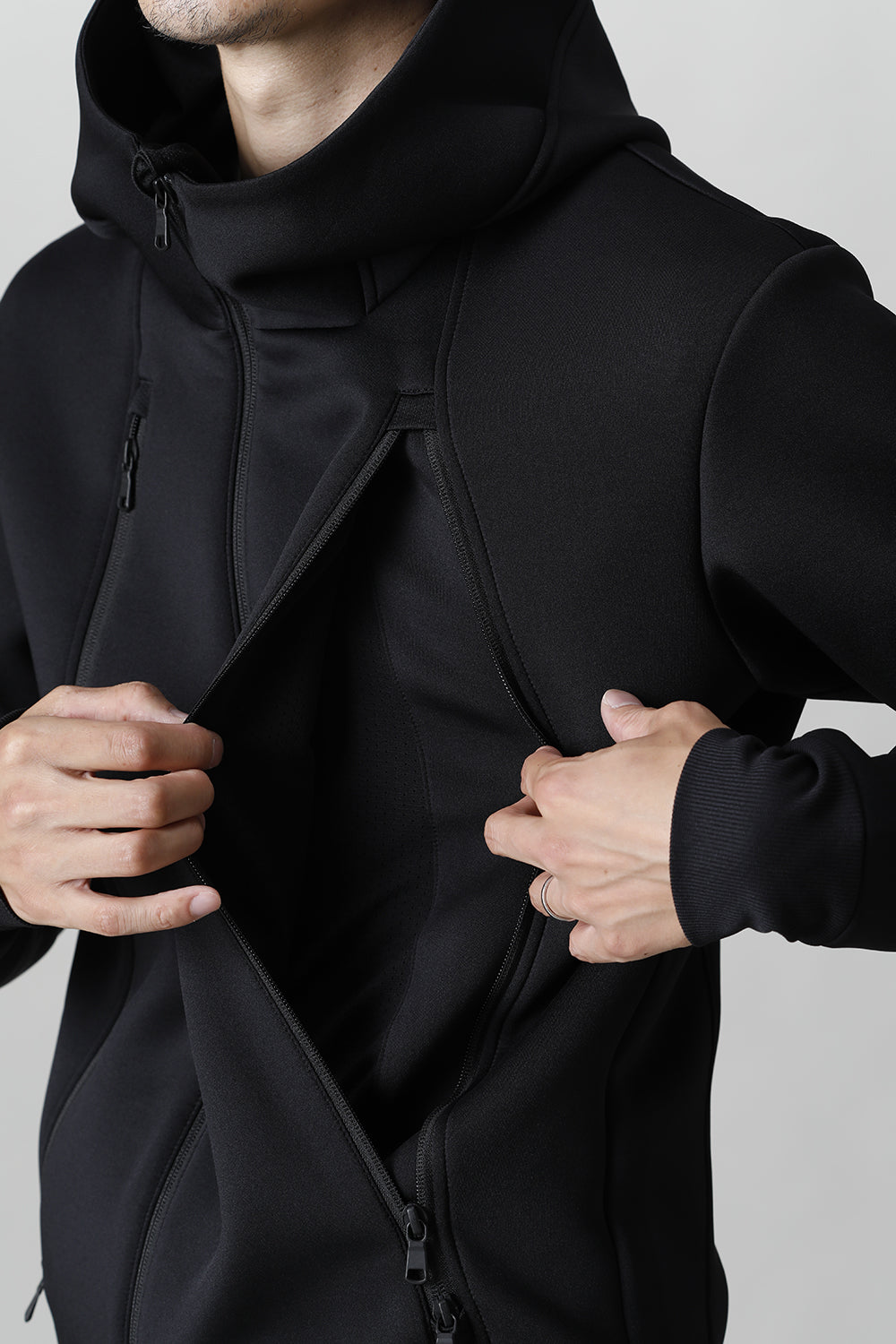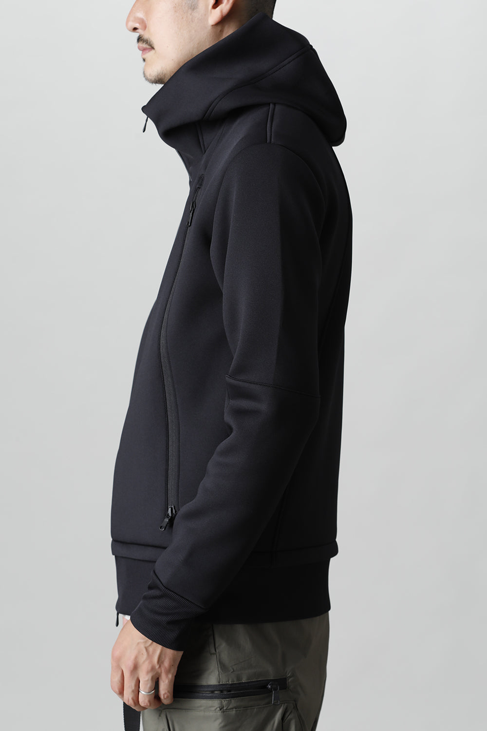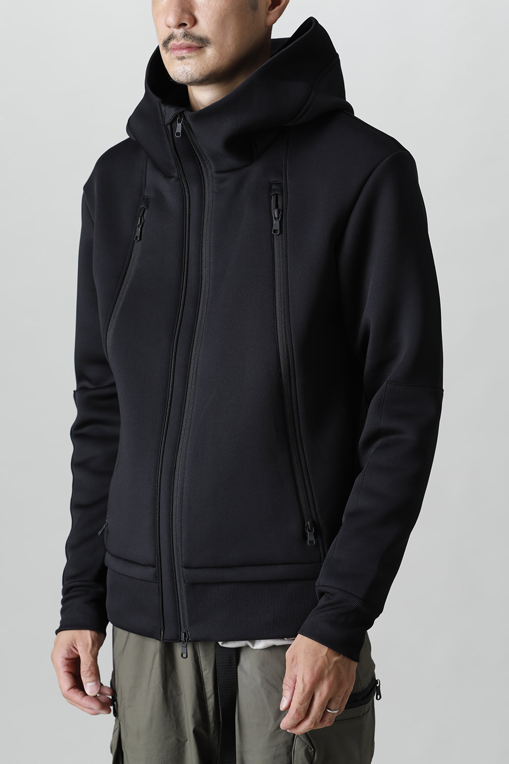 ダイバーニットジャージ素材を使用したライダースフーディ。
