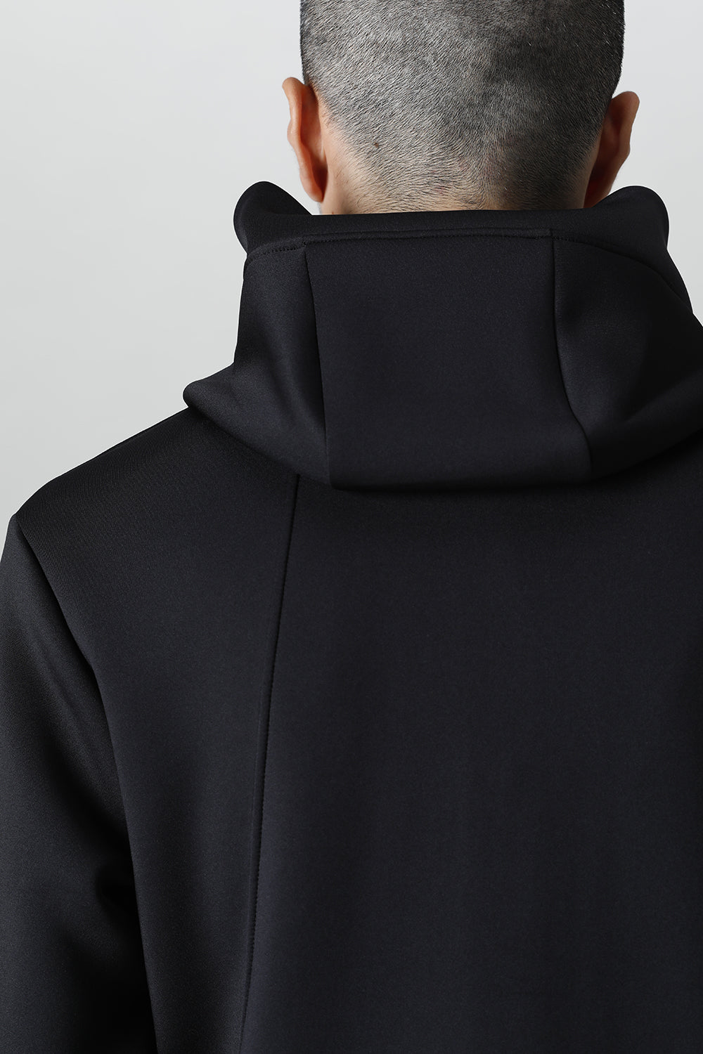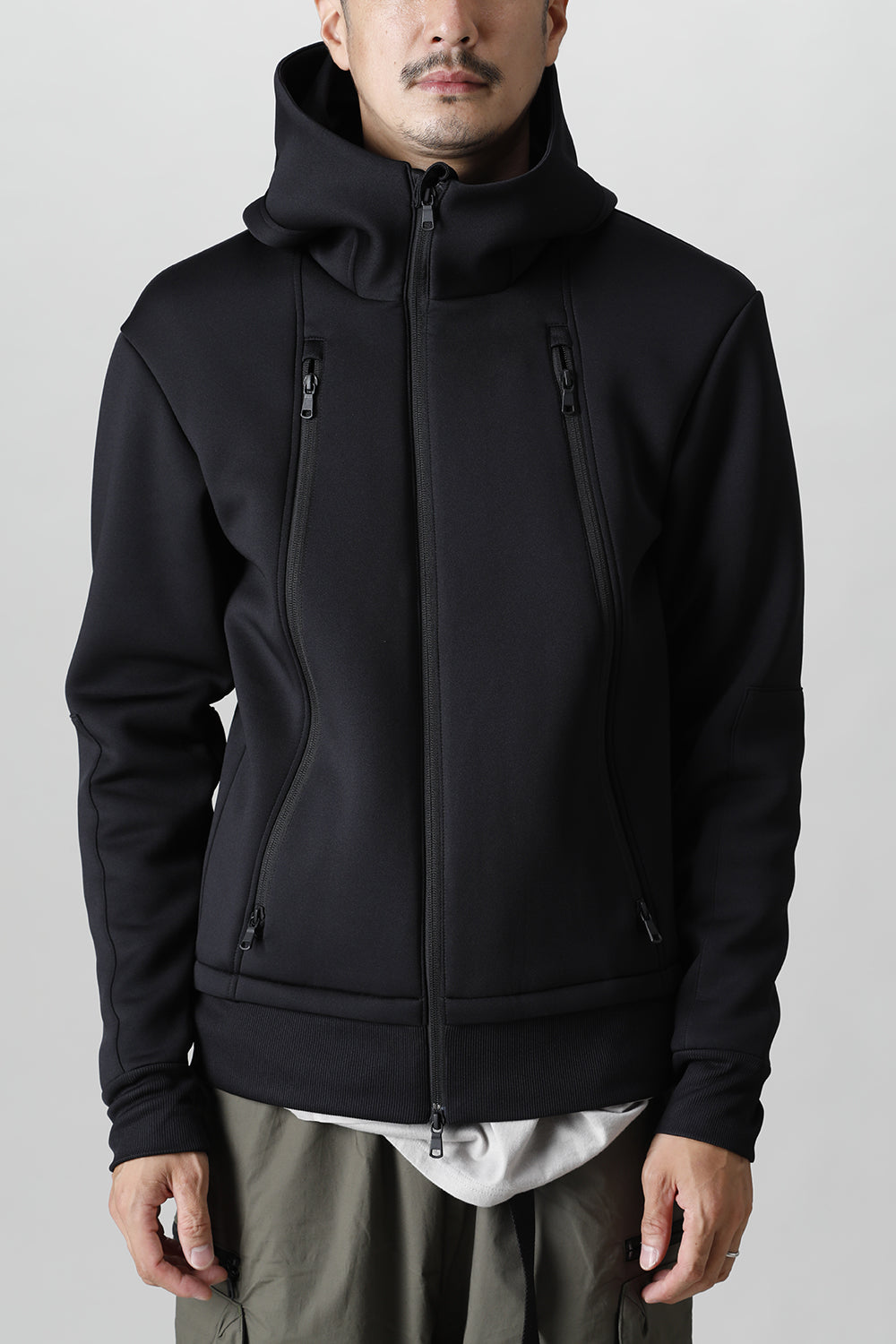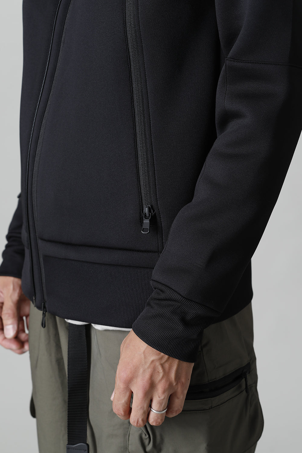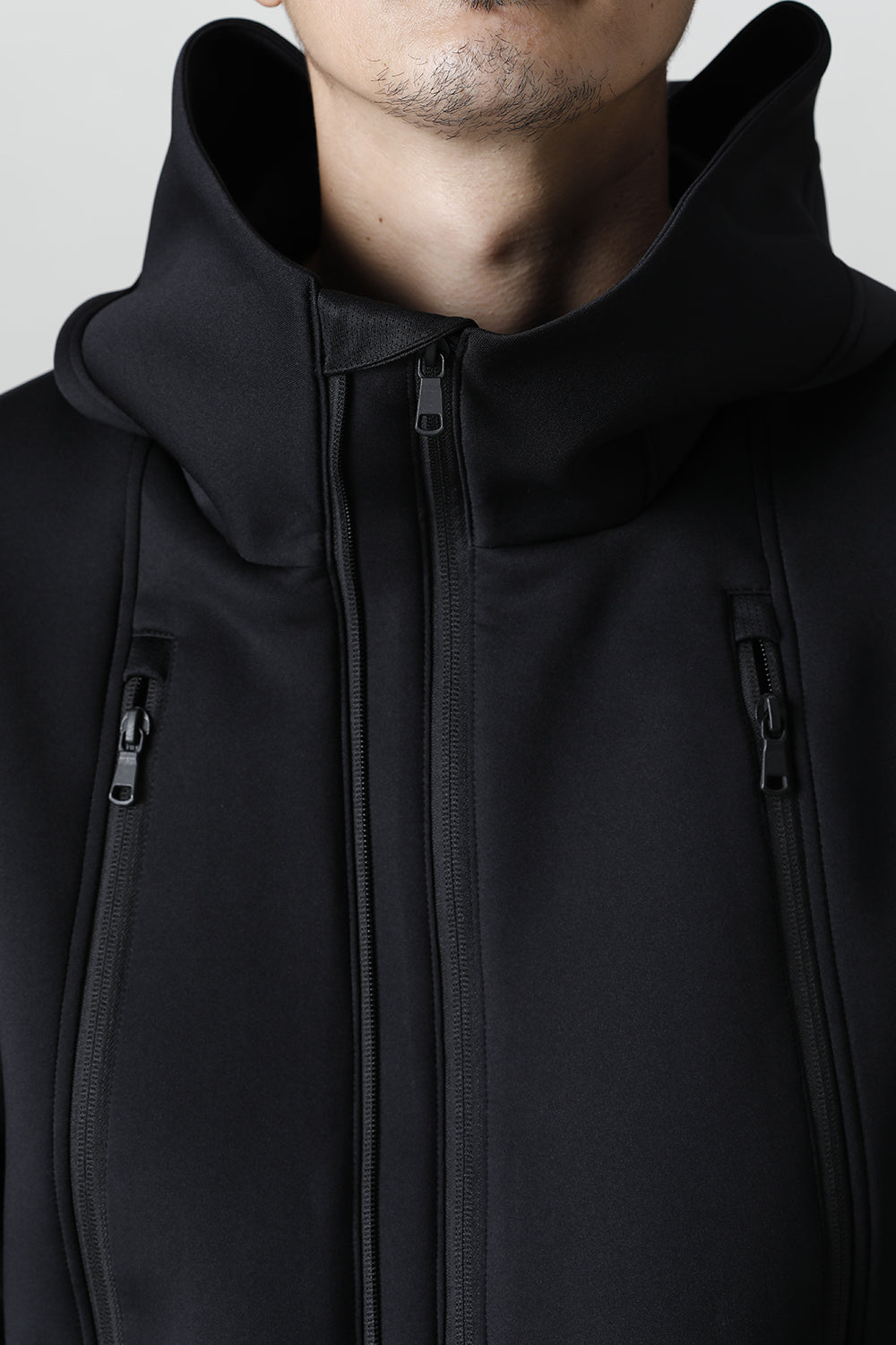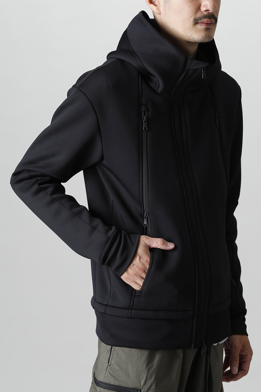 ダイバーニットジャージ素材を使用したライダースフーディ。