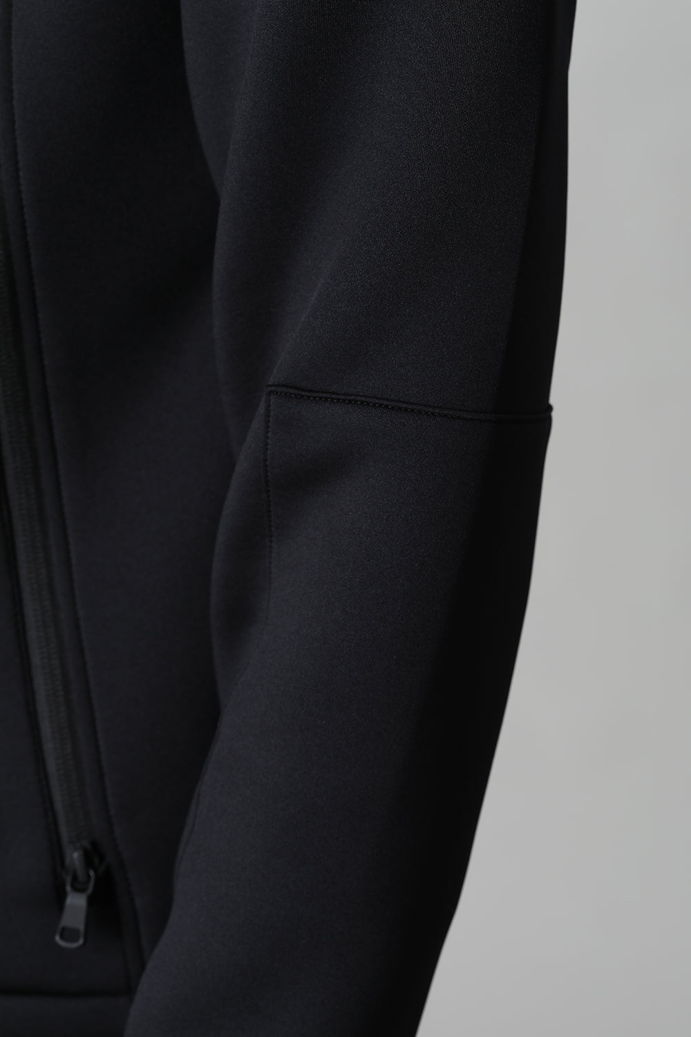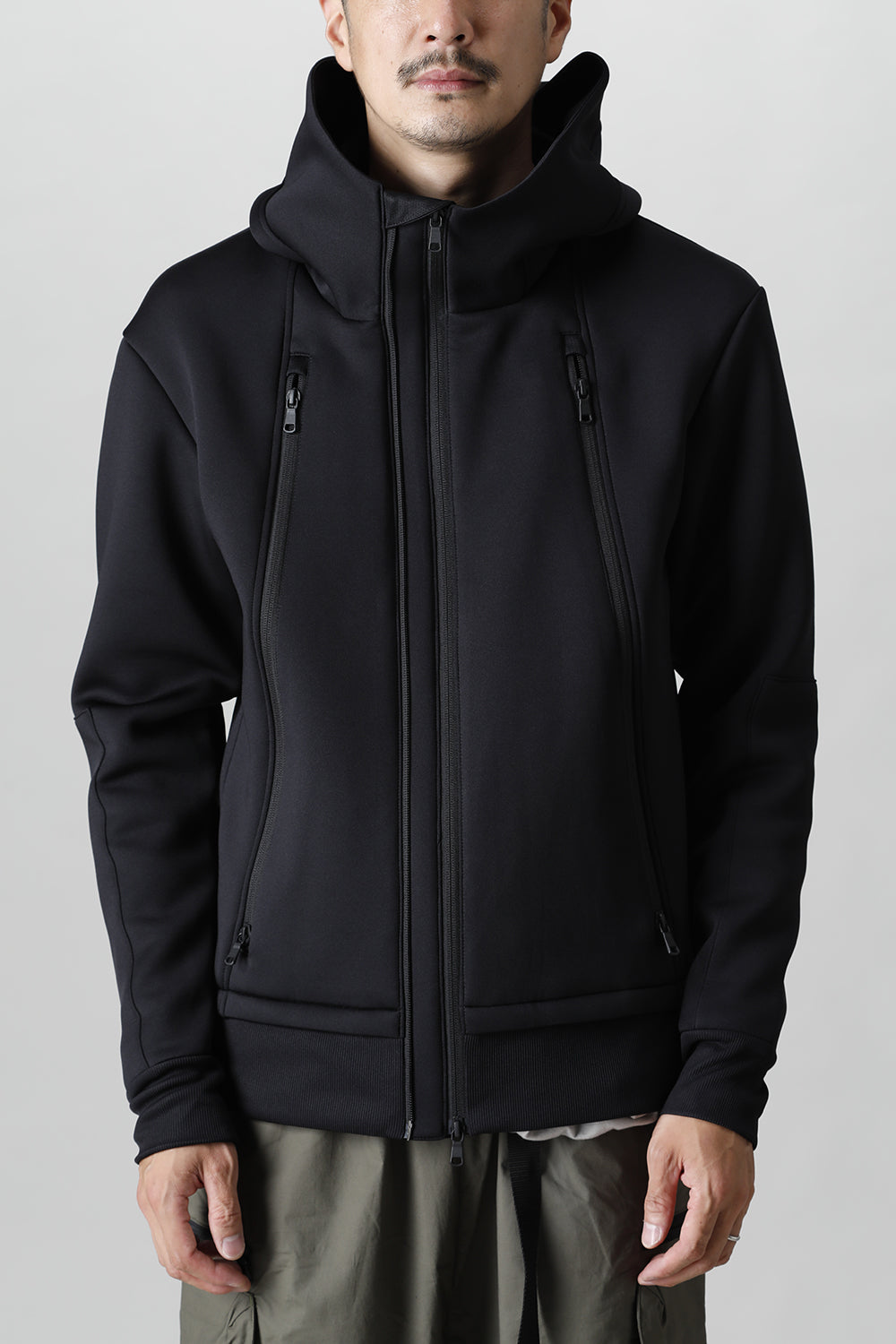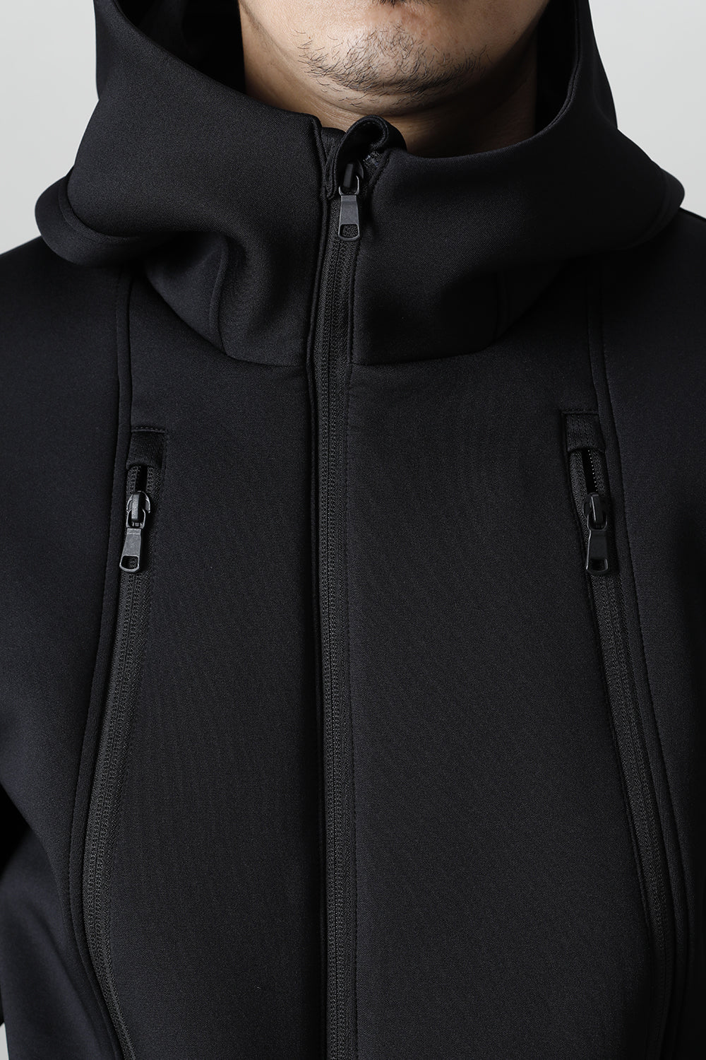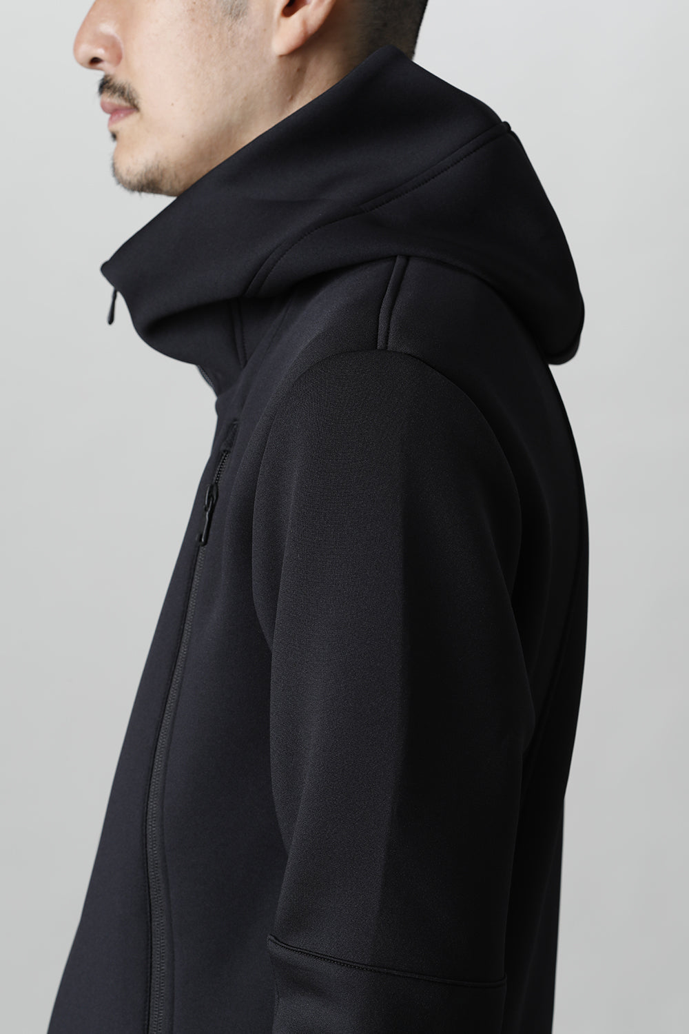 ダイバーニットジャージ素材を使用したライダースフーディ。