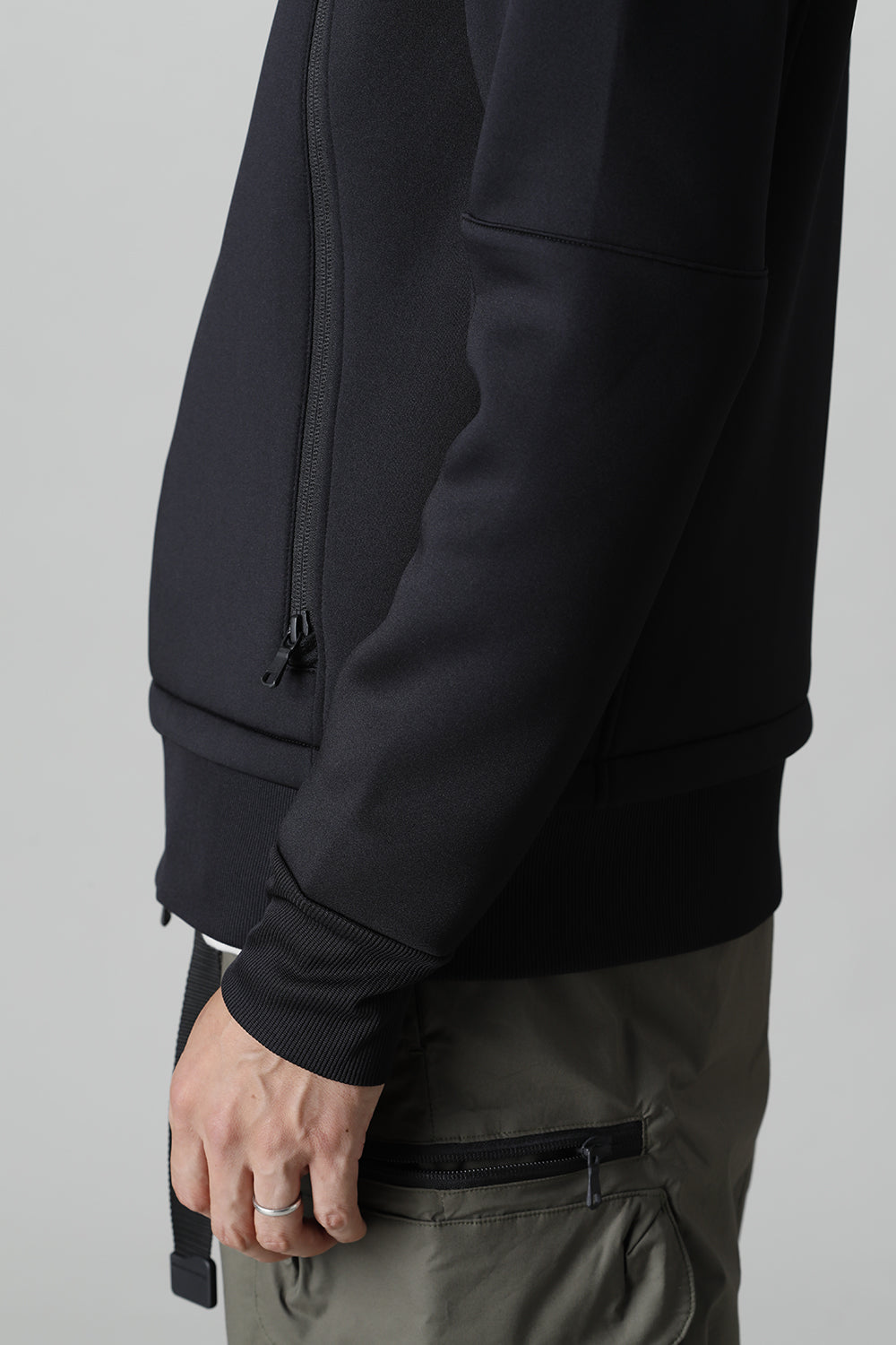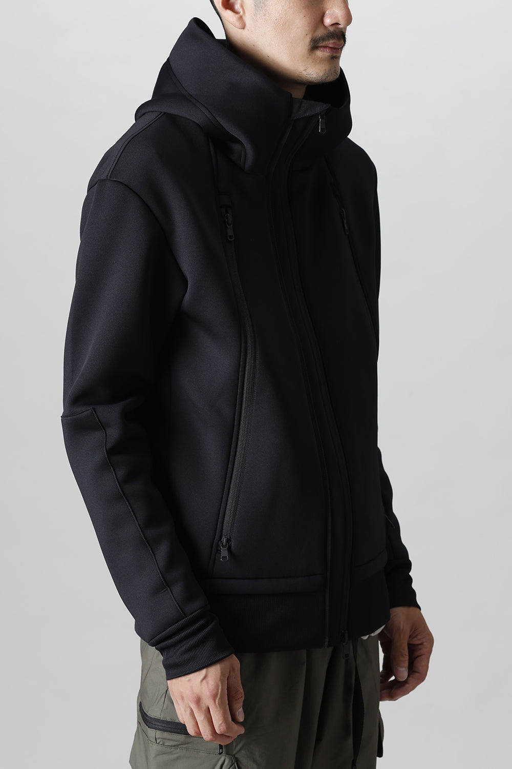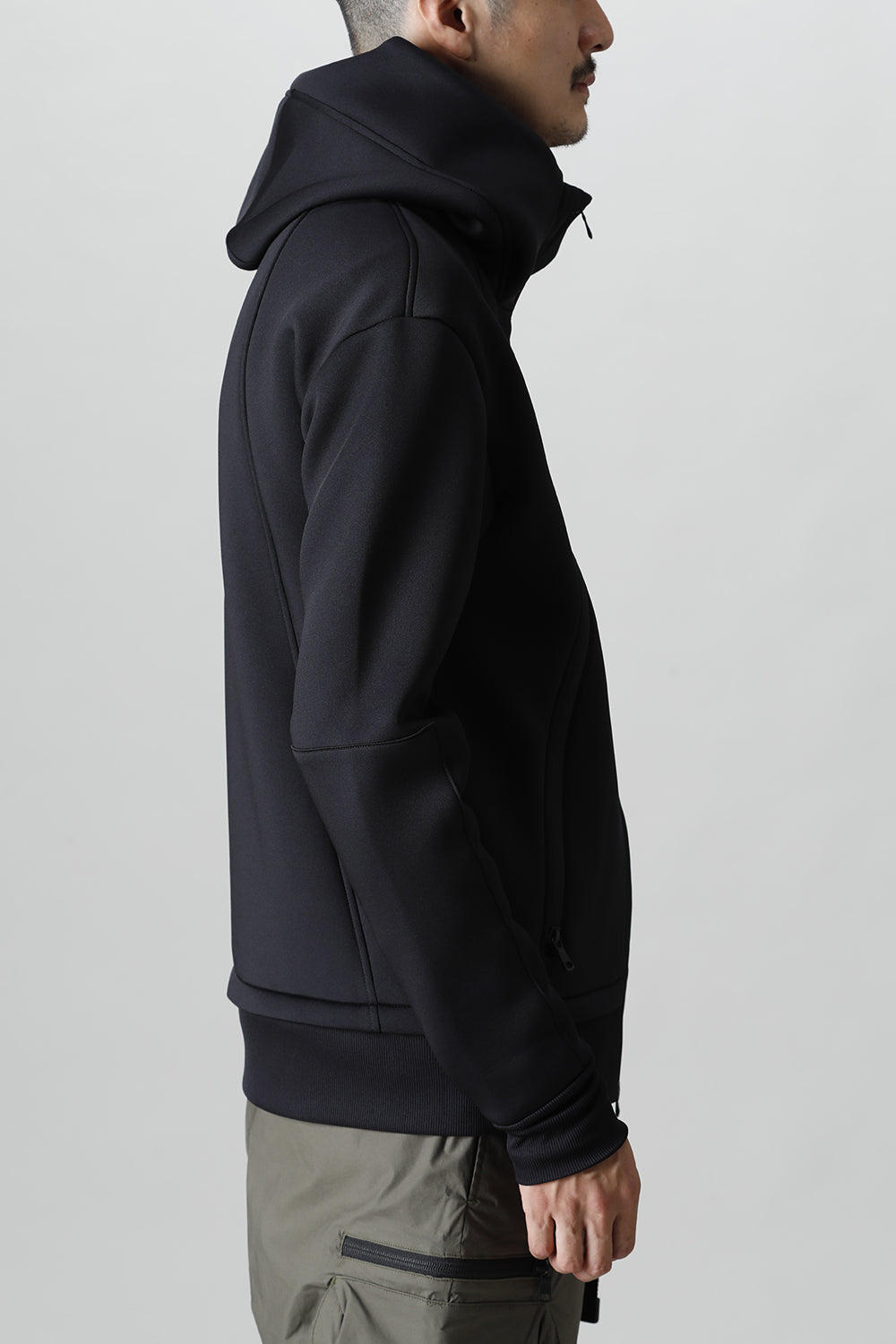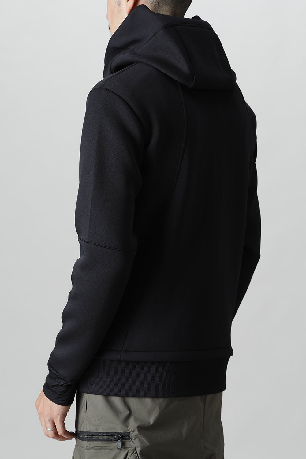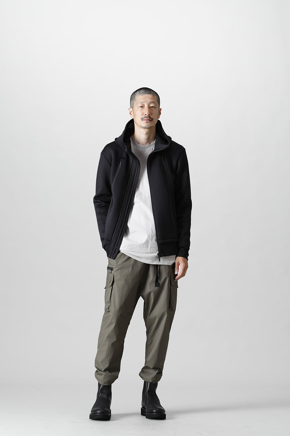 ダイバーニットジャージ素材を使用したライダースフーディ。