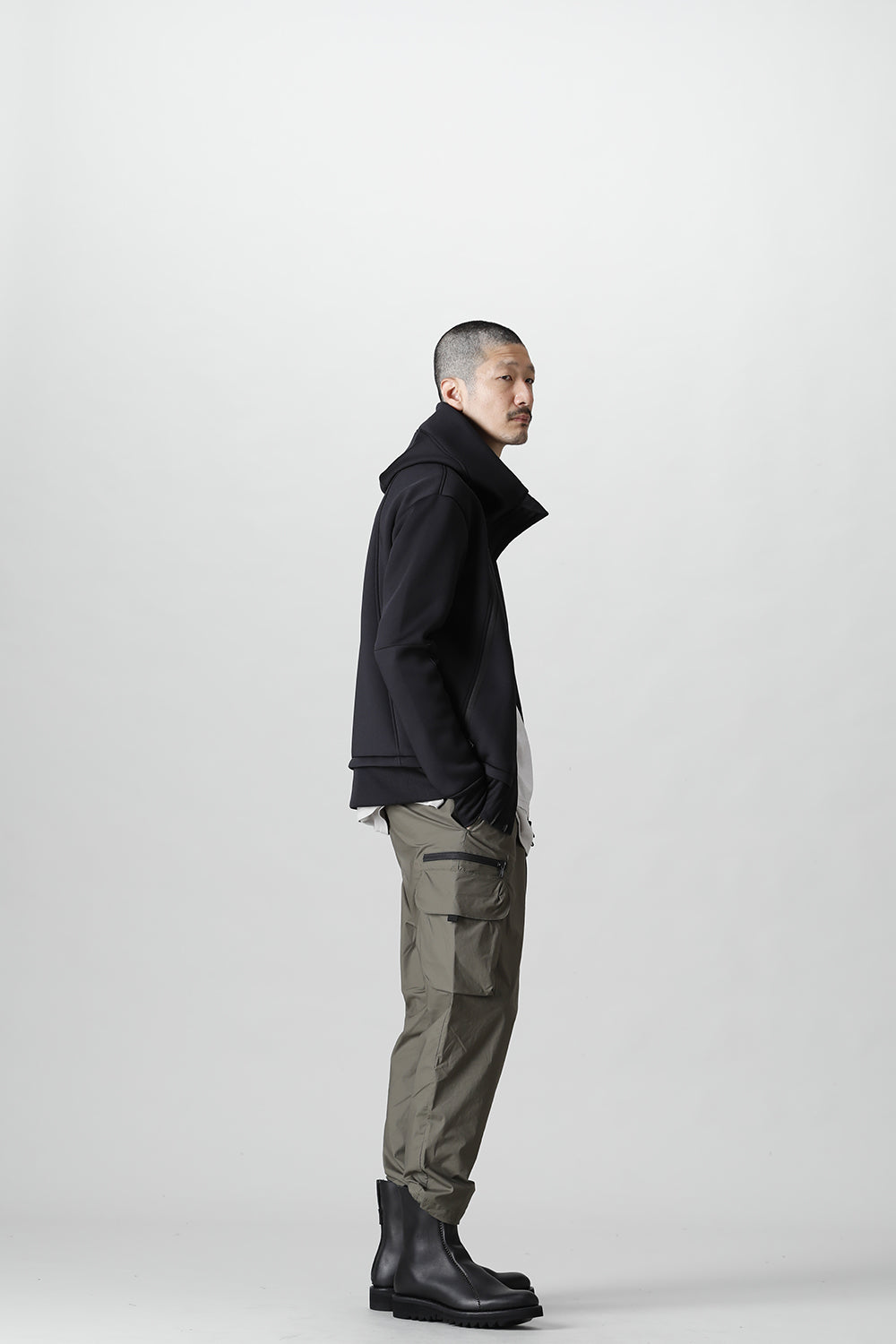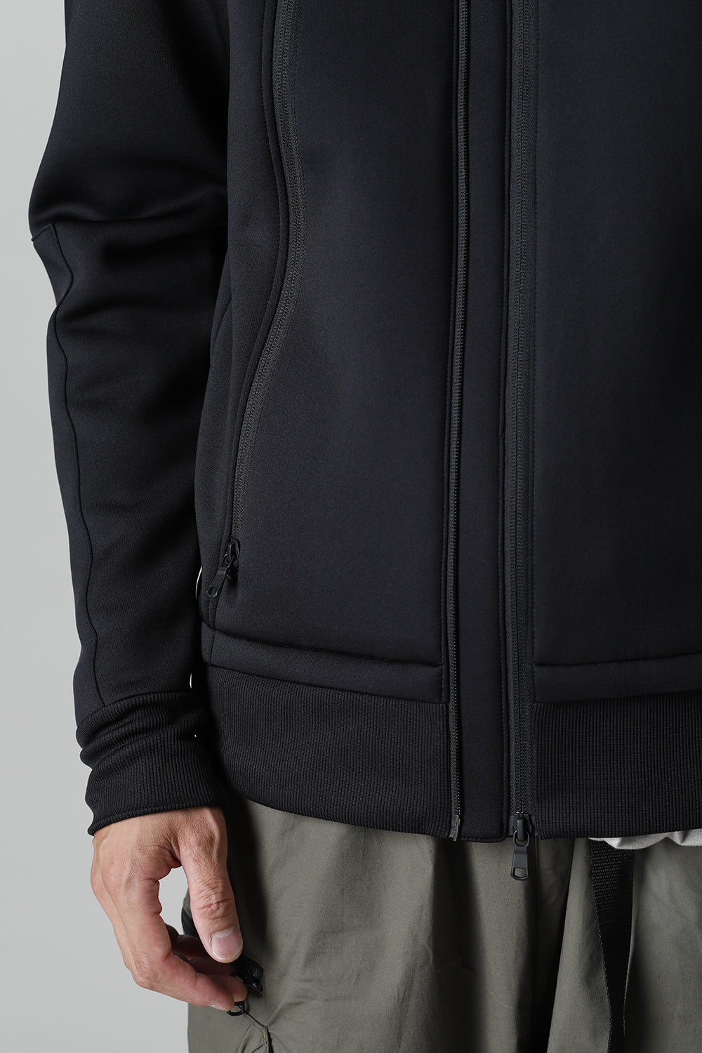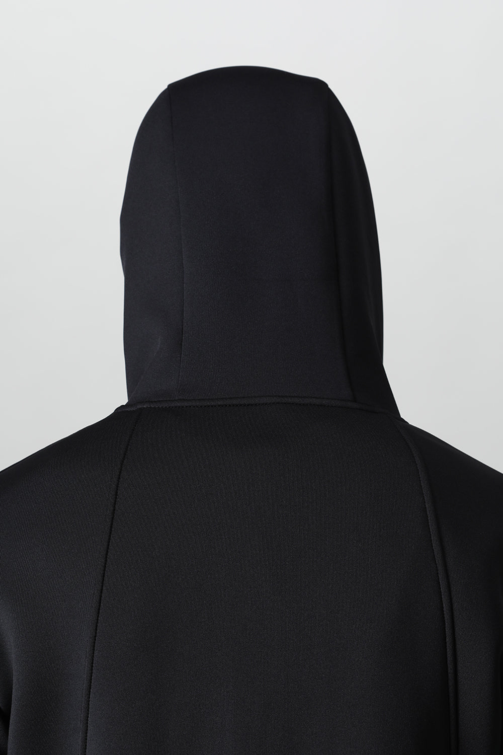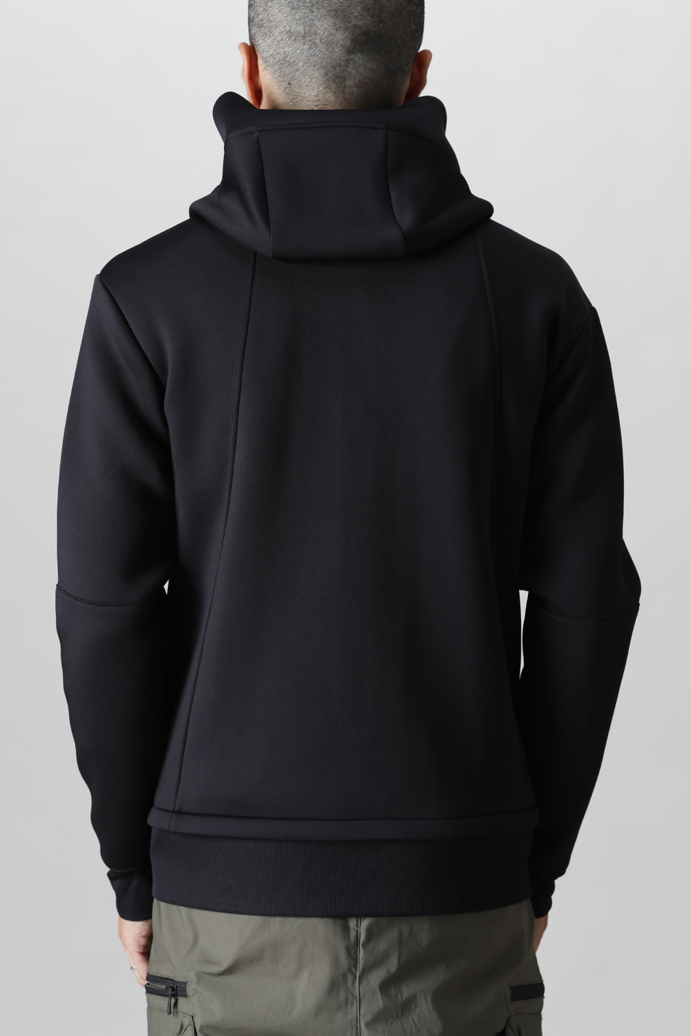 ダイバーニットジャージ素材を使用したライダースフーディ。