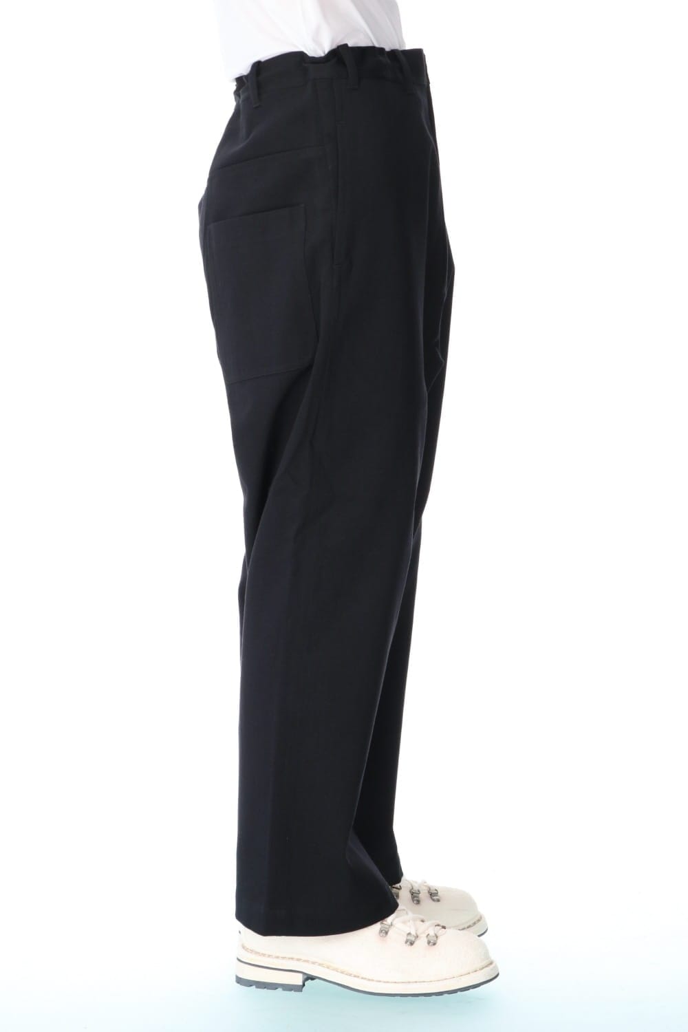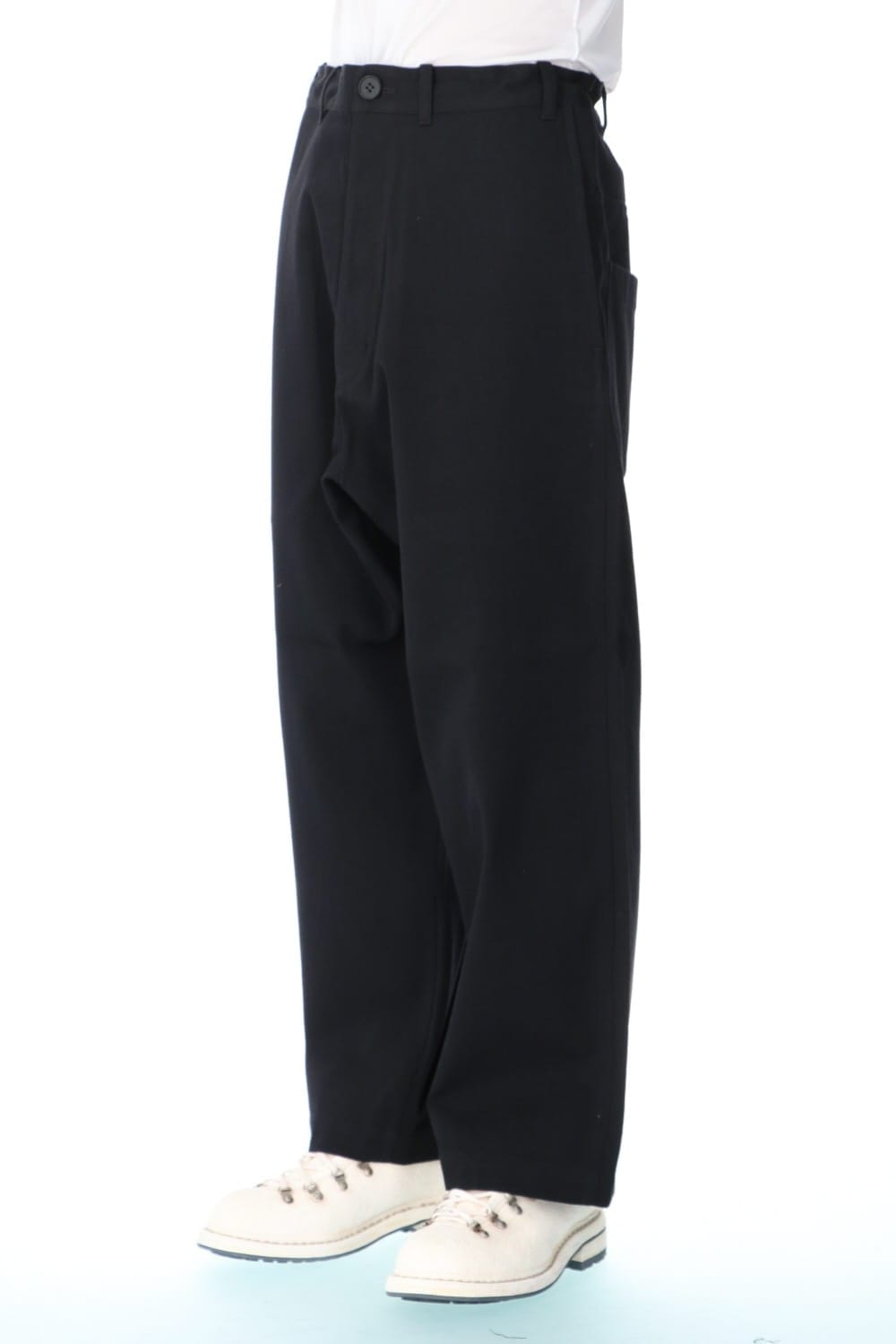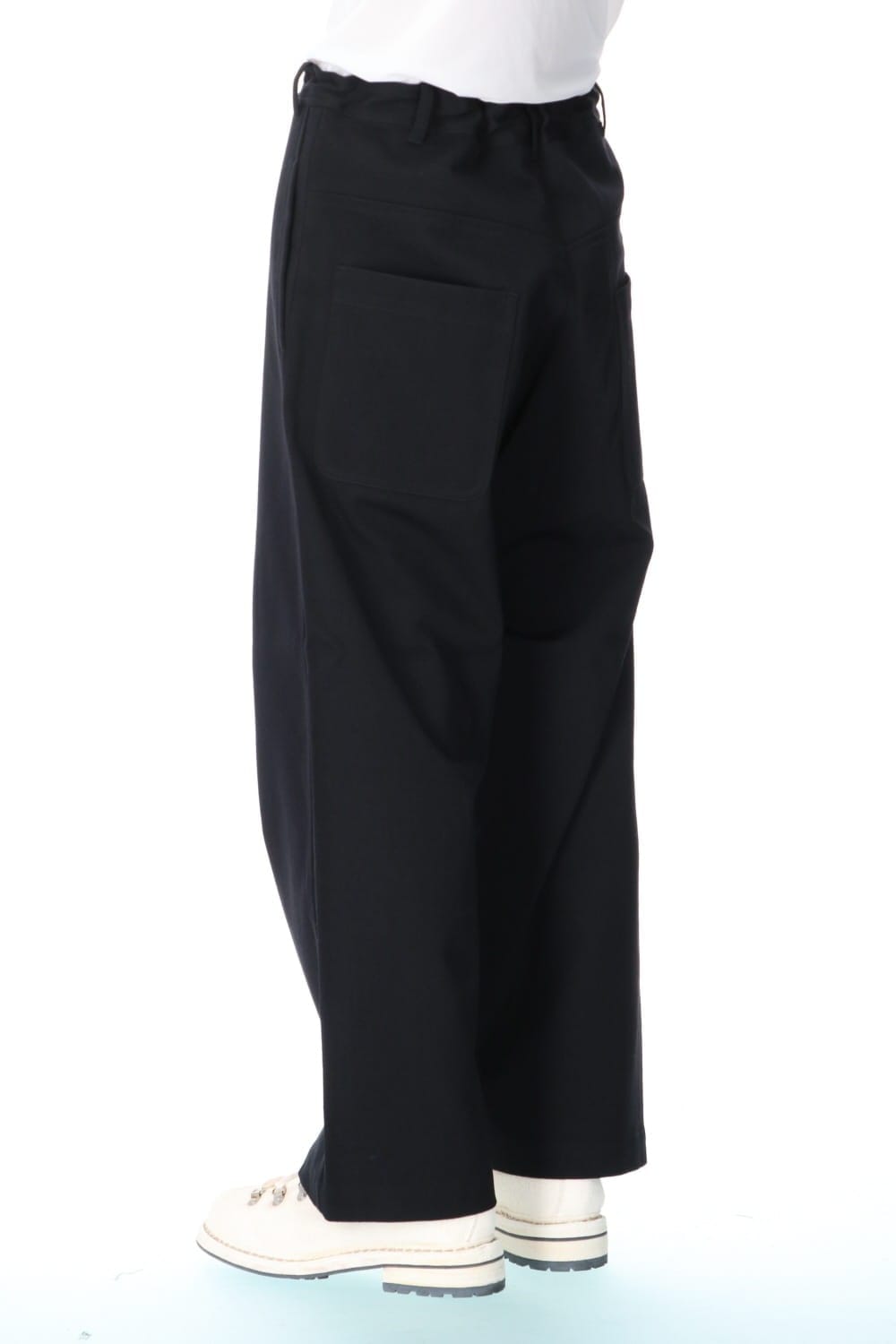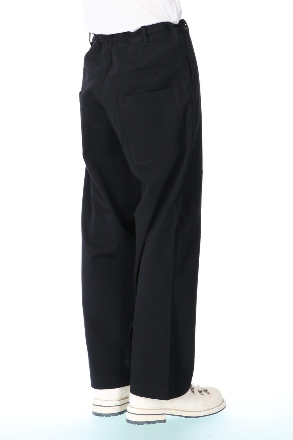 メインラインであるJAN-JAN VAN ESSCHEで展開されているウーズフィットデニムを原型としたワイドシルエットパンツに近い形状で制作されたワイドパンツ。 生地はウールコットンのギャバジン を仕様しており、しっかりとした厚みとハリがあります。