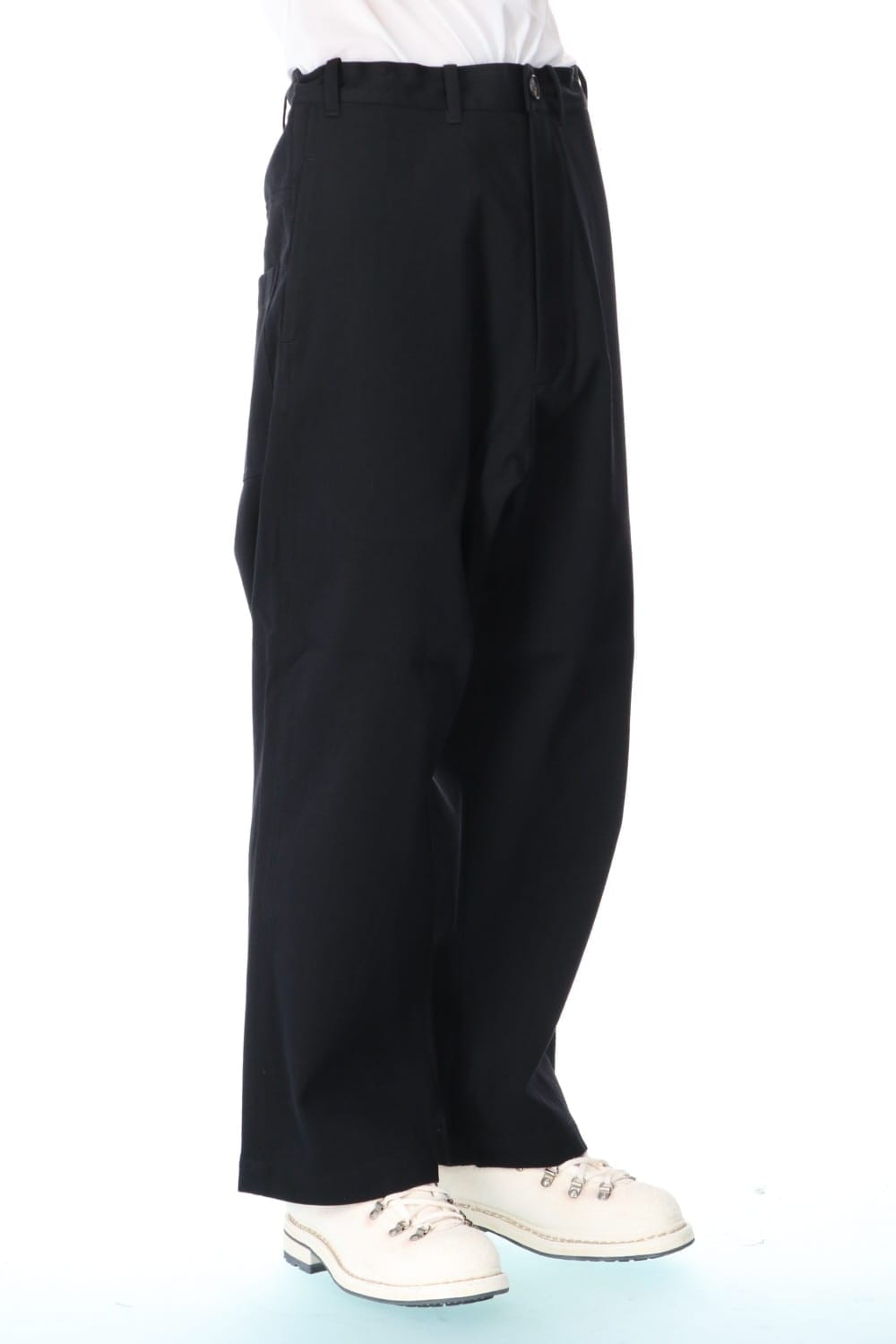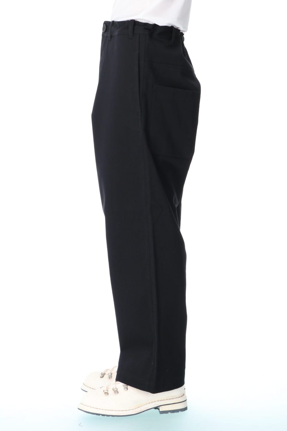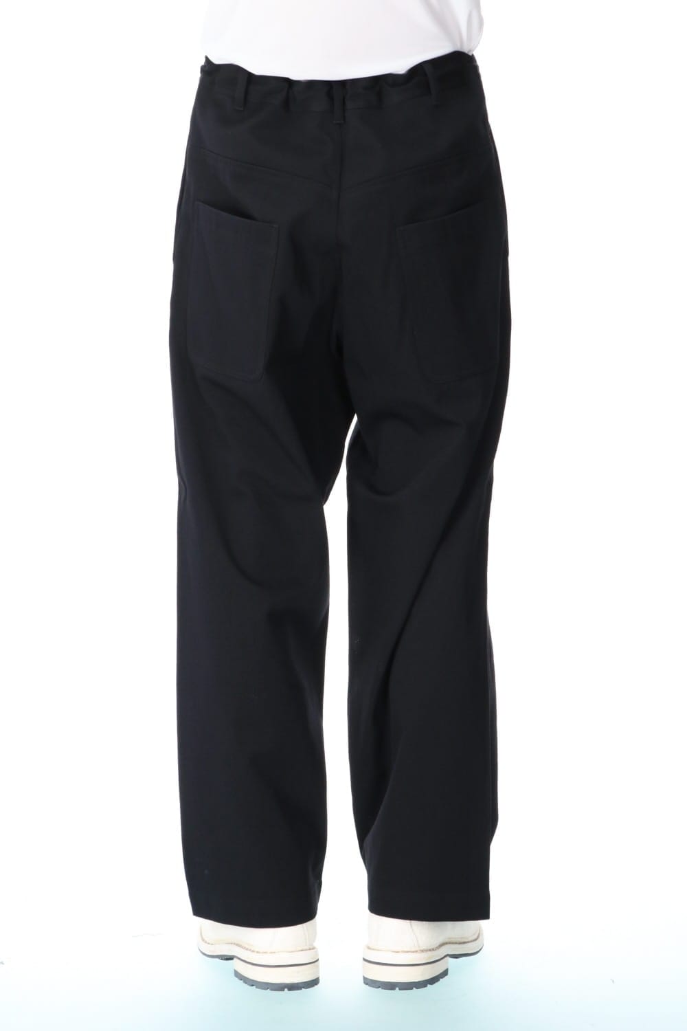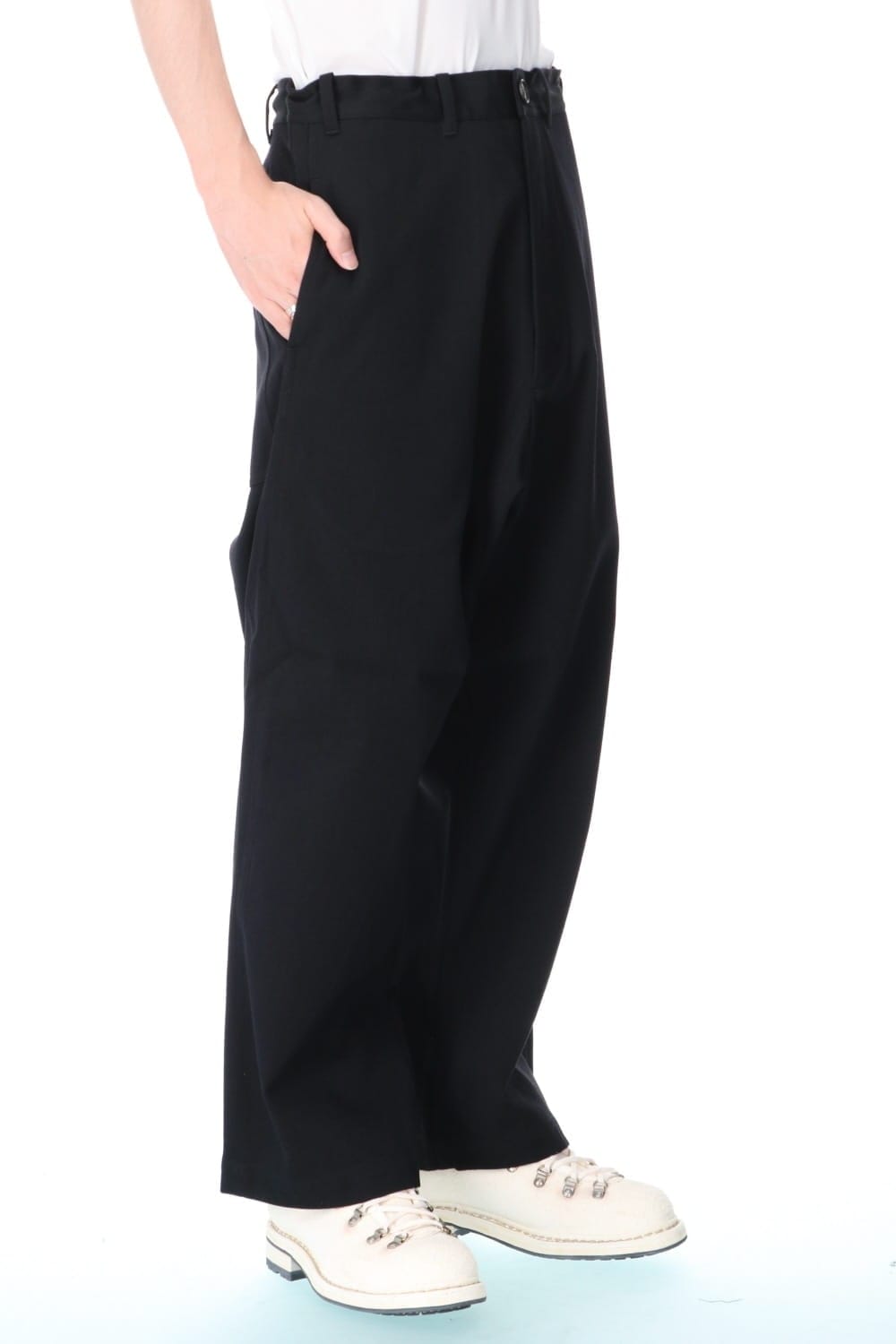 メインラインであるJAN-JAN VAN ESSCHEで展開されているウーズフィットデニムを原型としたワイドシルエットパンツに近い形状で制作されたワイドパンツ。 生地はウールコットンのギャバジン を仕様しており、しっかりとした厚みとハリがあります。