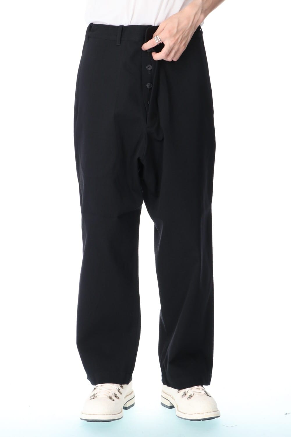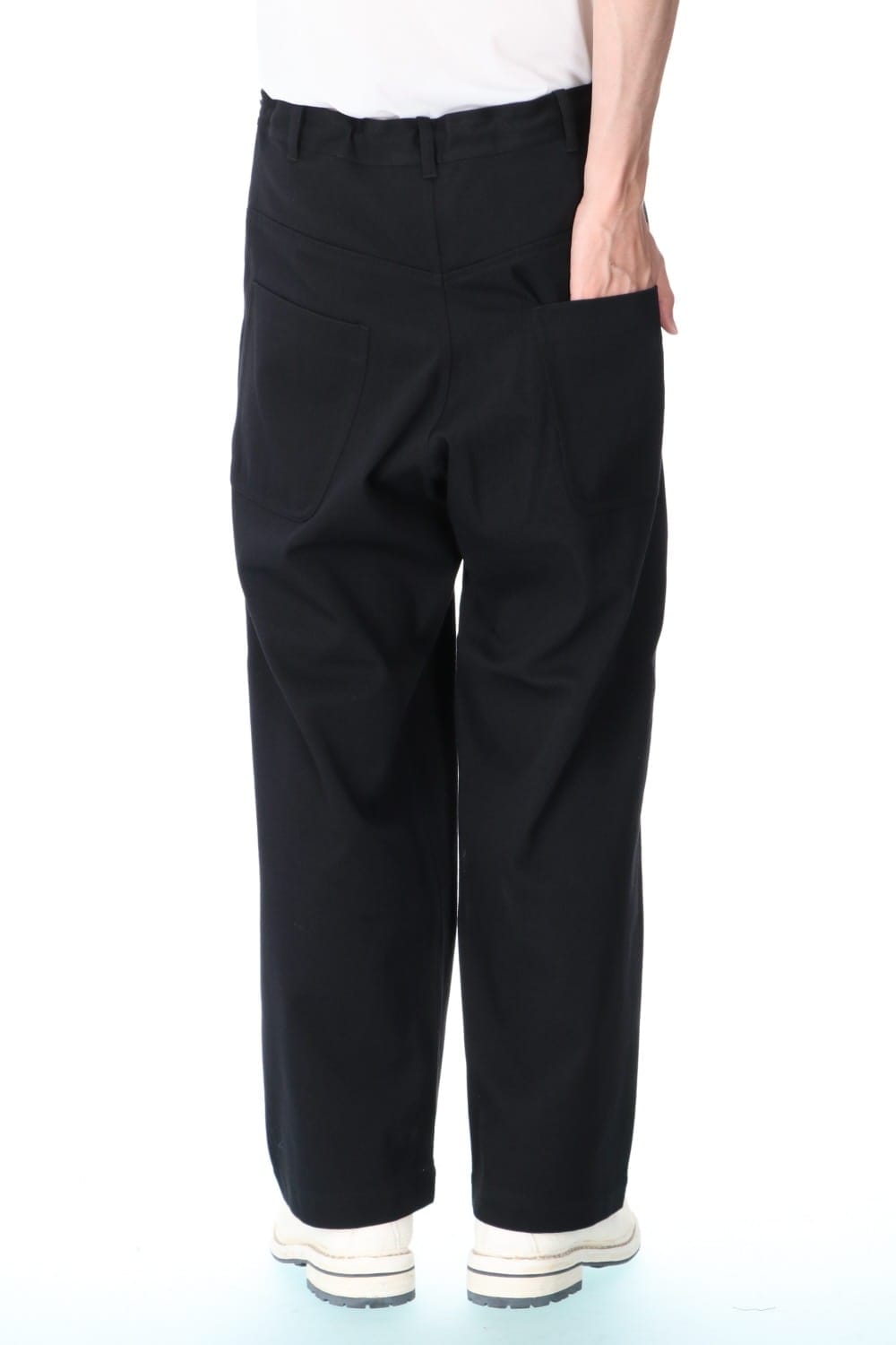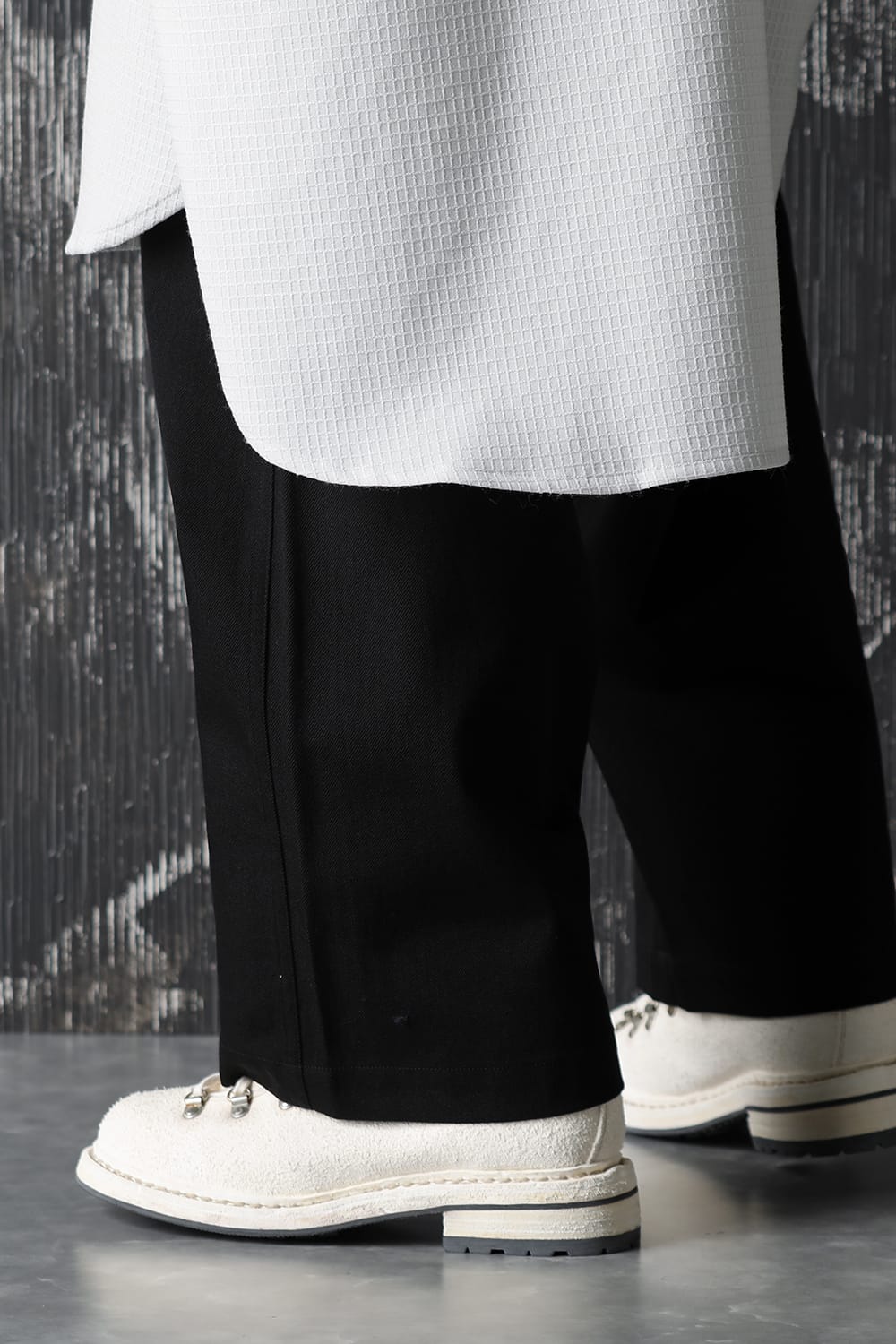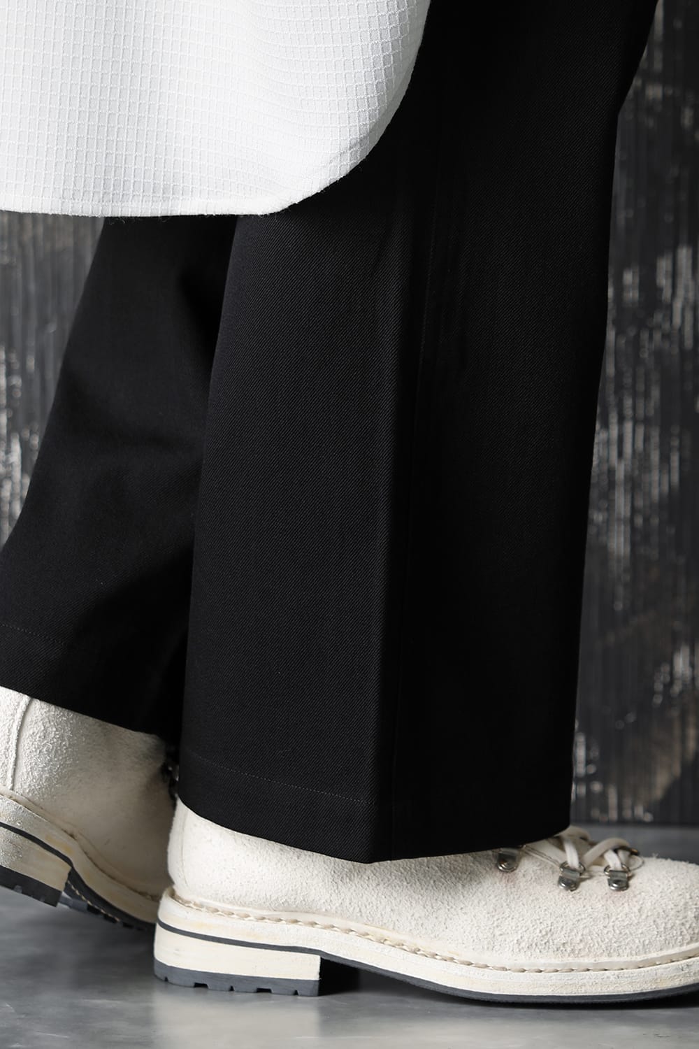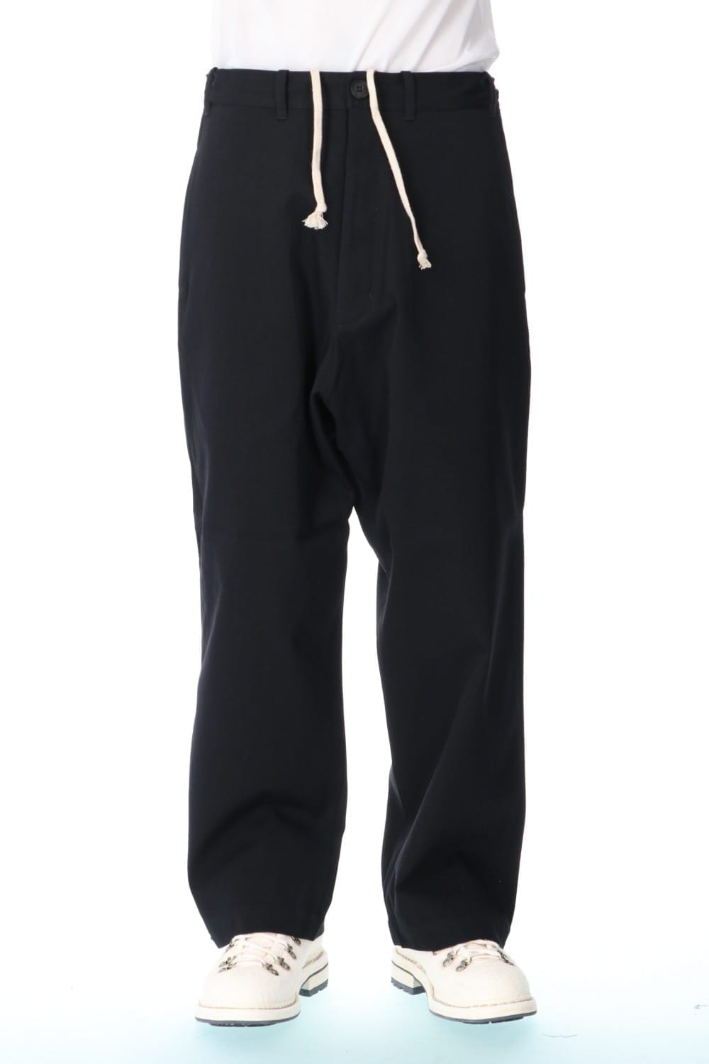 メインラインであるJAN-JAN VAN ESSCHEで展開されているウーズフィットデニムを原型としたワイドシルエットパンツに近い形状で制作されたワイドパンツ。 生地はウールコットンのギャバジン を仕様しており、しっかりとした厚みとハリがあります。