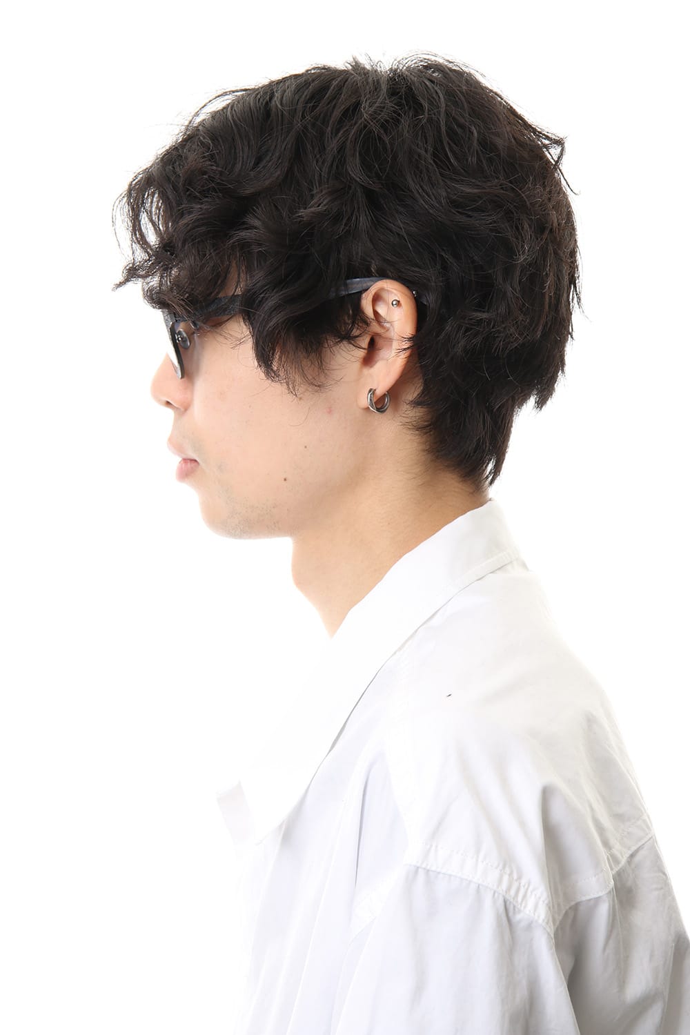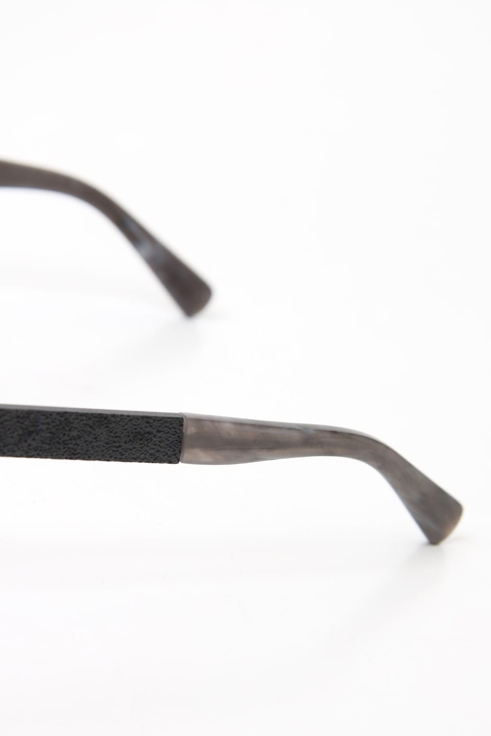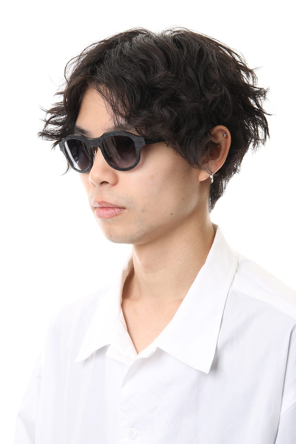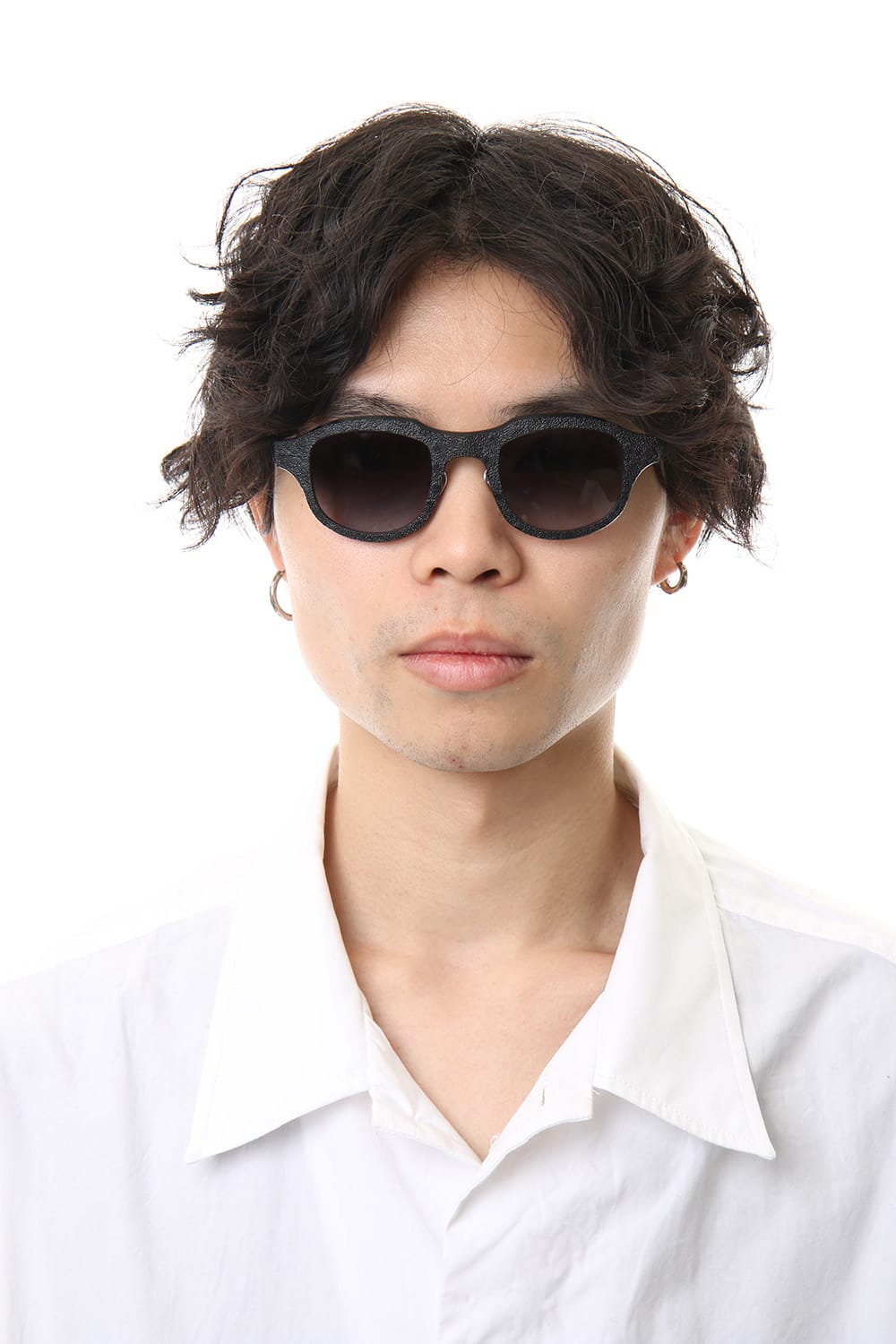 表面を火であぶったようなテクスチャのアルミ素材を使ったボストン型のアイウェア。 非常に軽量で優しい使い心地です。 上部を太くしたフレームは力強い印象を与え、顔まわりの印象を変えます。 デザイナー自身が手作業で行うため、その加工を視覚的に際立たせ、質感の差異を生み出しています。
