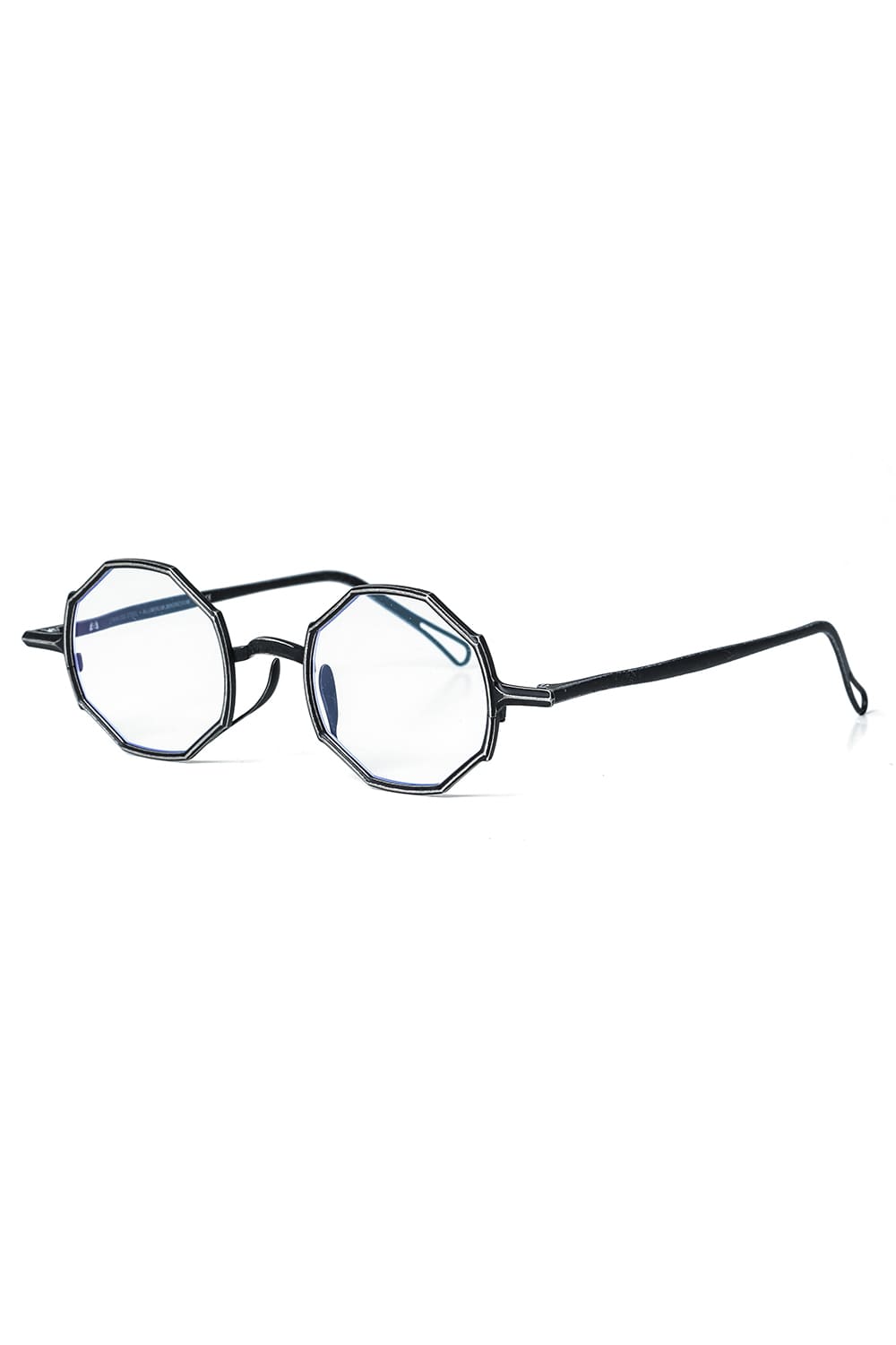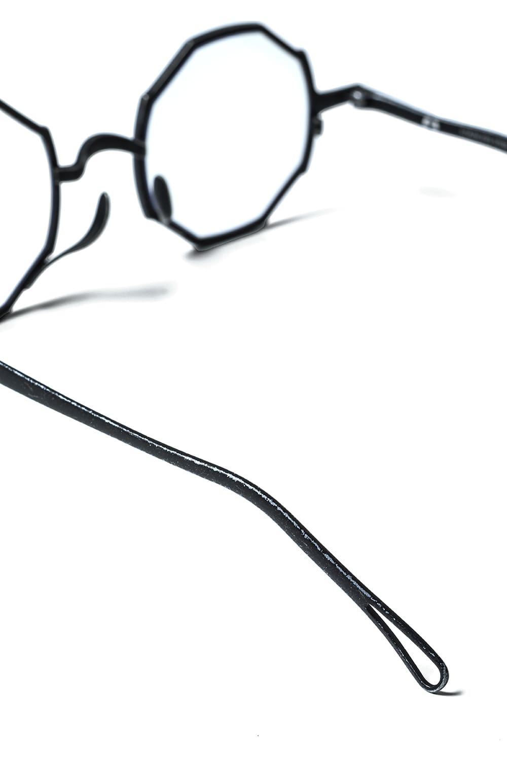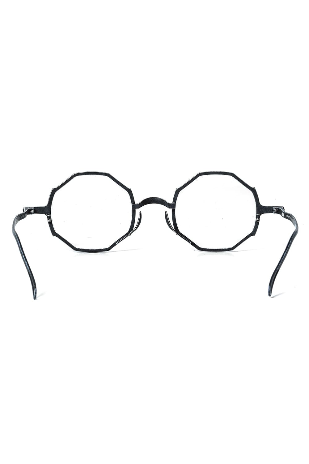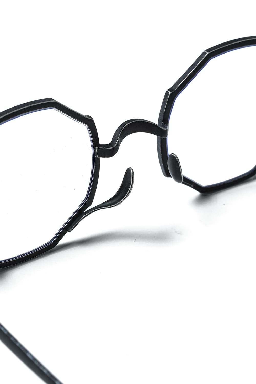 ステンレスのオクタゴンフレームが印象的なアイウェア。八角形の辺は全て直線ではなく規則性を持って少し湾曲しています。また、ブラックの塗装を施した後でエッジを研磨することでマテリアルを露出させています。それにより美しいテクスチャになりヴィンテージのような無骨な存在感を表現。使い込むことにより、ステンレス自体の輝きが徐々に現れていき、オンリーワンのアイウェアになっていくことでしょう。テンプルのパーツはアルミニウム製で軽い掛け心地です。羽根の様なノーズパッドは想像以上のフィット感があり日常的にご使用いただけます。他にレザーケースと保証書、クロスが付属しています。