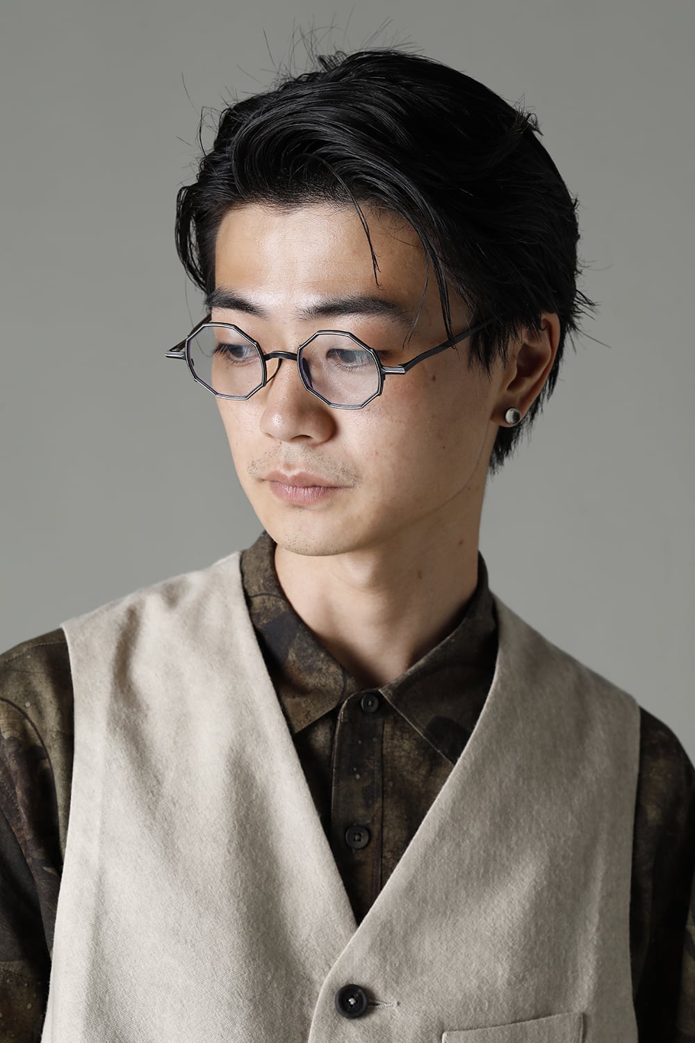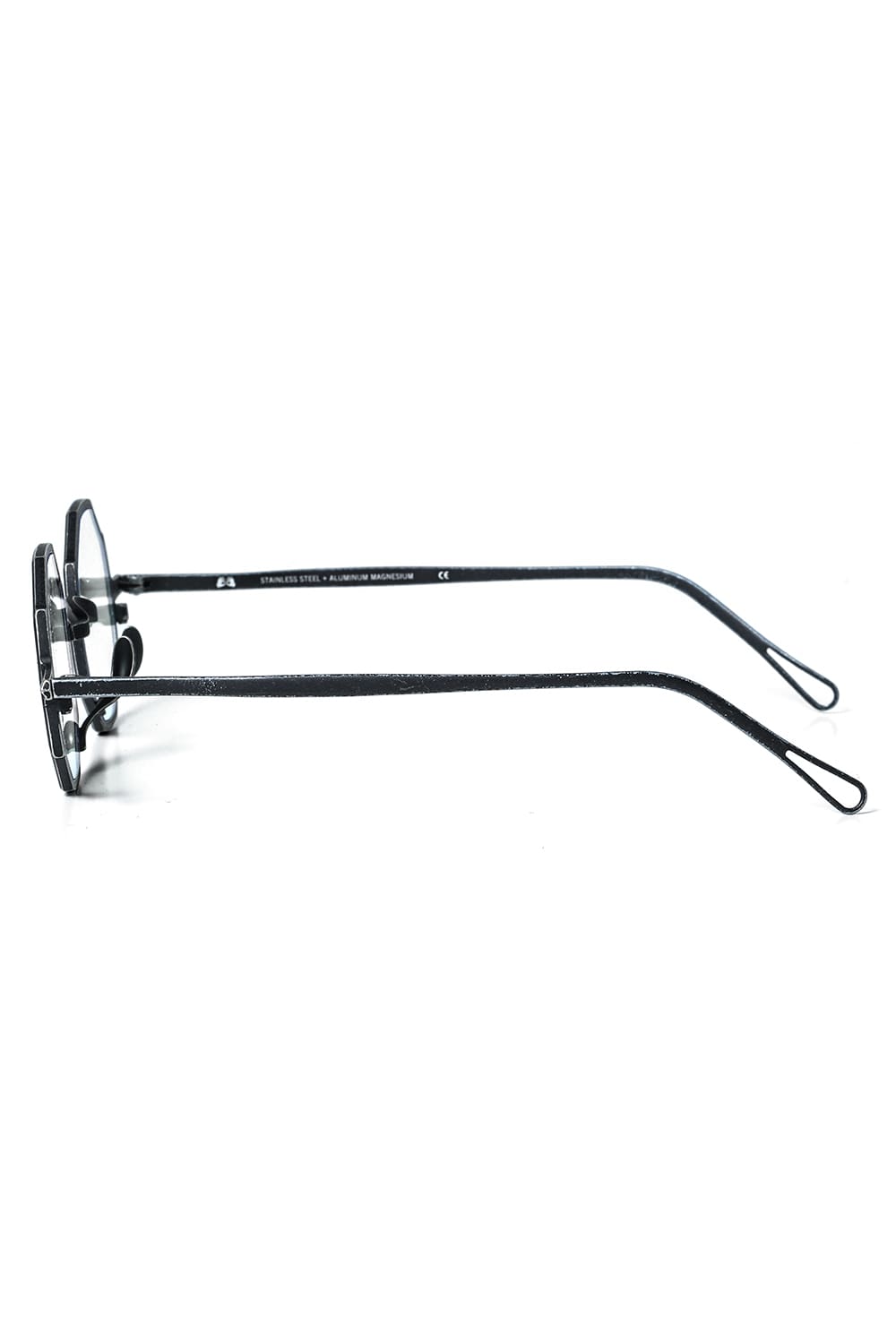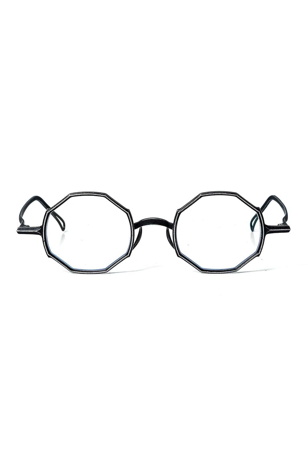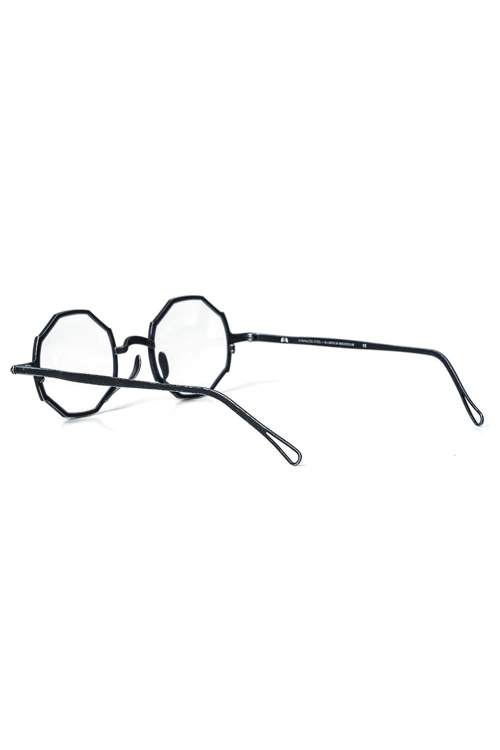 ステンレスのオクタゴンフレームが印象的なアイウェア。八角形の辺は全て直線ではなく規則性を持って少し湾曲しています。また、ブラックの塗装を施した後でエッジを研磨することでマテリアルを露出させています。それにより美しいテクスチャになりヴィンテージのような無骨な存在感を表現。使い込むことにより、ステンレス自体の輝きが徐々に現れていき、オンリーワンのアイウェアになっていくことでしょう。テンプルのパーツはアルミニウム製で軽い掛け心地です。羽根の様なノーズパッドは想像以上のフィット感があり日常的にご使用いただけます。他にレザーケースと保証書、クロスが付属しています。