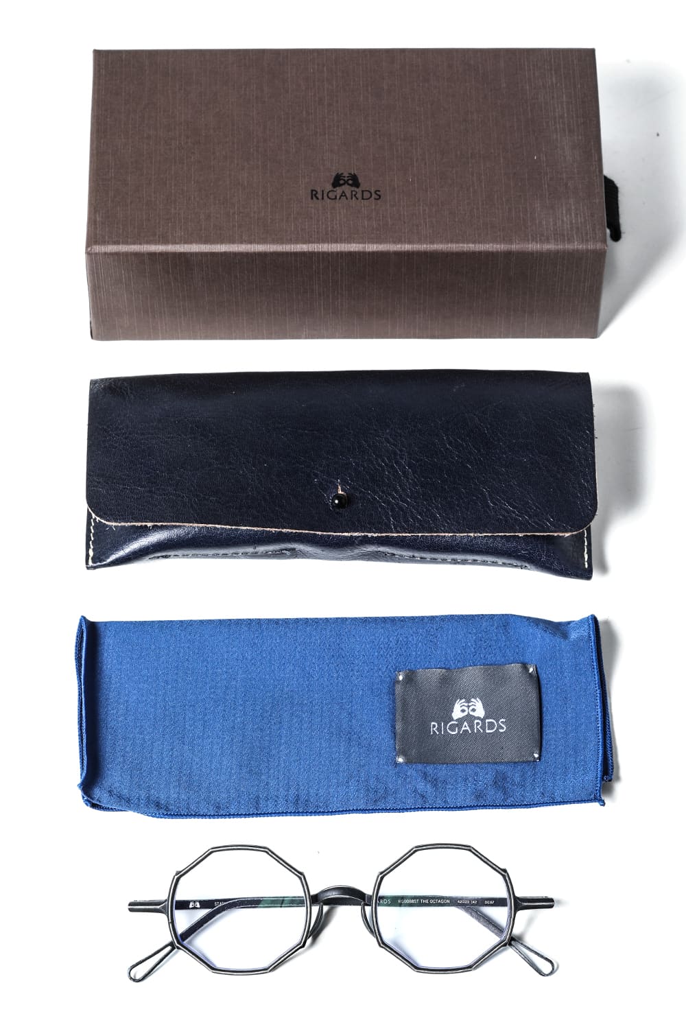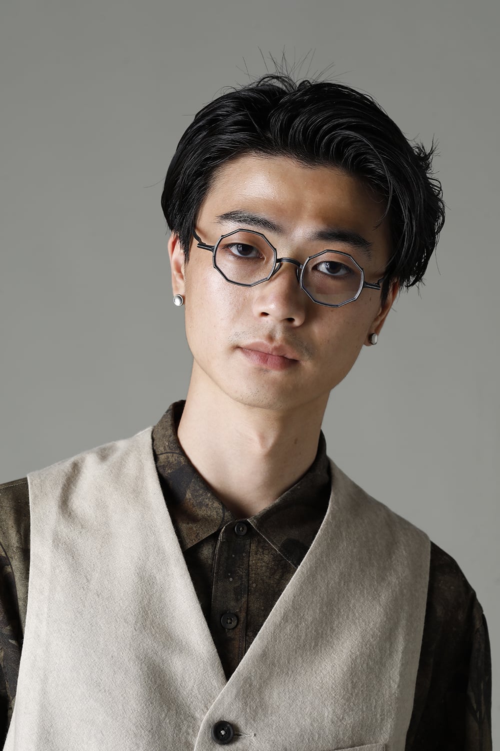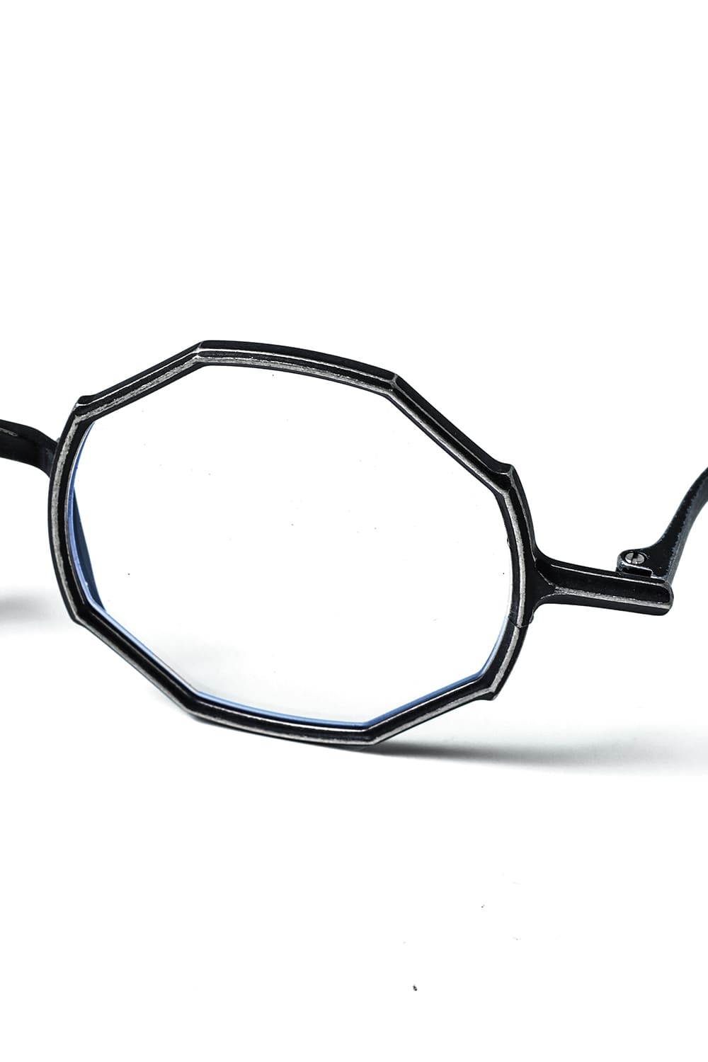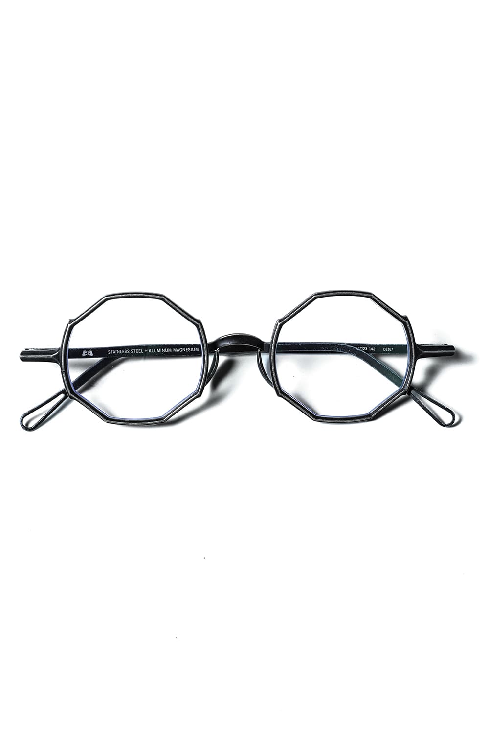 ステンレスのオクタゴンフレームが印象的なアイウェア。八角形の辺は全て直線ではなく規則性を持って少し湾曲しています。また、ブラックの塗装を施した後でエッジを研磨することでマテリアルを露出させています。それにより美しいテクスチャになりヴィンテージのような無骨な存在感を表現。使い込むことにより、ステンレス自体の輝きが徐々に現れていき、オンリーワンのアイウェアになっていくことでしょう。テンプルのパーツはアルミニウム製で軽い掛け心地です。羽根の様なノーズパッドは想像以上のフィット感があり日常的にご使用いただけます。他にレザーケースと保証書、クロスが付属しています。