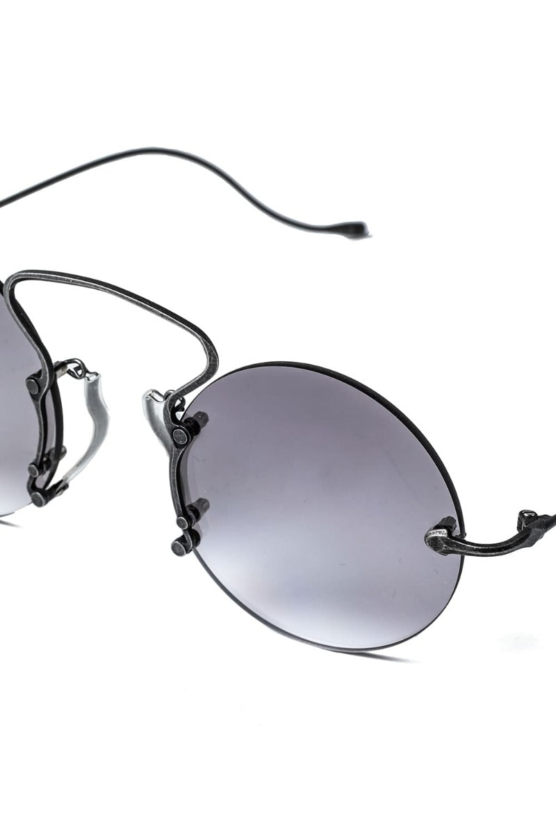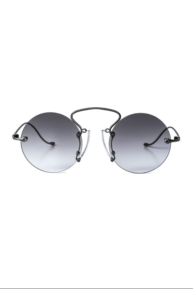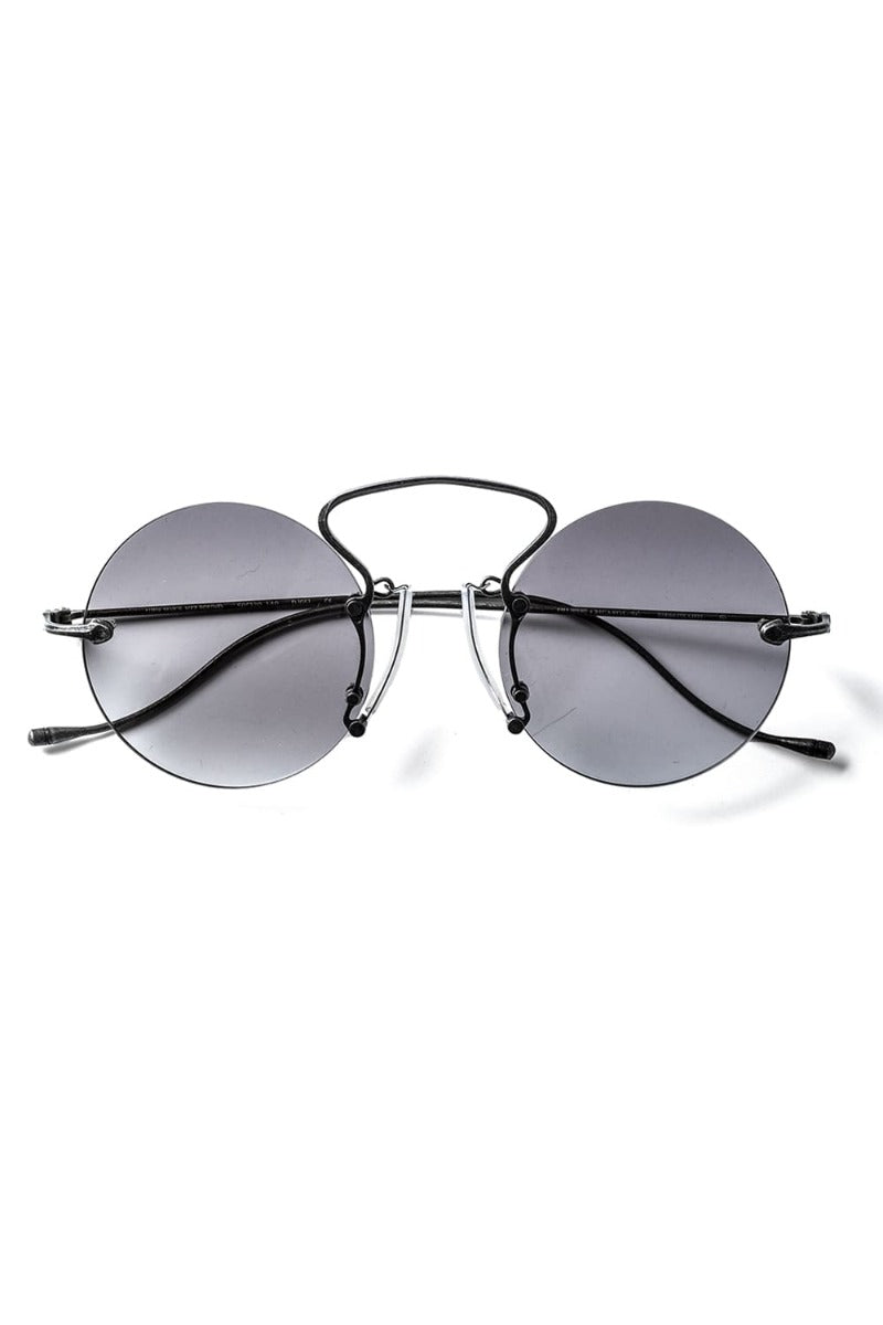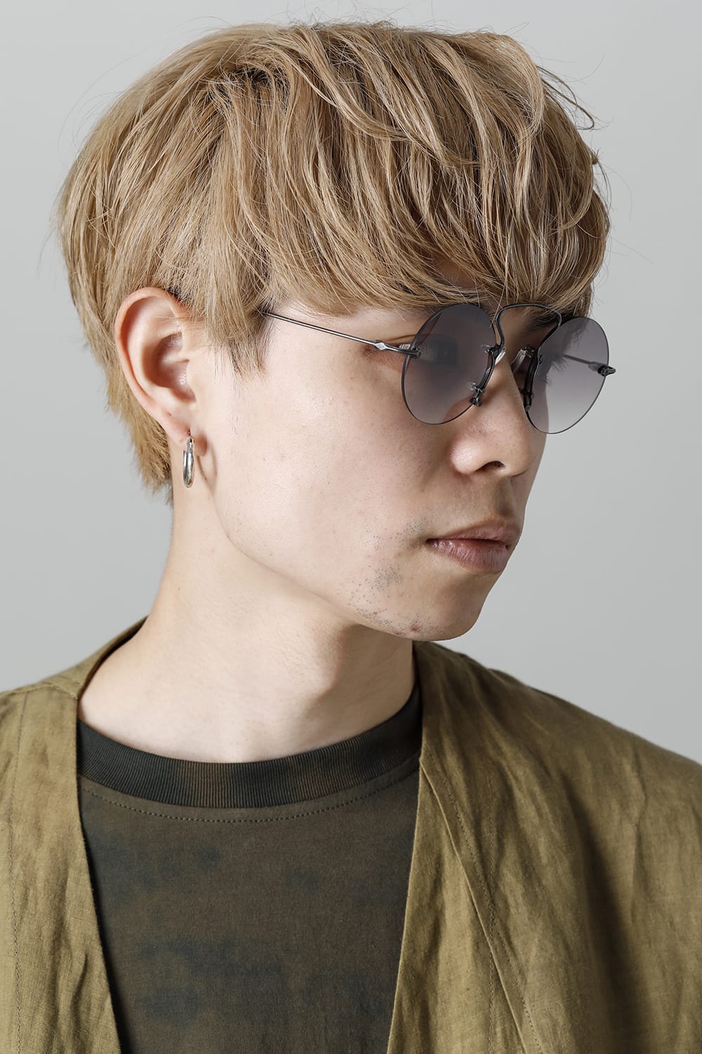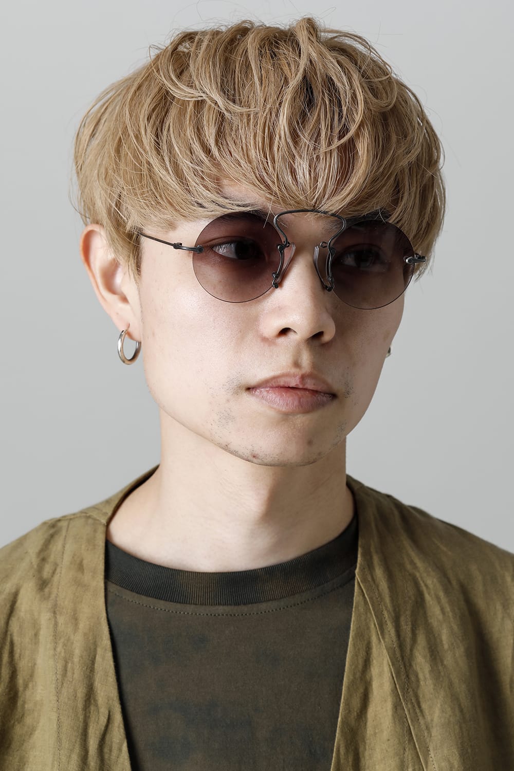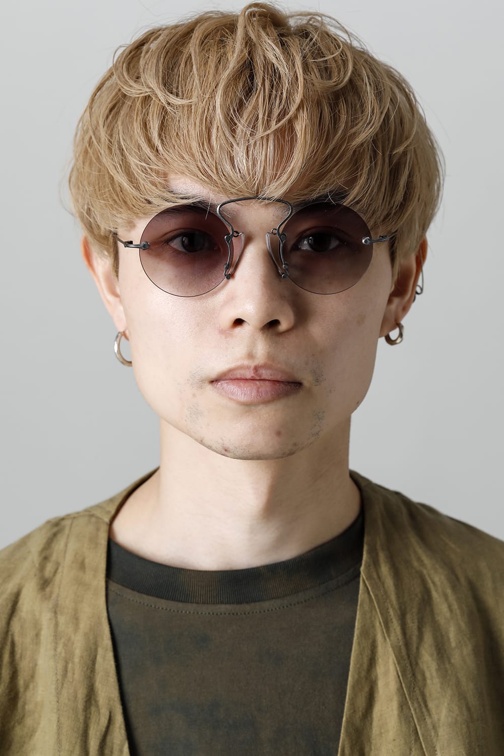 UMA WANG 22SSコレクションのランウェイでも着用されたモデルである"RG00UW9 PINCE-NEZ Round"。"PINCE-NEZ Round"と名付けられたこのモデルは、本来19世紀から20世紀初頭の欧米で流行したテンプルが取り払われ、鼻のみで固定するフィンチ型メガネを原型に、テンプルが取り付けられたリムレスデザインとなっています。鼻パッド部分は原型となったフィンチ型のようにバネ式となっており、非常にフィット性が高く付けている事を忘れるほど軽量です。湾曲した特徴的なブリッジデザインがアクセントとなっており、フレームカラーはVintage BlackとVintage Silverの2色展開。こちらの品番では、購入後すぐにサングラスとして着用可能なグラデーションのライトグレーレンズを採用した物をセレクトしています。お好きなカラーレンズや度入りレンズへの変更も可能な仕様ですので、お好きな組み合わせでお楽しみください。