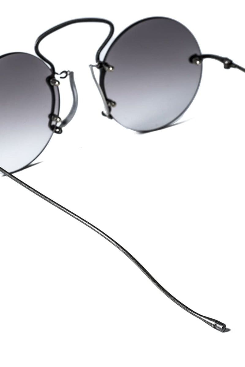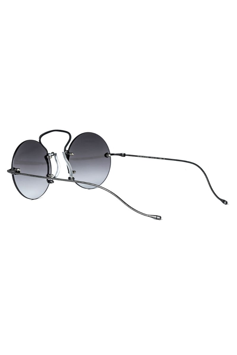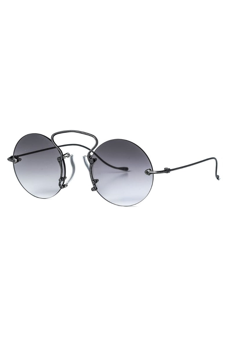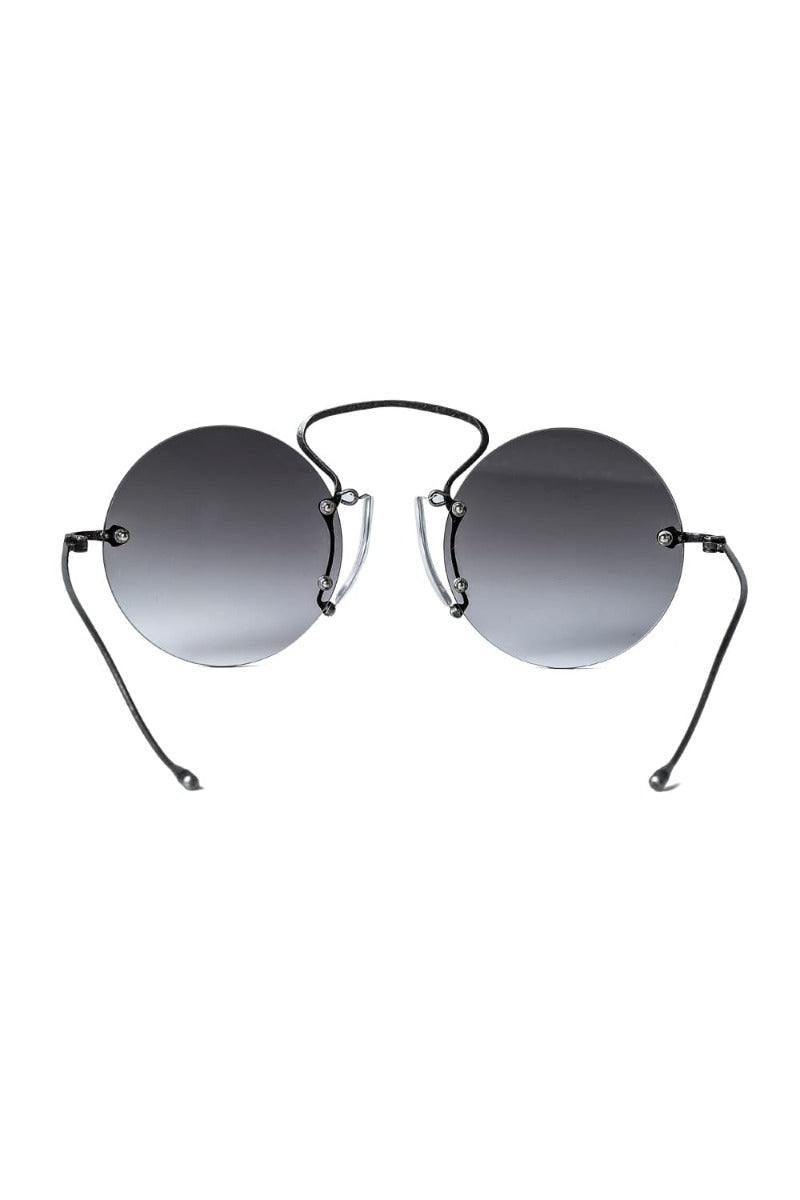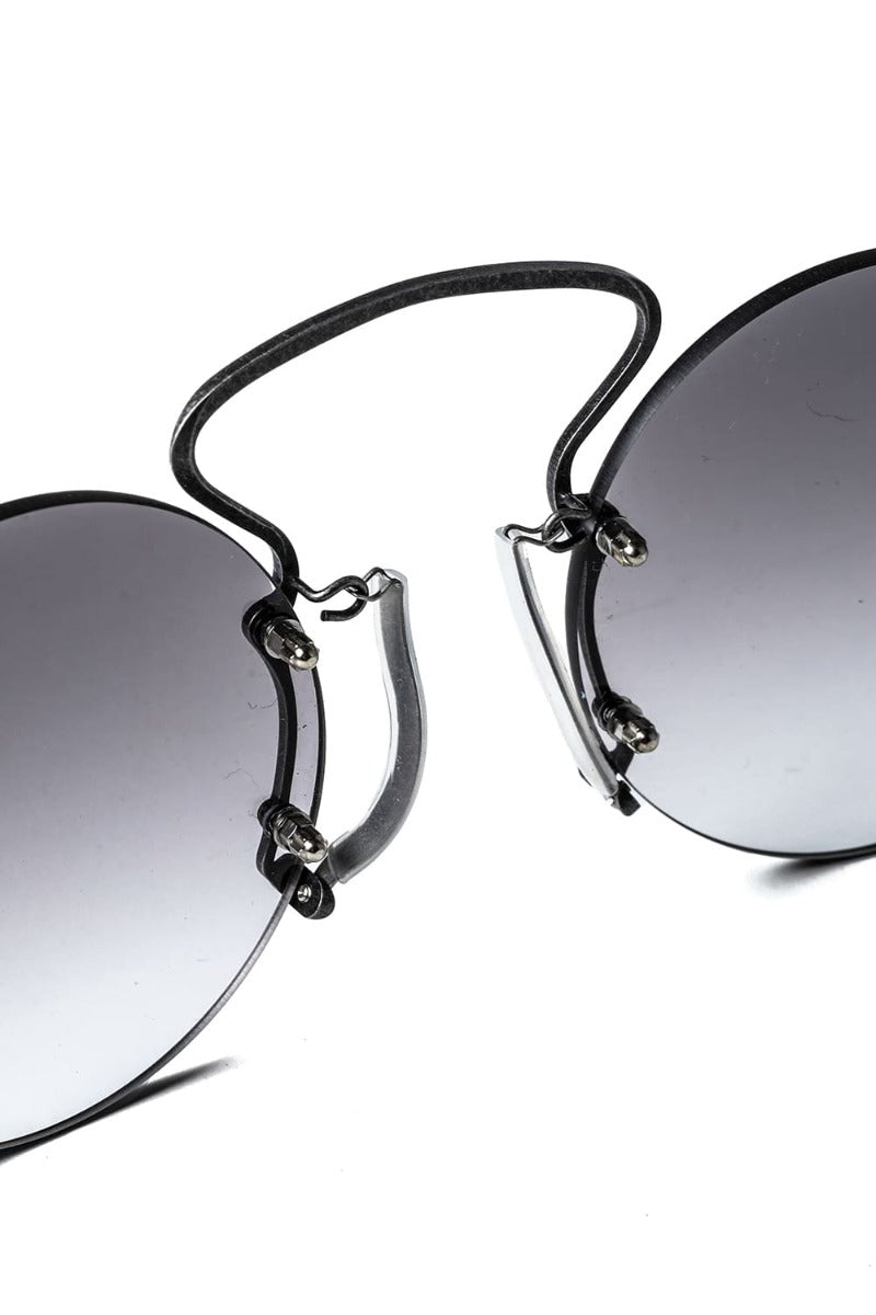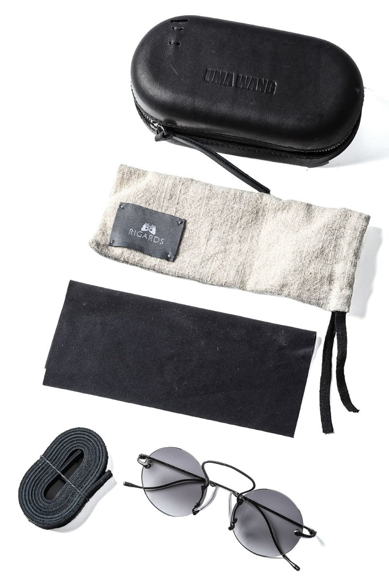 UMA WANG 22SSコレクションのランウェイでも着用されたモデルである"RG00UW9 PINCE-NEZ Round"。"PINCE-NEZ Round"と名付けられたこのモデルは、本来19世紀から20世紀初頭の欧米で流行したテンプルが取り払われ、鼻のみで固定するフィンチ型メガネを原型に、テンプルが取り付けられたリムレスデザインとなっています。鼻パッド部分は原型となったフィンチ型のようにバネ式となっており、非常にフィット性が高く付けている事を忘れるほど軽量です。湾曲した特徴的なブリッジデザインがアクセントとなっており、フレームカラーはVintage BlackとVintage Silverの2色展開。こちらの品番では、購入後すぐにサングラスとして着用可能なグラデーションのライトグレーレンズを採用した物をセレクトしています。お好きなカラーレンズや度入りレンズへの変更も可能な仕様ですので、お好きな組み合わせでお楽しみください。