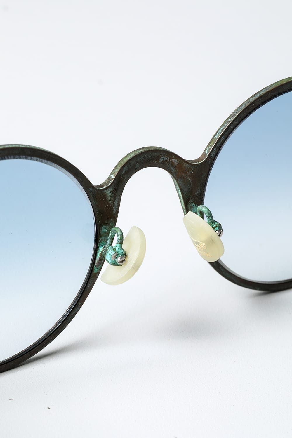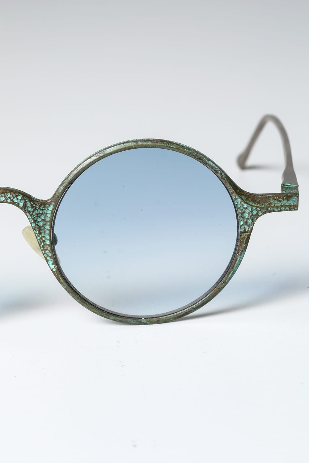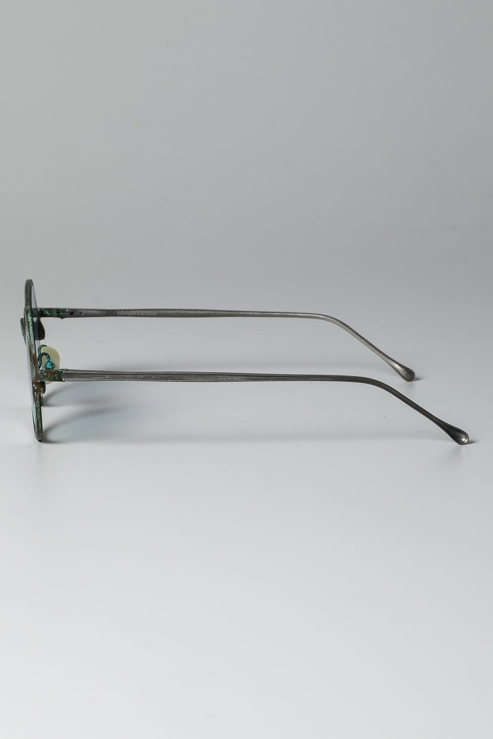 ラウンド型フルリムフレームのアイウェア。職人の手により丹念に手打ちされた槌目銅素材の玄人感漂う一本です。カラーは敢えて腐食加工を施した青錆(+ブルーレンズ)仕様。錆加工は独自に調合した特殊な薬品に漬け込んで色合いを調整しており、漬け込み時間はデザイナーの感覚で行うため、一点一点その表情が異なります。 自然に侵食されたかのような顔つきは日本の侘び寂びを想わせる趣深い仕上り。錆加工後に表面をコーディング保護してあるため、時間経過による変化も少なく、そのままの表情を楽しんでいただけます。