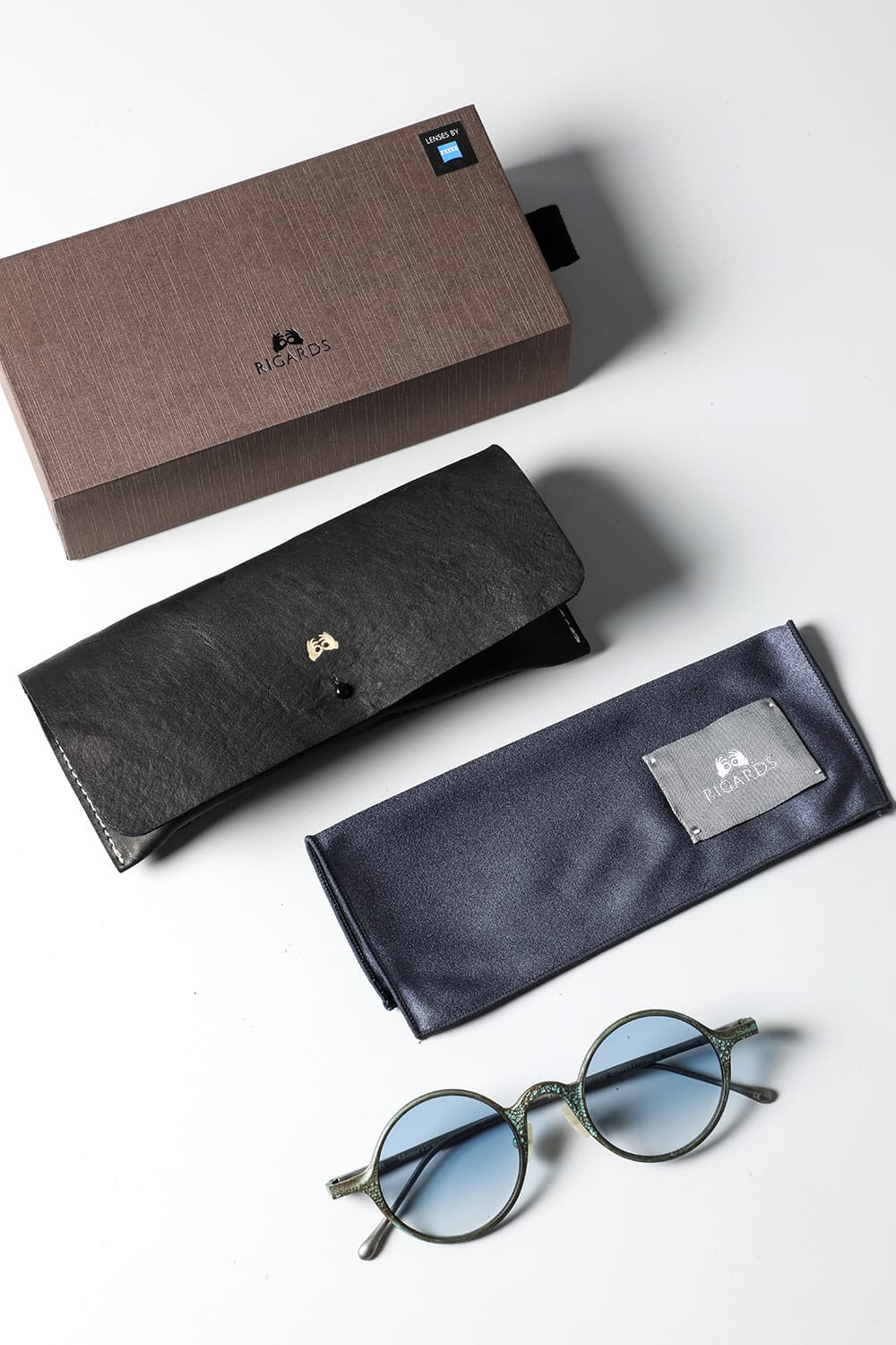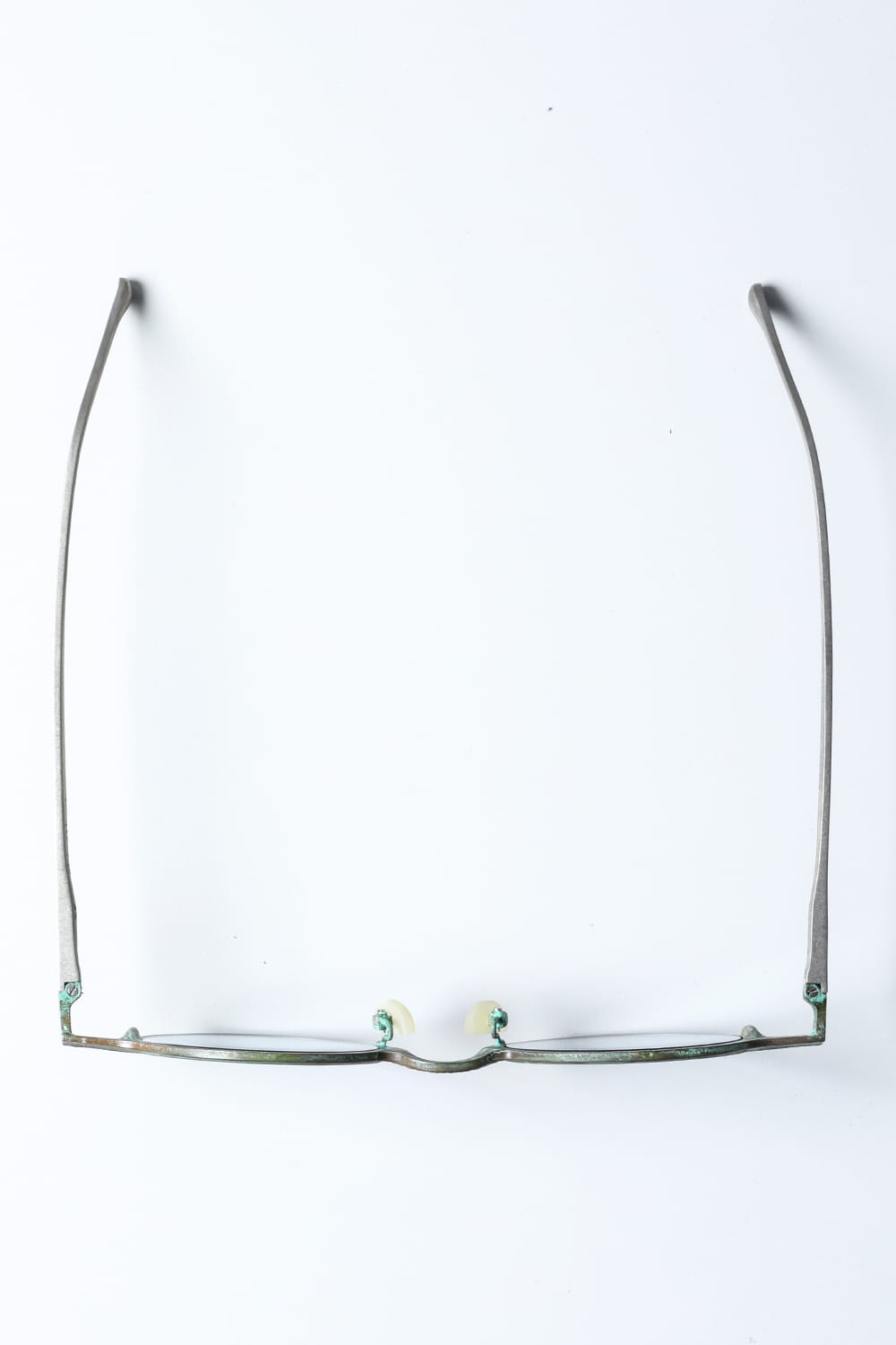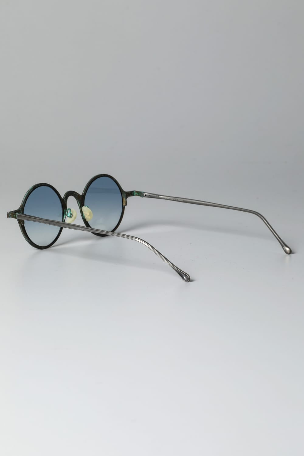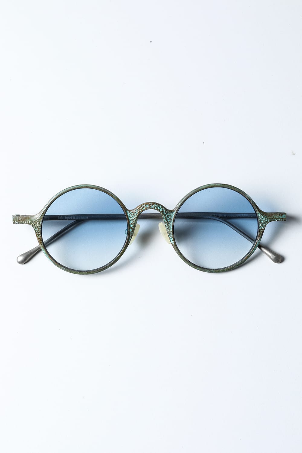 ラウンド型フルリムフレームのアイウェア。職人の手により丹念に手打ちされた槌目銅素材の玄人感漂う一本です。カラーは敢えて腐食加工を施した青錆(+ブルーレンズ)仕様。錆加工は独自に調合した特殊な薬品に漬け込んで色合いを調整しており、漬け込み時間はデザイナーの感覚で行うため、一点一点その表情が異なります。 自然に侵食されたかのような顔つきは日本の侘び寂びを想わせる趣深い仕上り。錆加工後に表面をコーディング保護してあるため、時間経過による変化も少なく、そのままの表情を楽しんでいただけます。