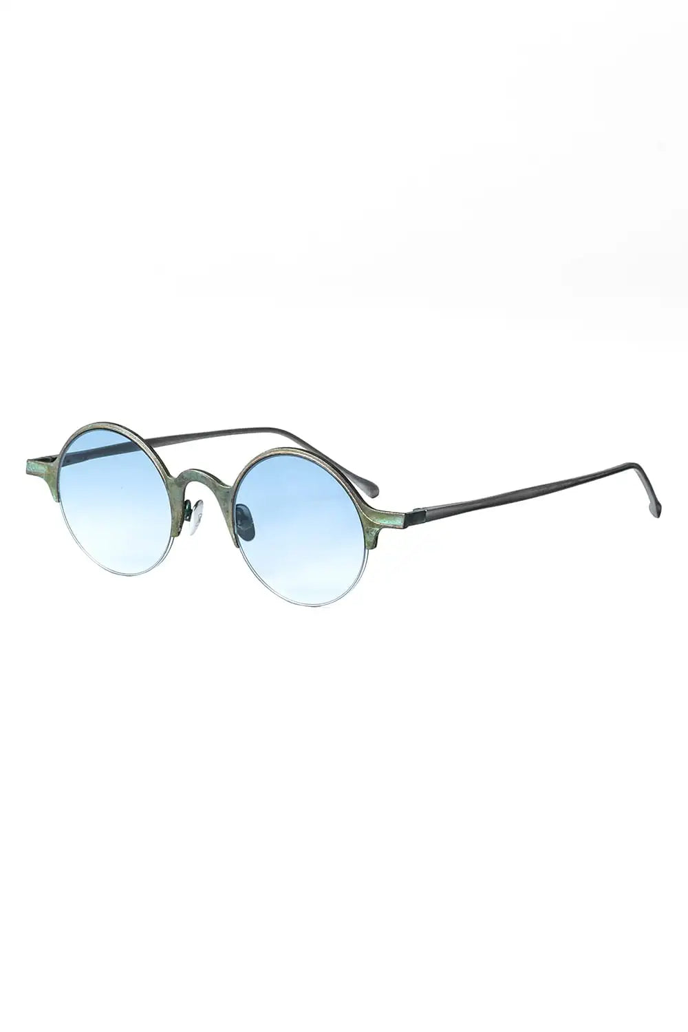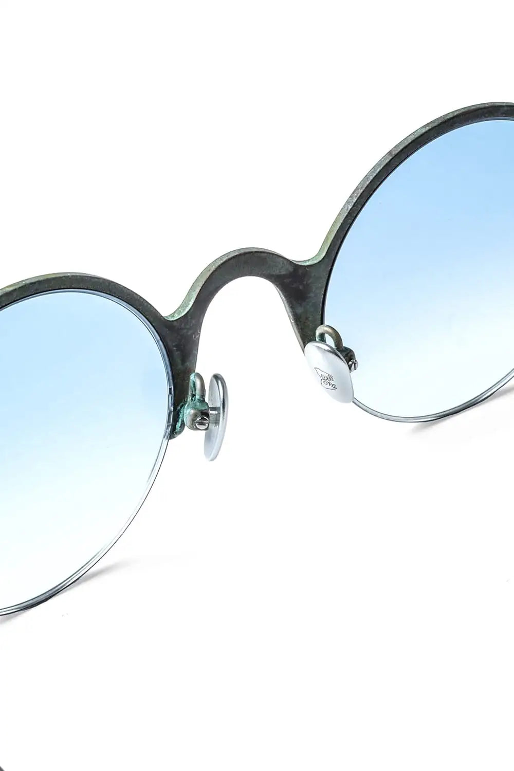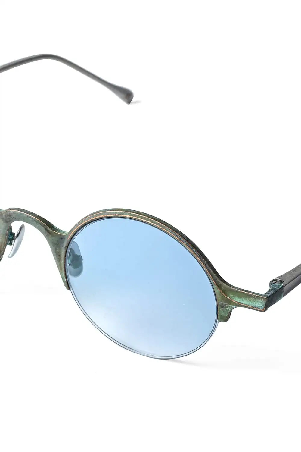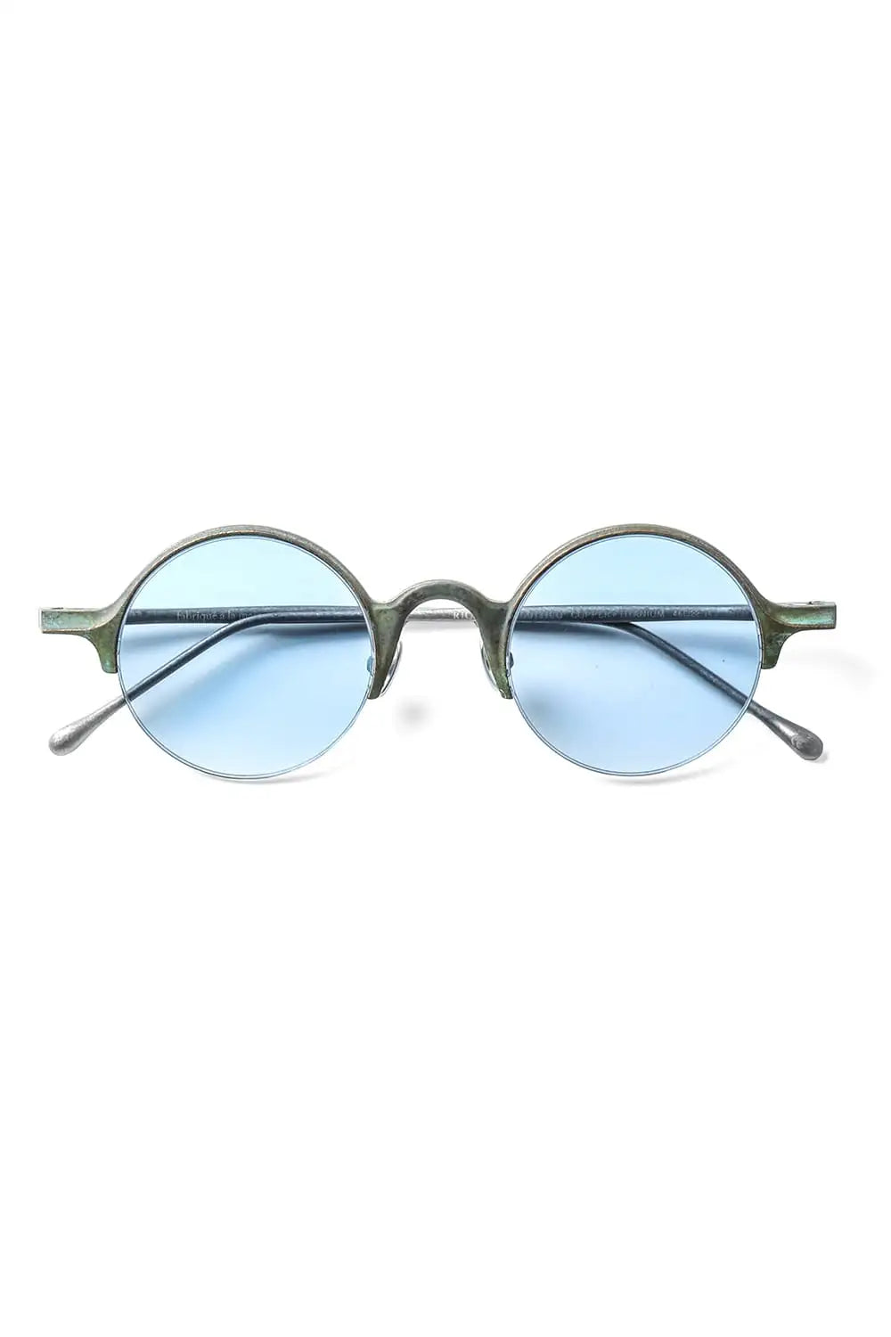 銅を使ったハーフリムフレーム、ラウンド型のアイウェア。レンズはブルーグラデーション。