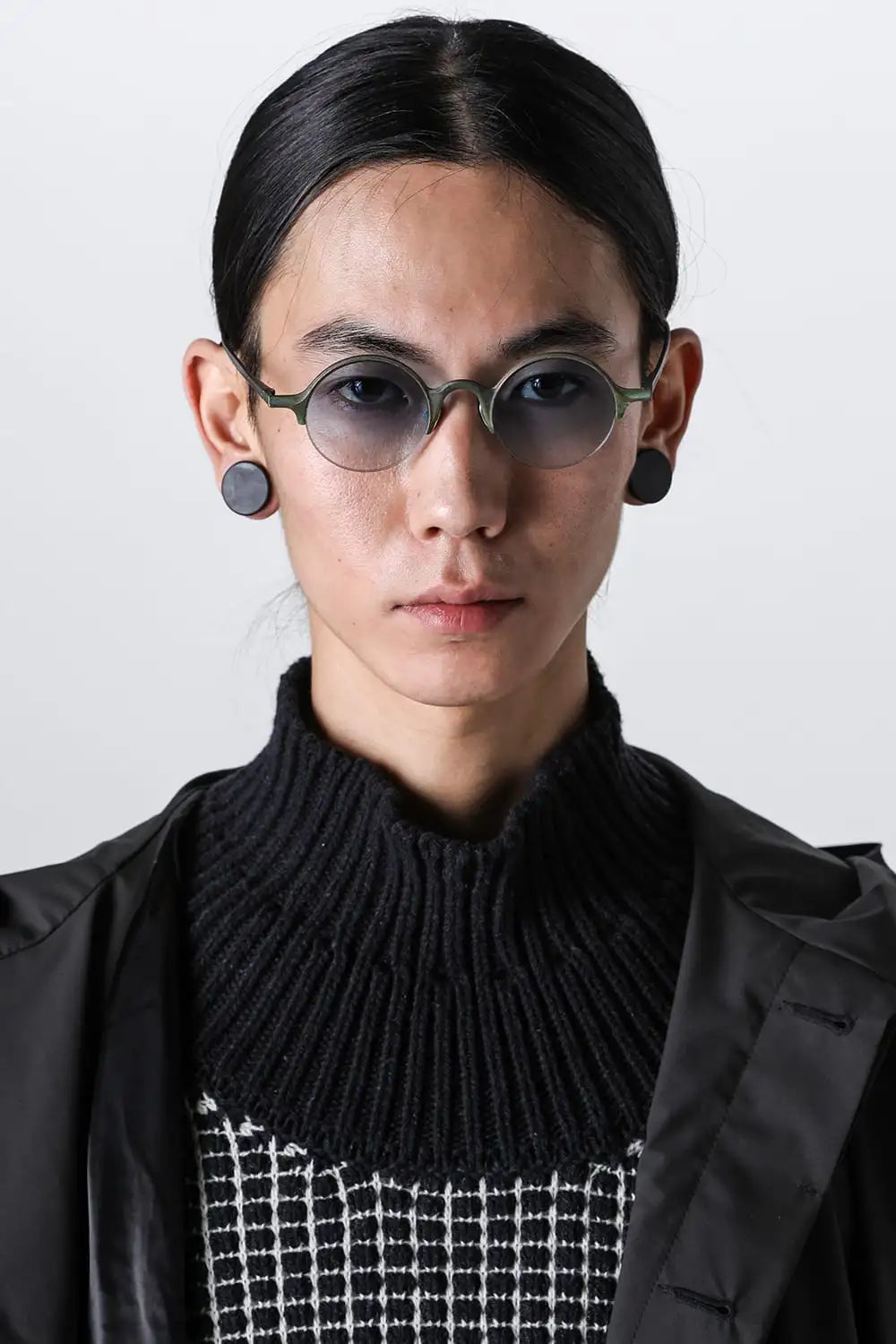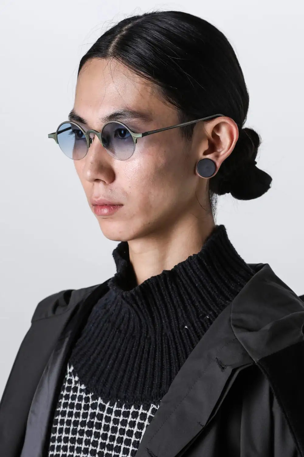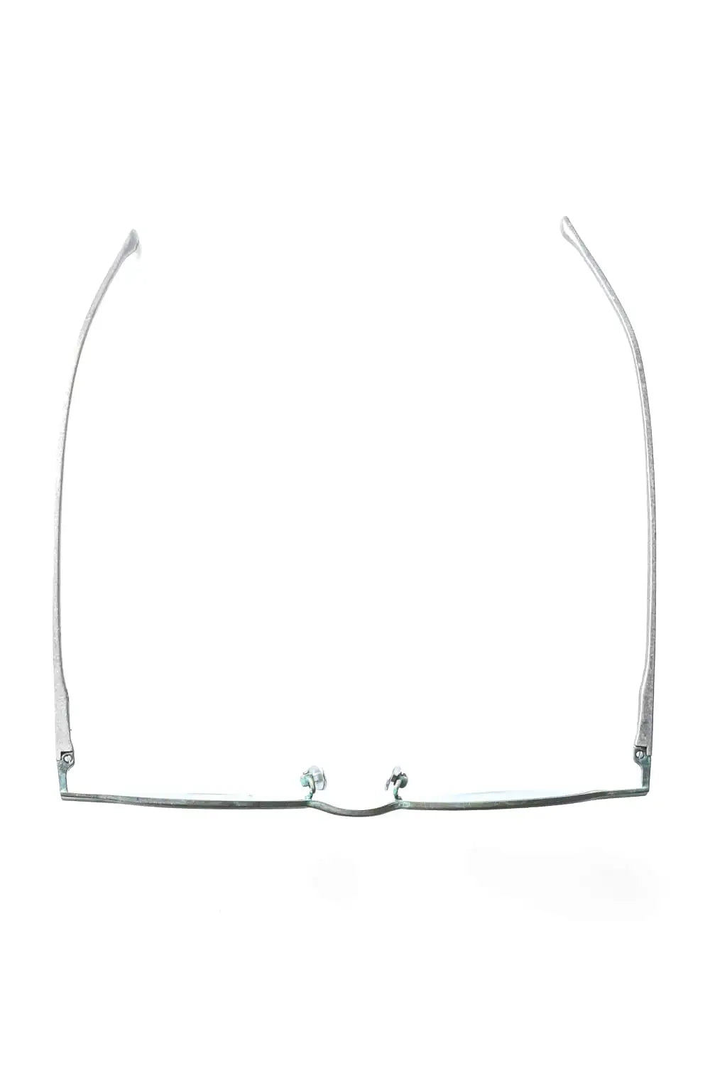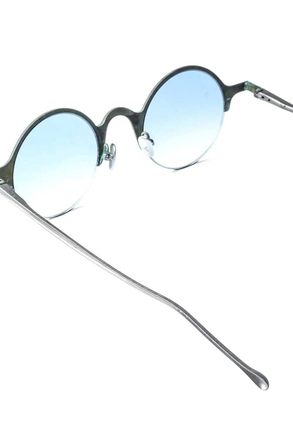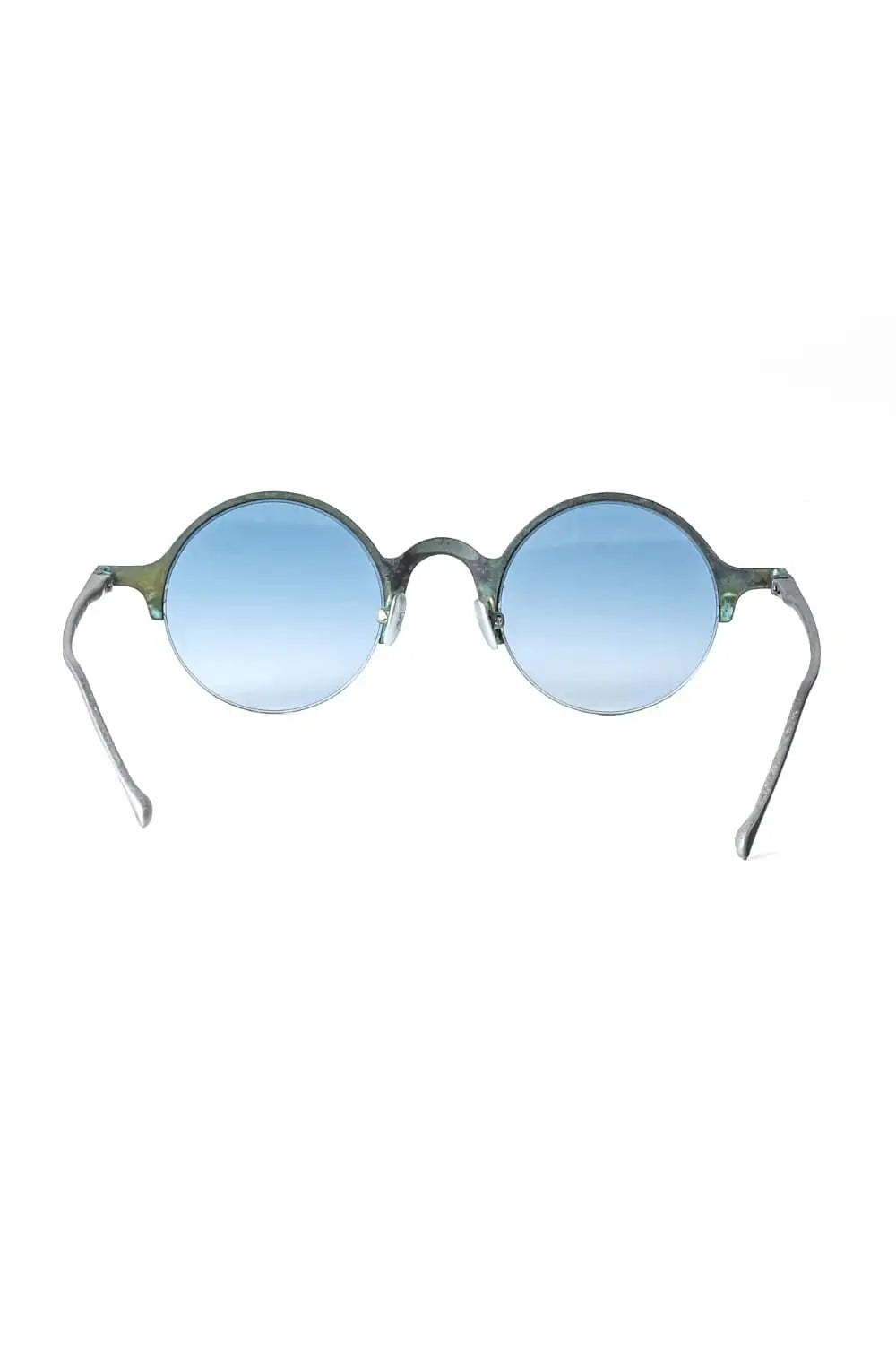銅を使ったハーフリムフレーム、ラウンド型のアイウェア。レンズはブルーグラデーション。