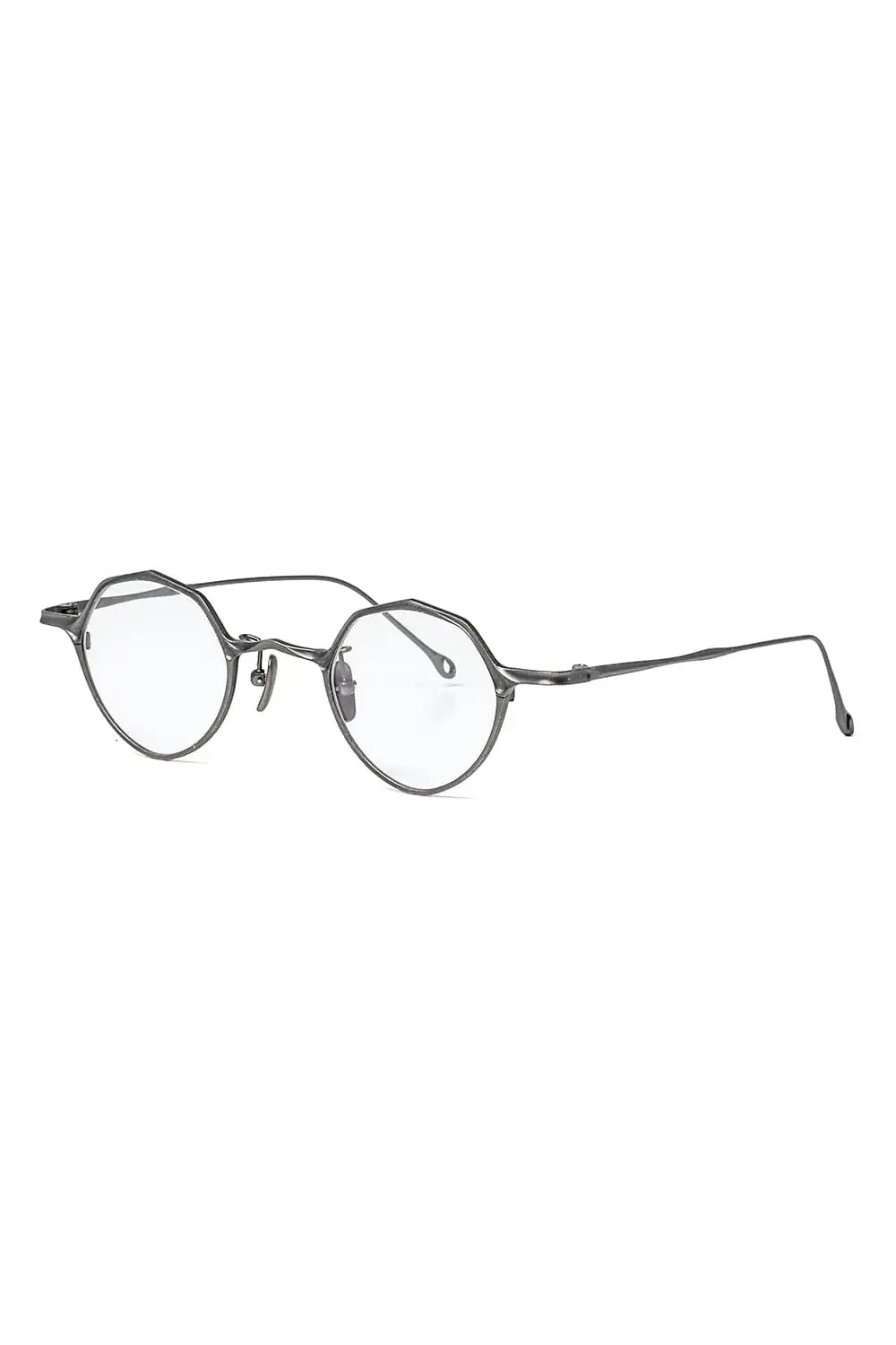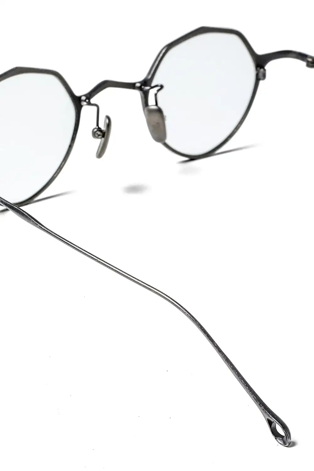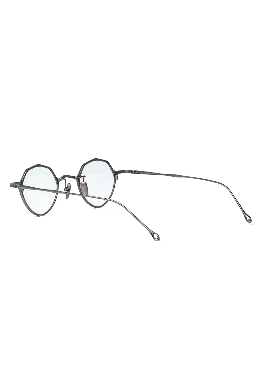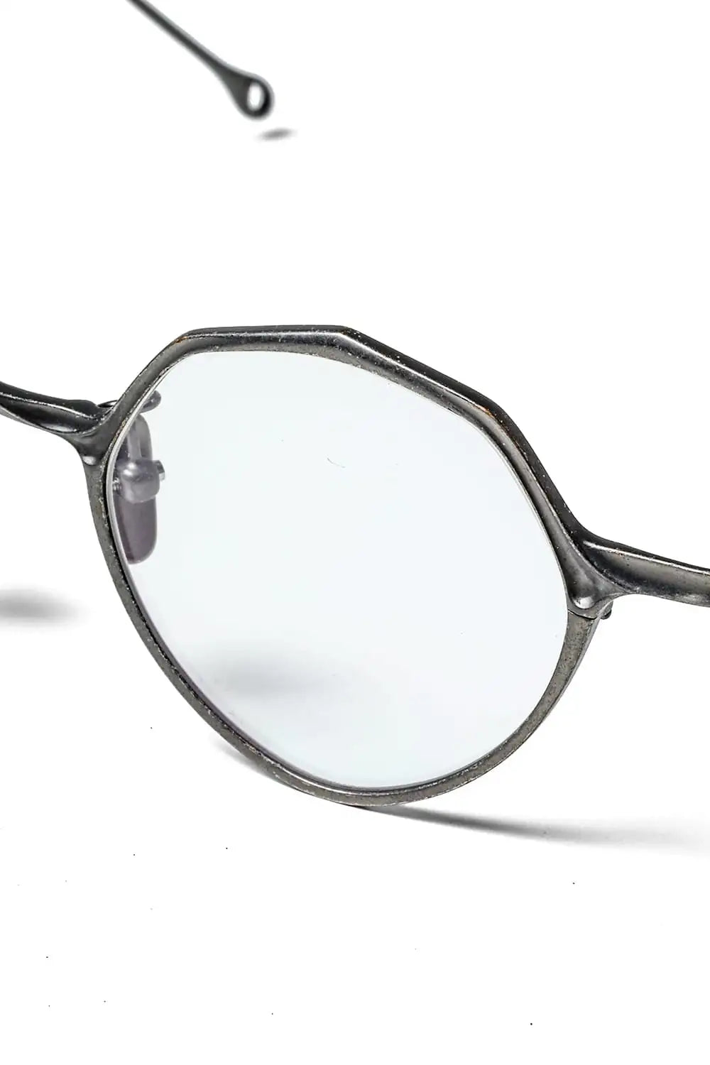 マット仕上げのヴィンテージグレーカラーのカッパーフレームをベースにテンプルをチタニウムに切り替えた変形ヘキサゴンフレーム。