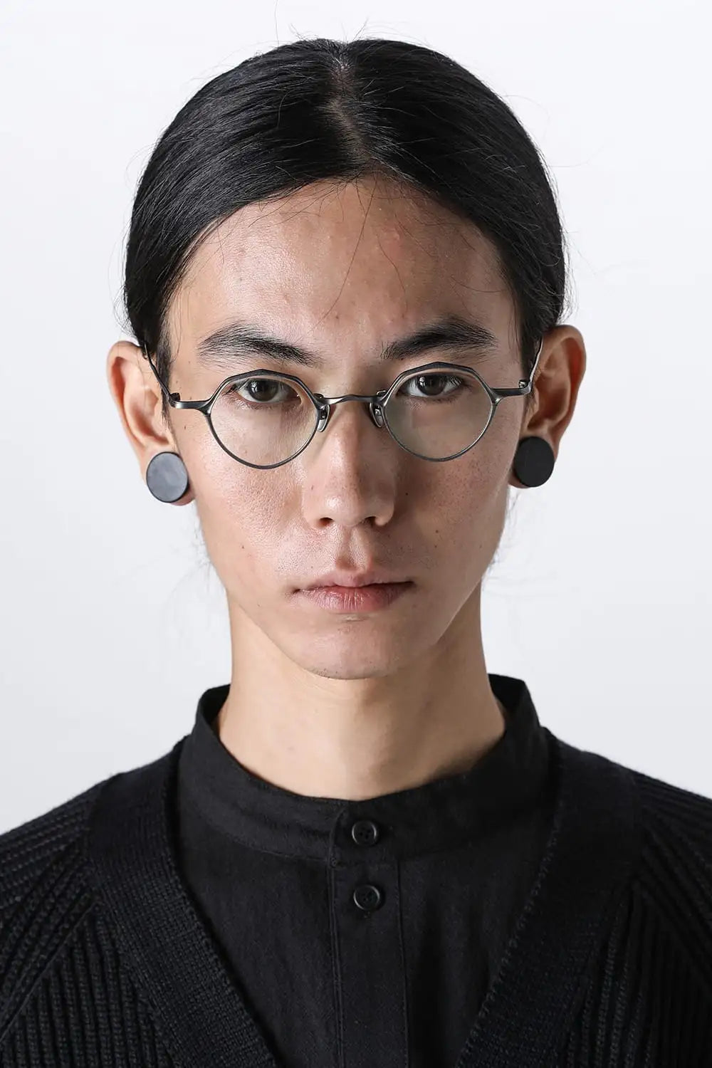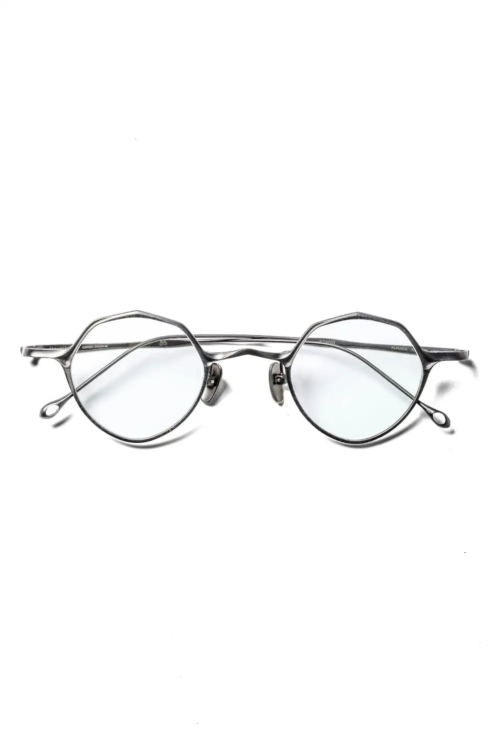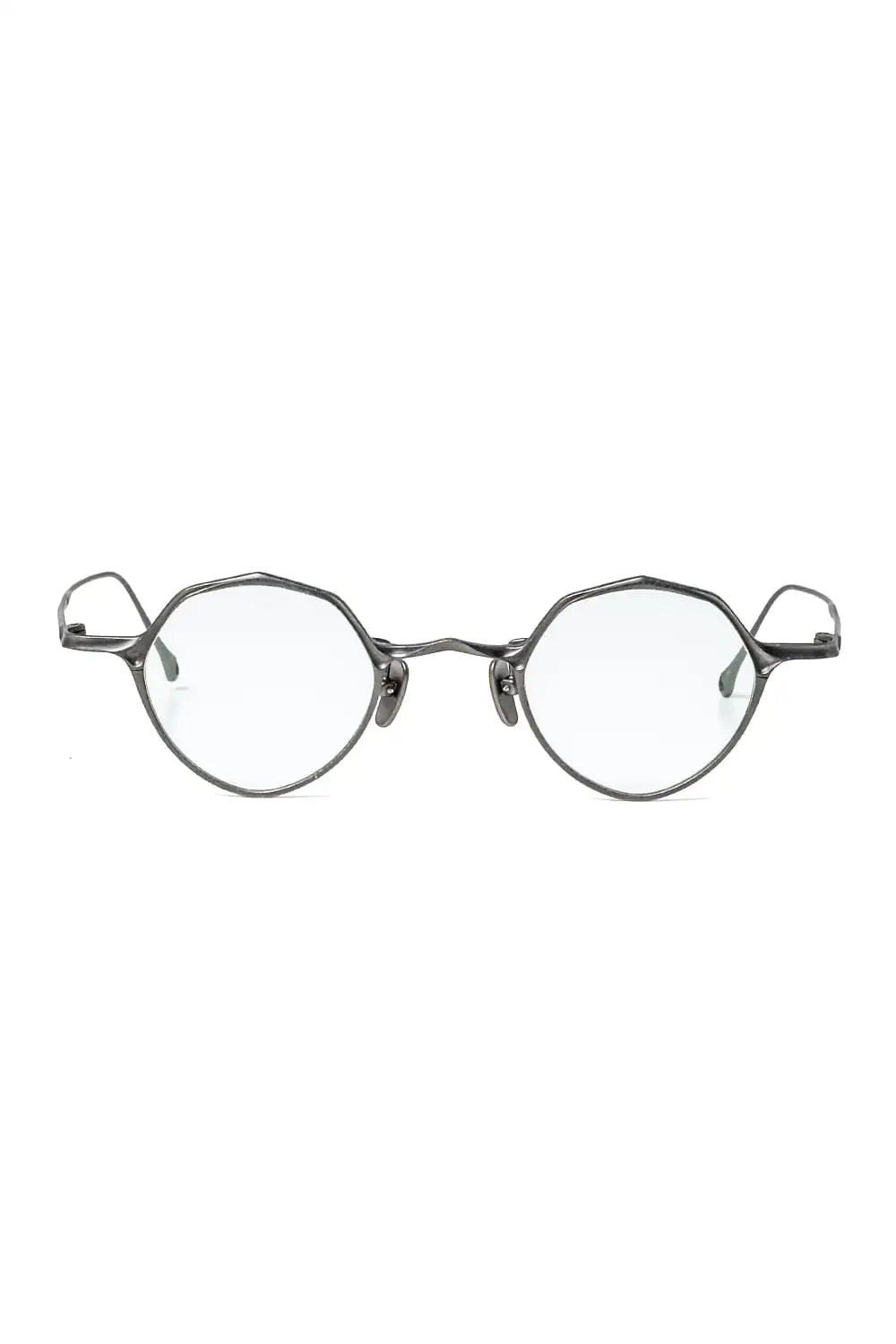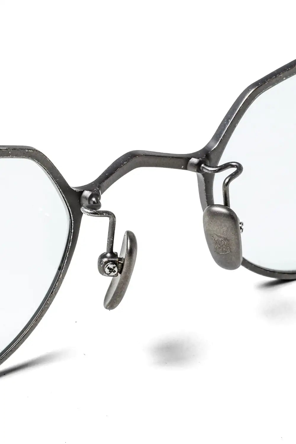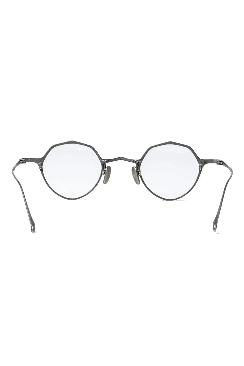 マット仕上げのヴィンテージグレーカラーのカッパーフレームをベースにテンプルをチタニウムに切り替えた変形ヘキサゴンフレーム。