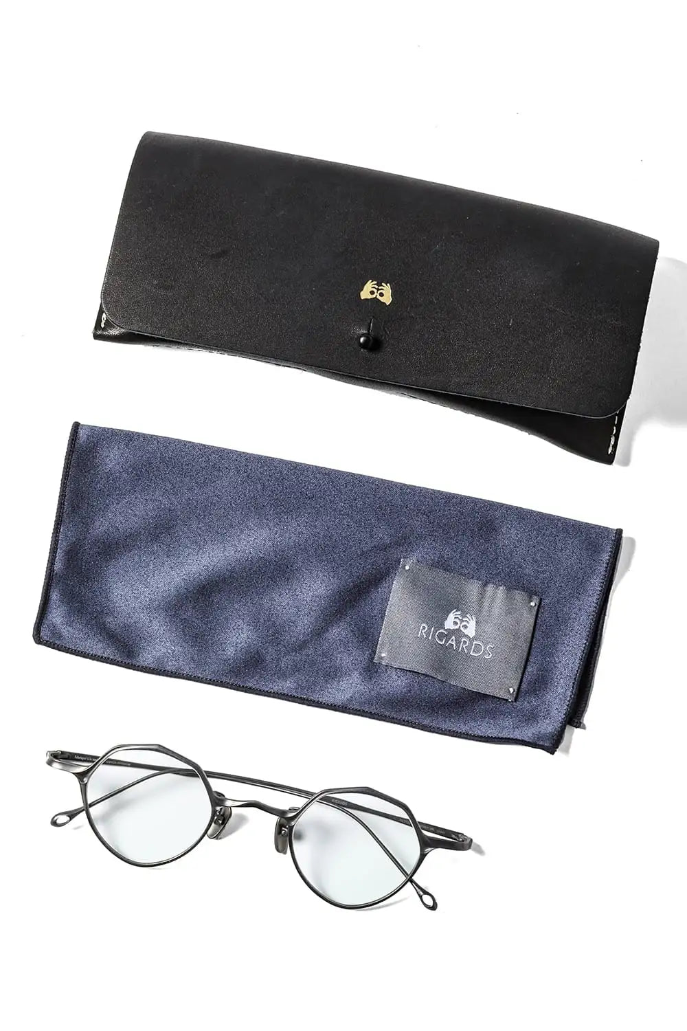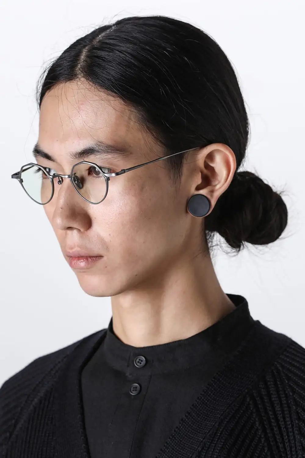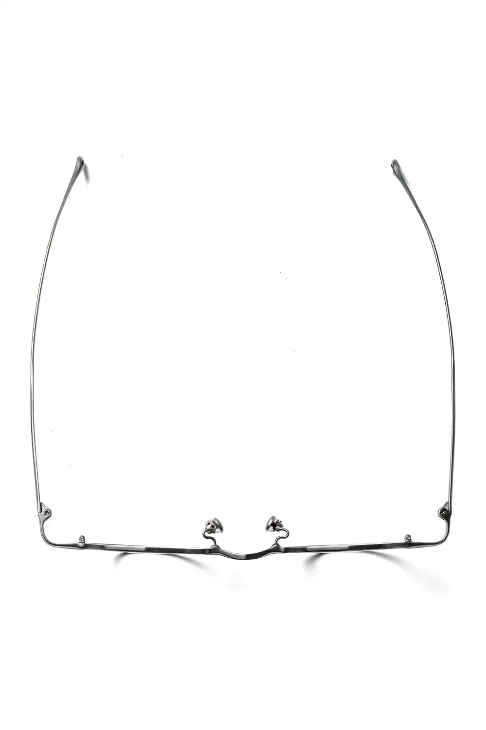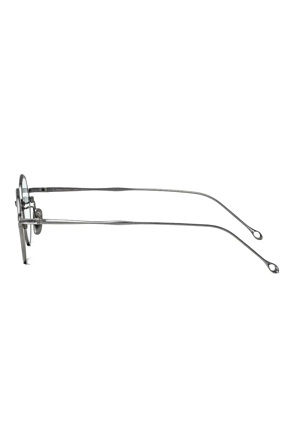 マット仕上げのヴィンテージグレーカラーのカッパーフレームをベースにテンプルをチタニウムに切り替えた変形ヘキサゴンフレーム。