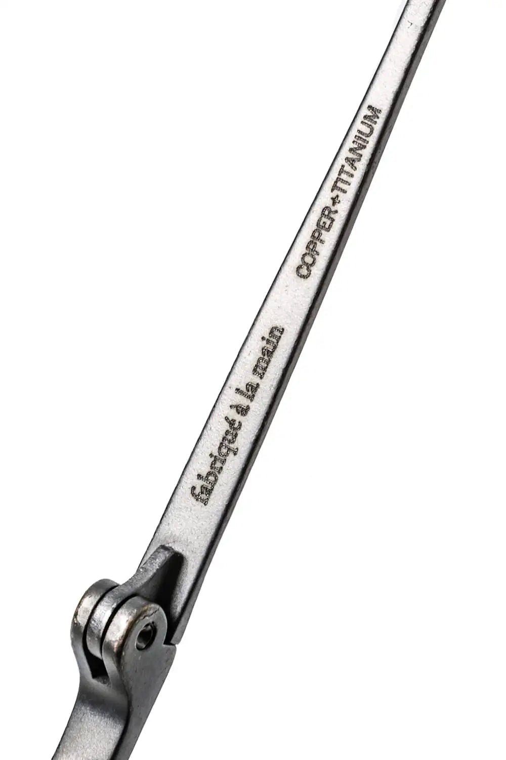 カッパーフレーム特有の経年変化とチタニウムのテンプルフレームの着用感の快適性を兼ね備えたフレームとなっています。