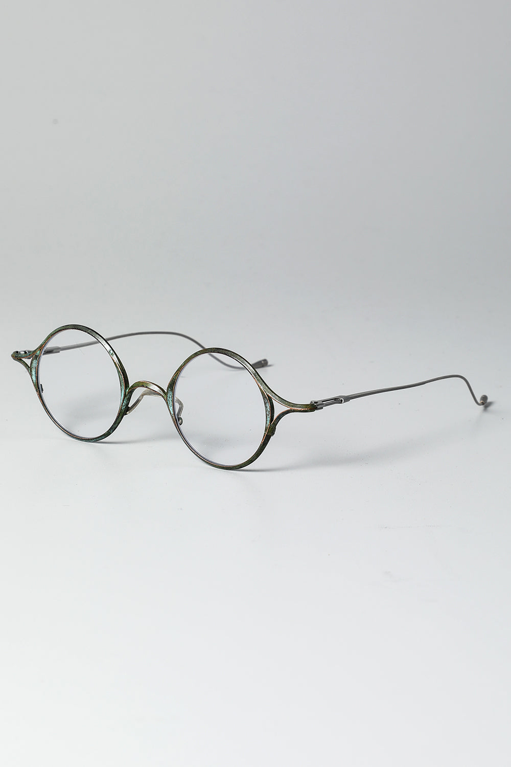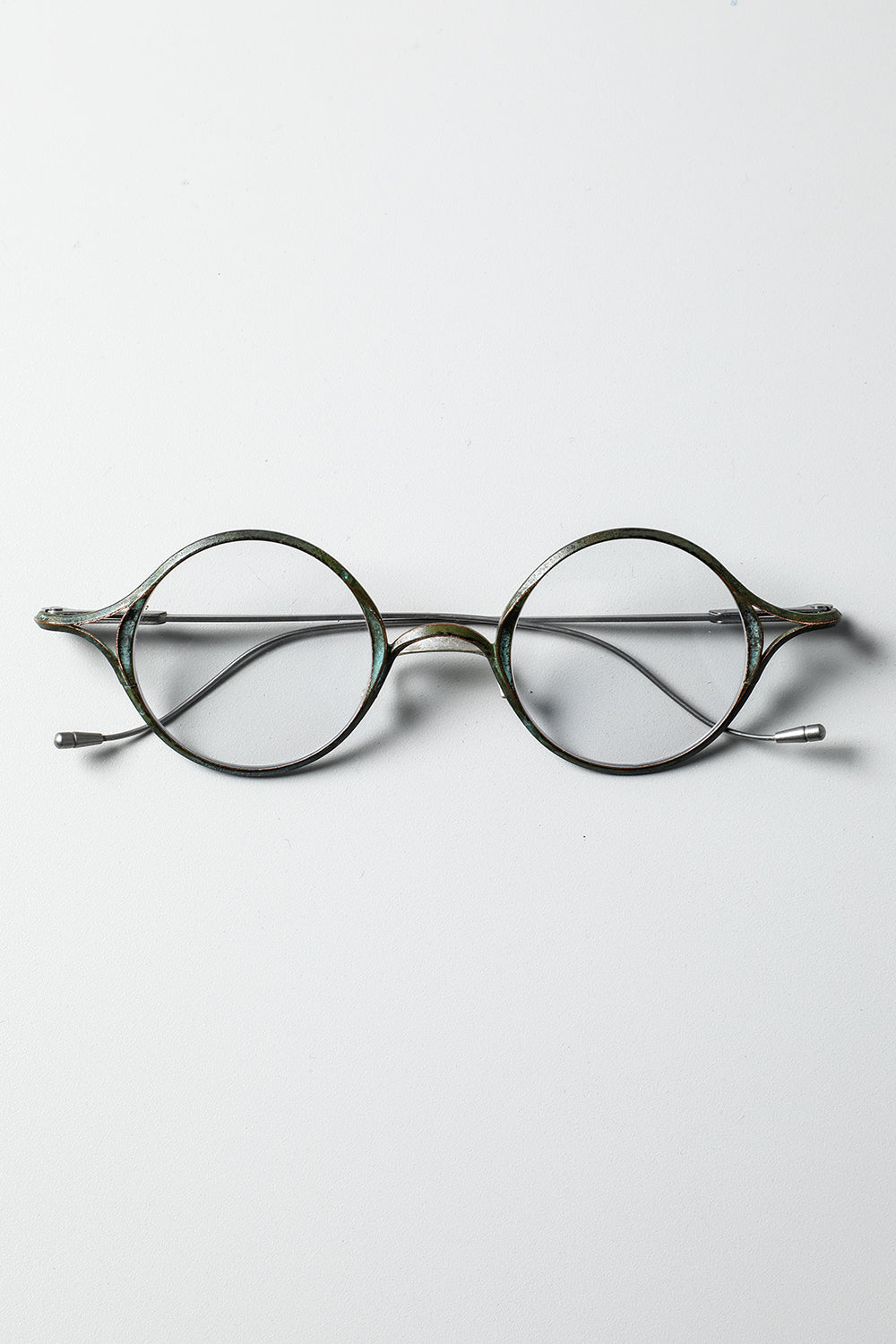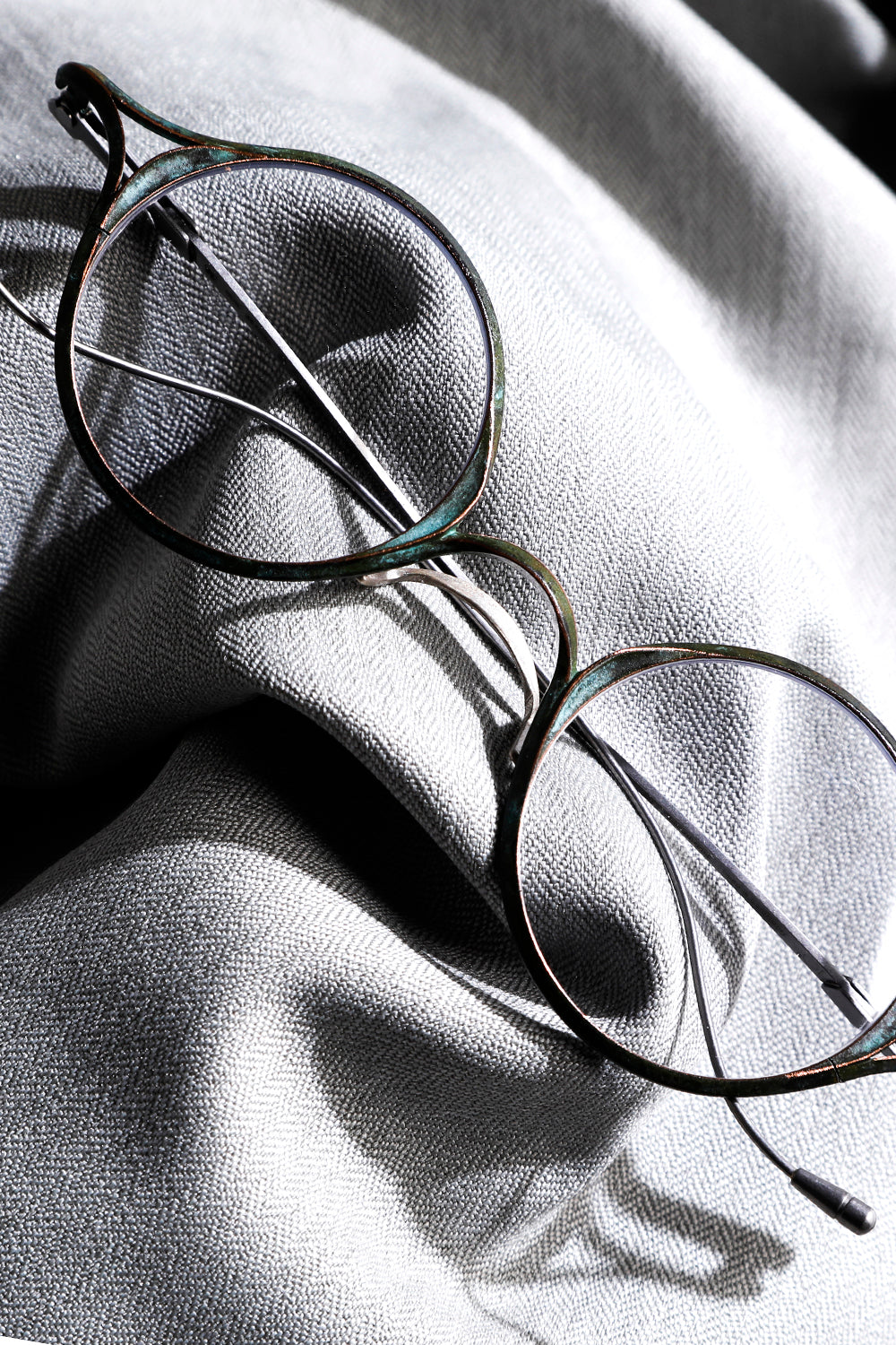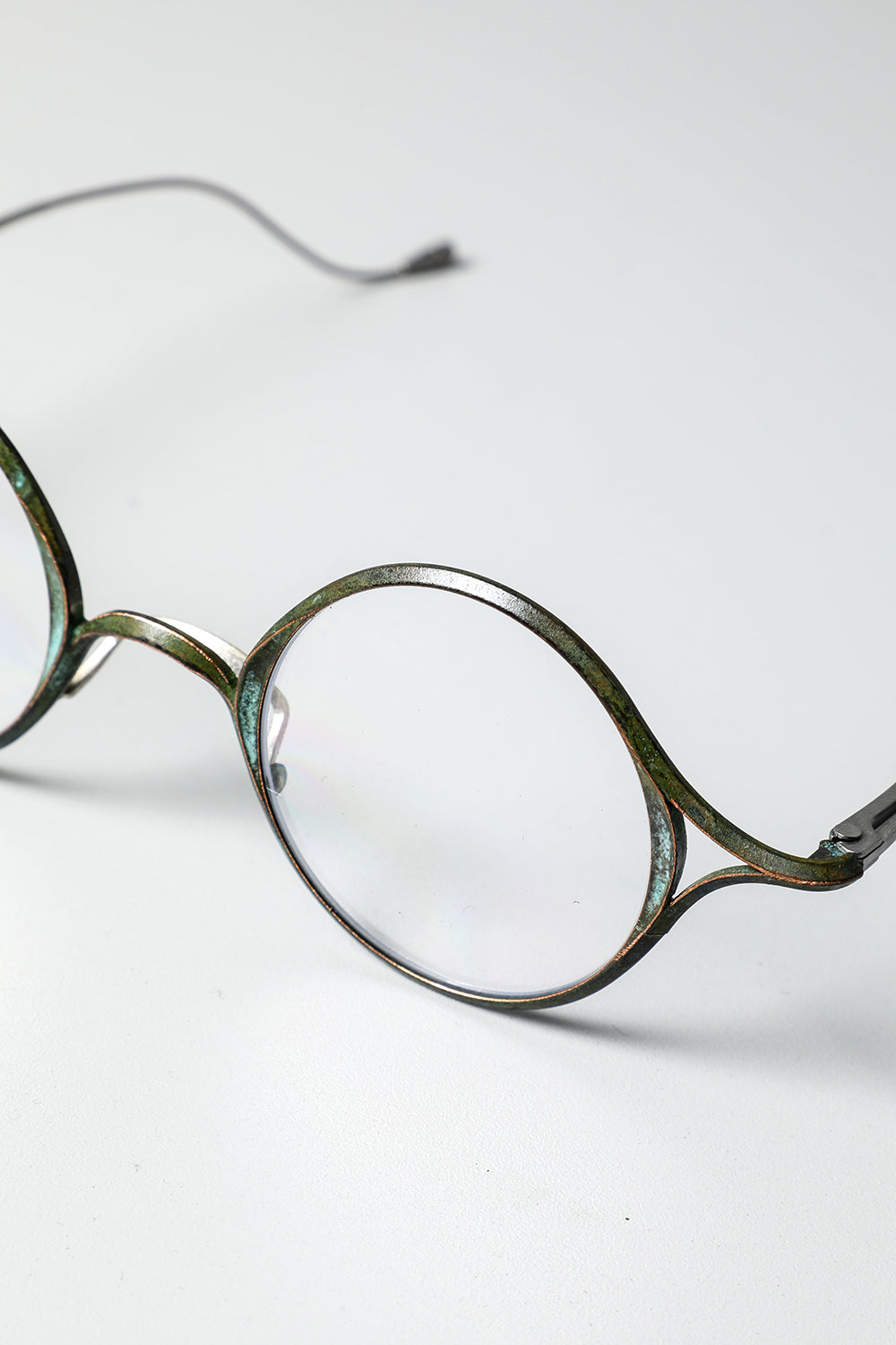 曲線の美しい純正チタンで作られたラウンドフレームのアイウェア。ブリッジからリム、ヨロイにかけて面に捻りを加えたシンプルながらも遊び心のあるデザイン。専用のスプリングヒンジで掛け易さも向上させています。カラーはアイアンを思わせる鈍く重たいグレーと腐食加工を施した青錆の2仕様。グレーは手磨きによるエイジングを施し、長年に渡り使い込んだ様なアジのある表情に仕上げられています。錆加工は独自に調合した特殊な薬品に漬け込んで色合いを調整しており、漬け込み時間はデザイナーの感覚で行うため、一点一点その表情が異なります。錆加工後に表面をコーディング保護してあるため、時間経過による変化も少なく、そのままの表情を楽しんでいただけます。