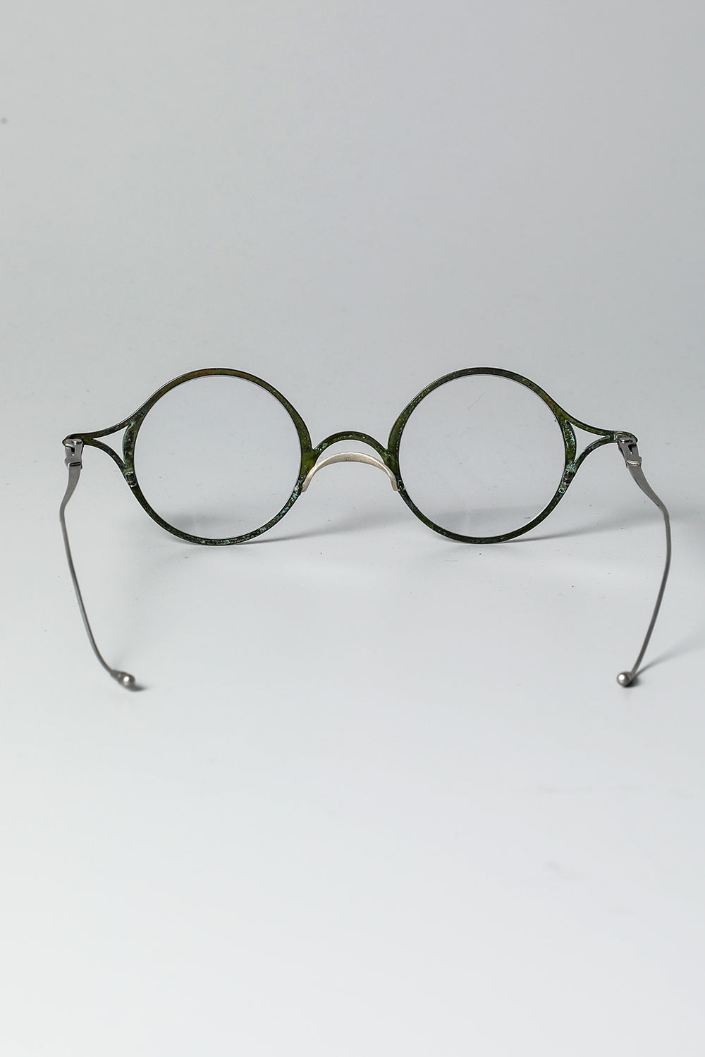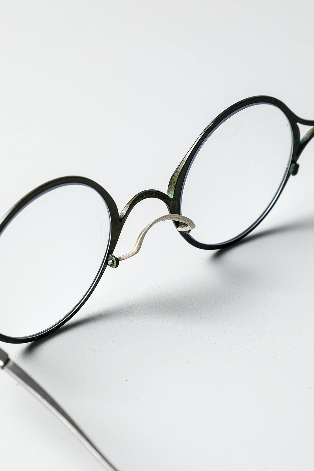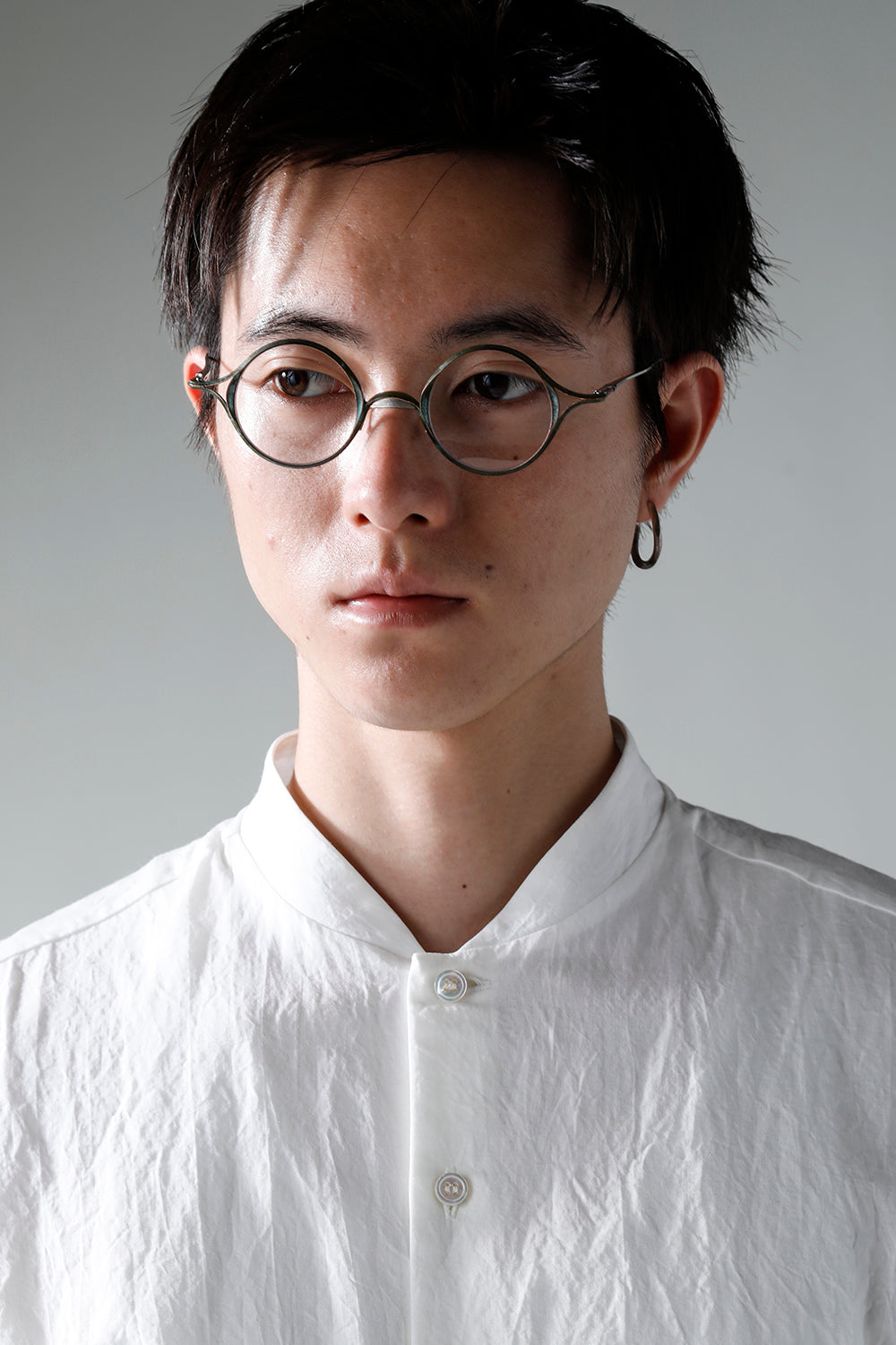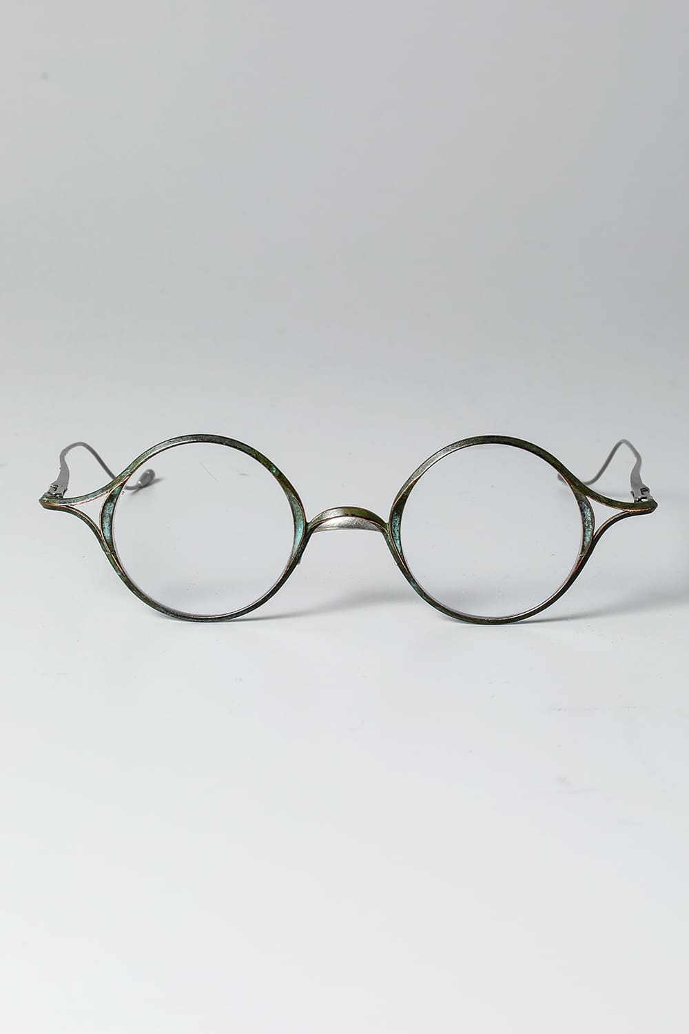 曲線の美しい純正チタンで作られたラウンドフレームのアイウェア。ブリッジからリム、ヨロイにかけて面に捻りを加えたシンプルながらも遊び心のあるデザイン。専用のスプリングヒンジで掛け易さも向上させています。カラーはアイアンを思わせる鈍く重たいグレーと腐食加工を施した青錆の2仕様。グレーは手磨きによるエイジングを施し、長年に渡り使い込んだ様なアジのある表情に仕上げられています。錆加工は独自に調合した特殊な薬品に漬け込んで色合いを調整しており、漬け込み時間はデザイナーの感覚で行うため、一点一点その表情が異なります。錆加工後に表面をコーディング保護してあるため、時間経過による変化も少なく、そのままの表情を楽しんでいただけます。