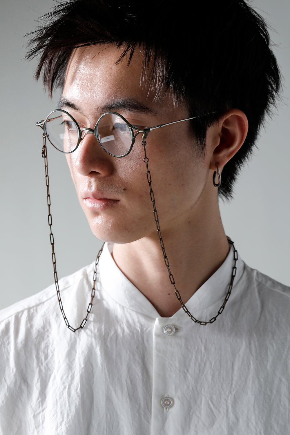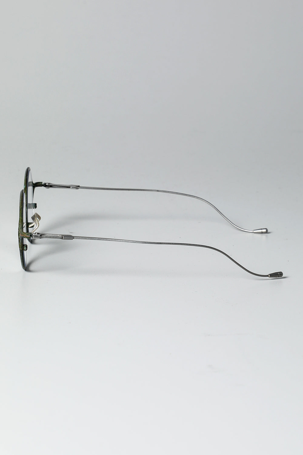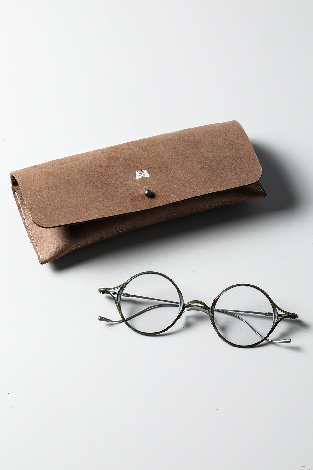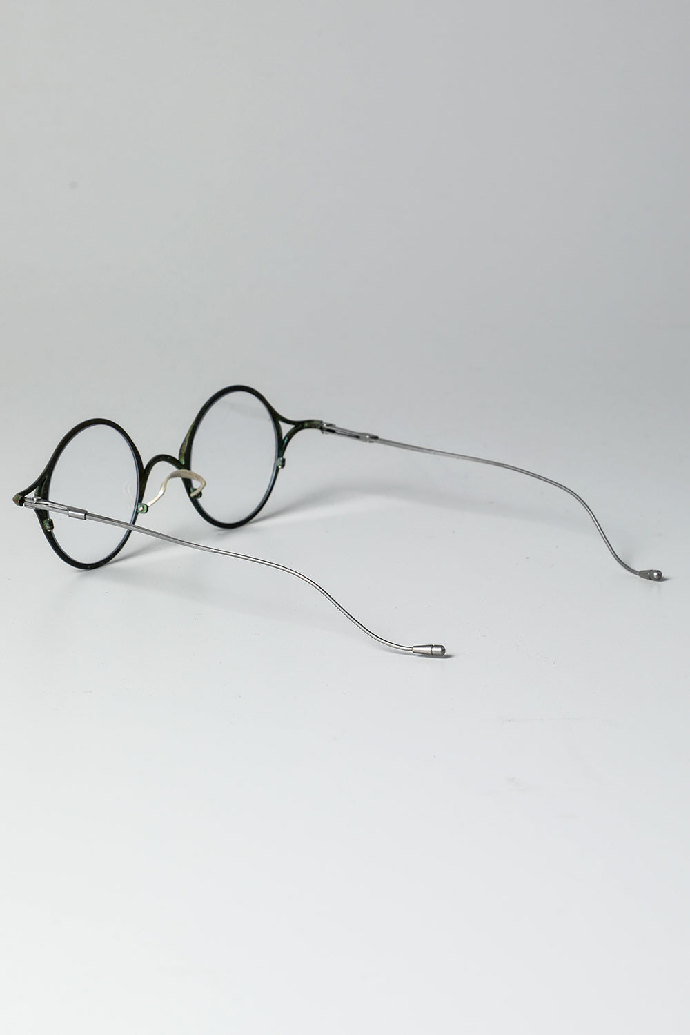 曲線の美しい純正チタンで作られたラウンドフレームのアイウェア。ブリッジからリム、ヨロイにかけて面に捻りを加えたシンプルながらも遊び心のあるデザイン。専用のスプリングヒンジで掛け易さも向上させています。カラーはアイアンを思わせる鈍く重たいグレーと腐食加工を施した青錆の2仕様。グレーは手磨きによるエイジングを施し、長年に渡り使い込んだ様なアジのある表情に仕上げられています。錆加工は独自に調合した特殊な薬品に漬け込んで色合いを調整しており、漬け込み時間はデザイナーの感覚で行うため、一点一点その表情が異なります。錆加工後に表面をコーディング保護してあるため、時間経過による変化も少なく、そのままの表情を楽しんでいただけます。
