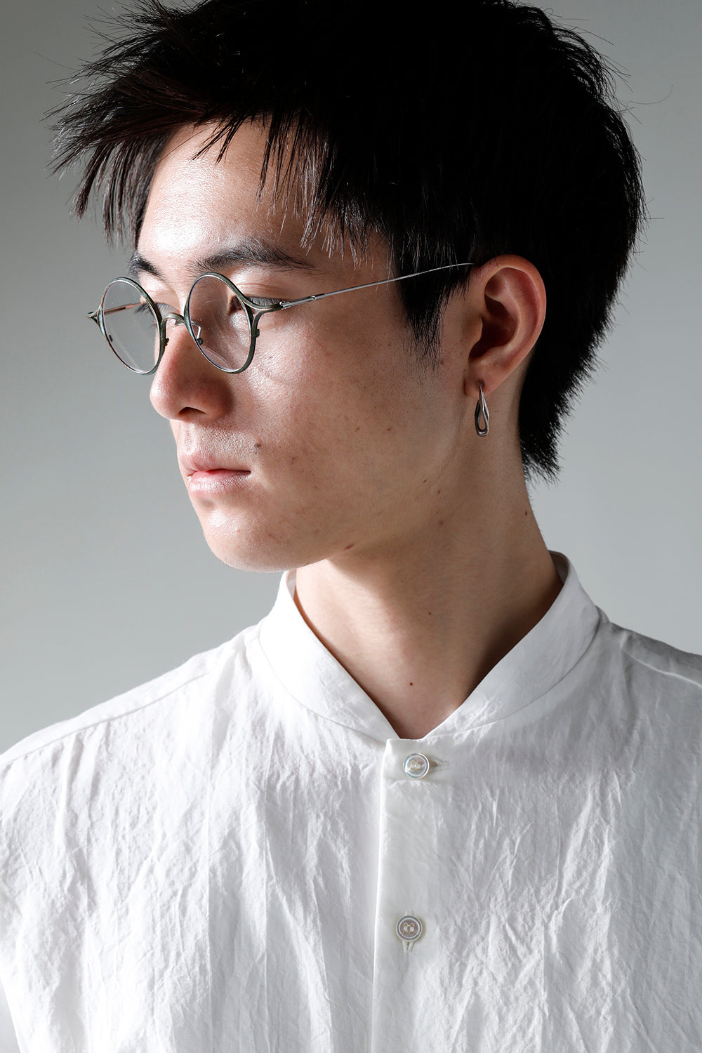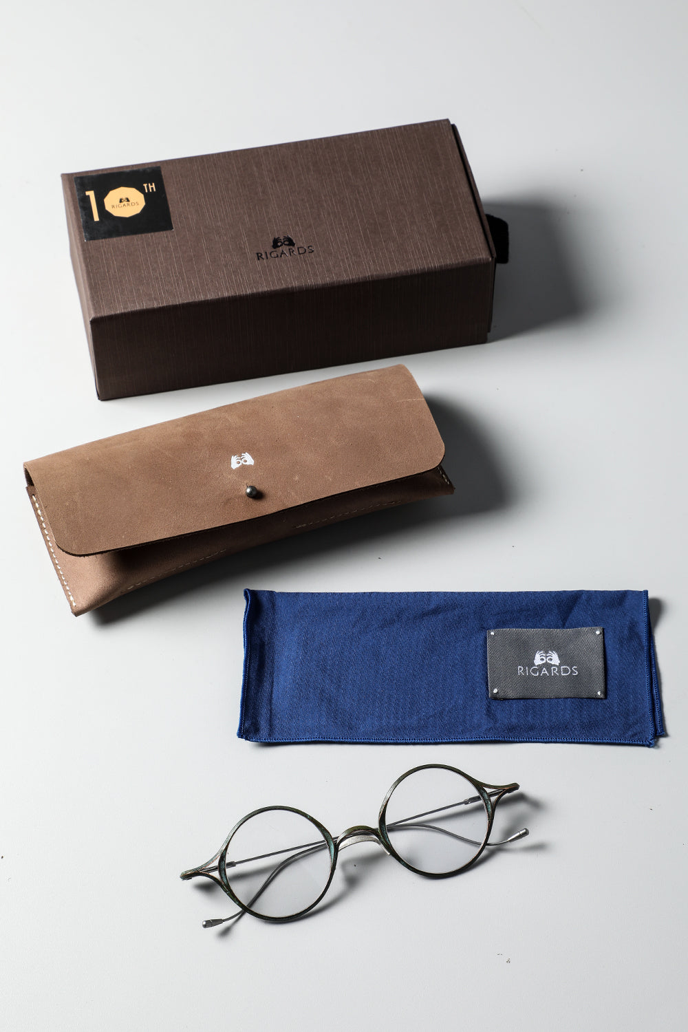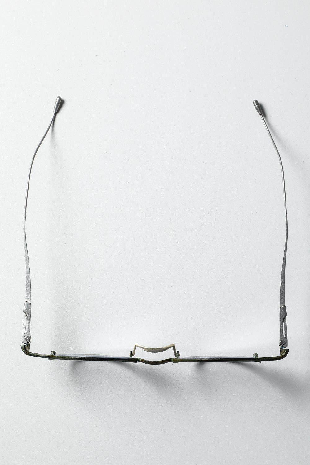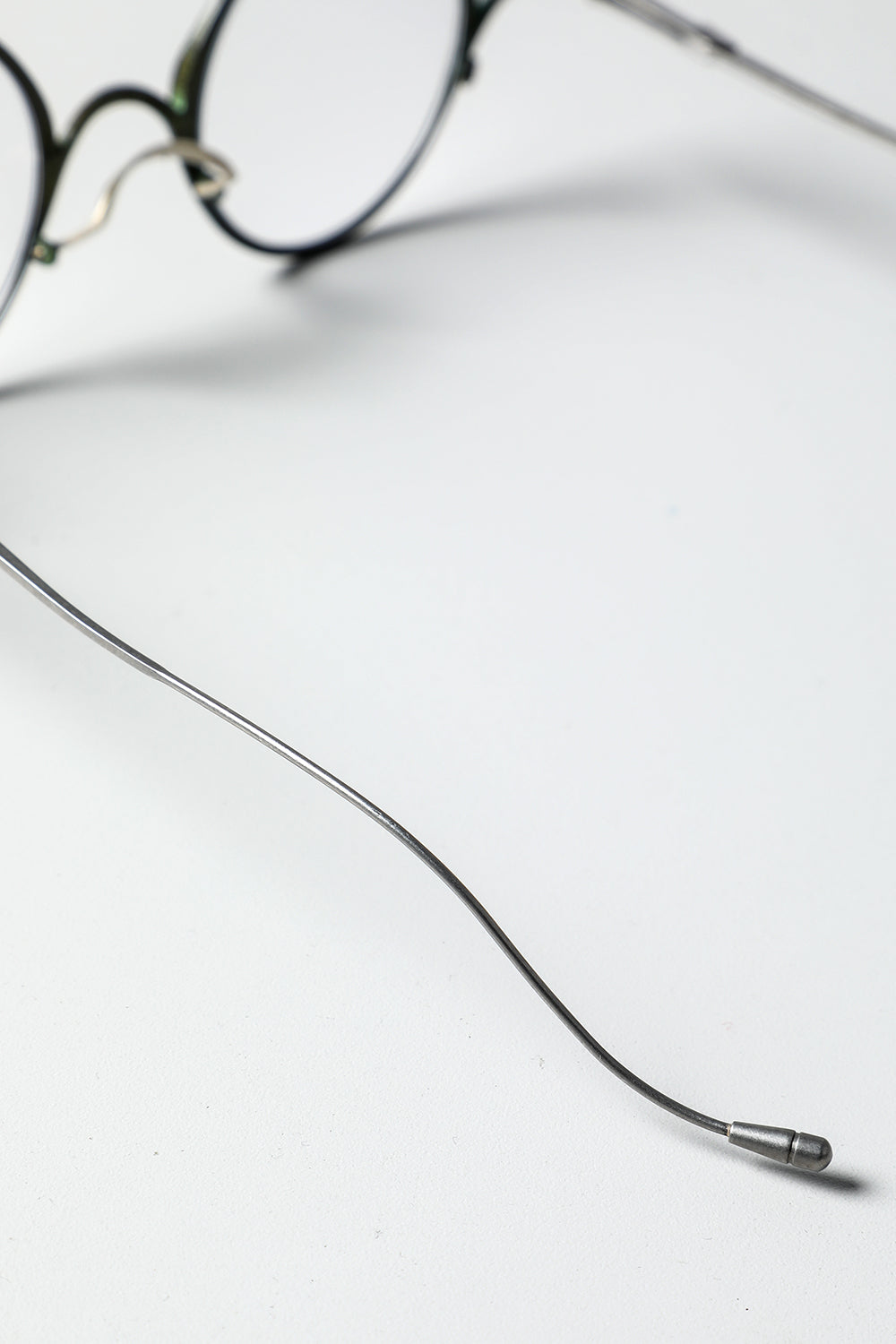 曲線の美しい純正チタンで作られたラウンドフレームのアイウェア。ブリッジからリム、ヨロイにかけて面に捻りを加えたシンプルながらも遊び心のあるデザイン。専用のスプリングヒンジで掛け易さも向上させています。カラーはアイアンを思わせる鈍く重たいグレーと腐食加工を施した青錆の2仕様。グレーは手磨きによるエイジングを施し、長年に渡り使い込んだ様なアジのある表情に仕上げられています。錆加工は独自に調合した特殊な薬品に漬け込んで色合いを調整しており、漬け込み時間はデザイナーの感覚で行うため、一点一点その表情が異なります。錆加工後に表面をコーディング保護してあるため、時間経過による変化も少なく、そのままの表情を楽しんでいただけます。