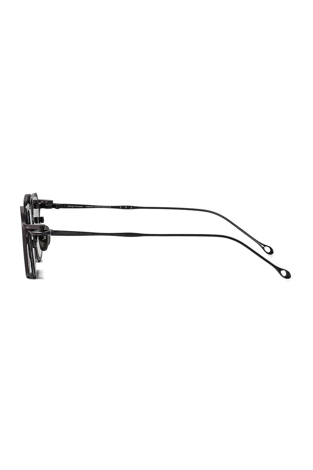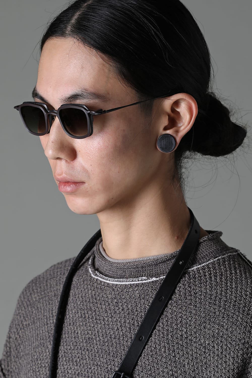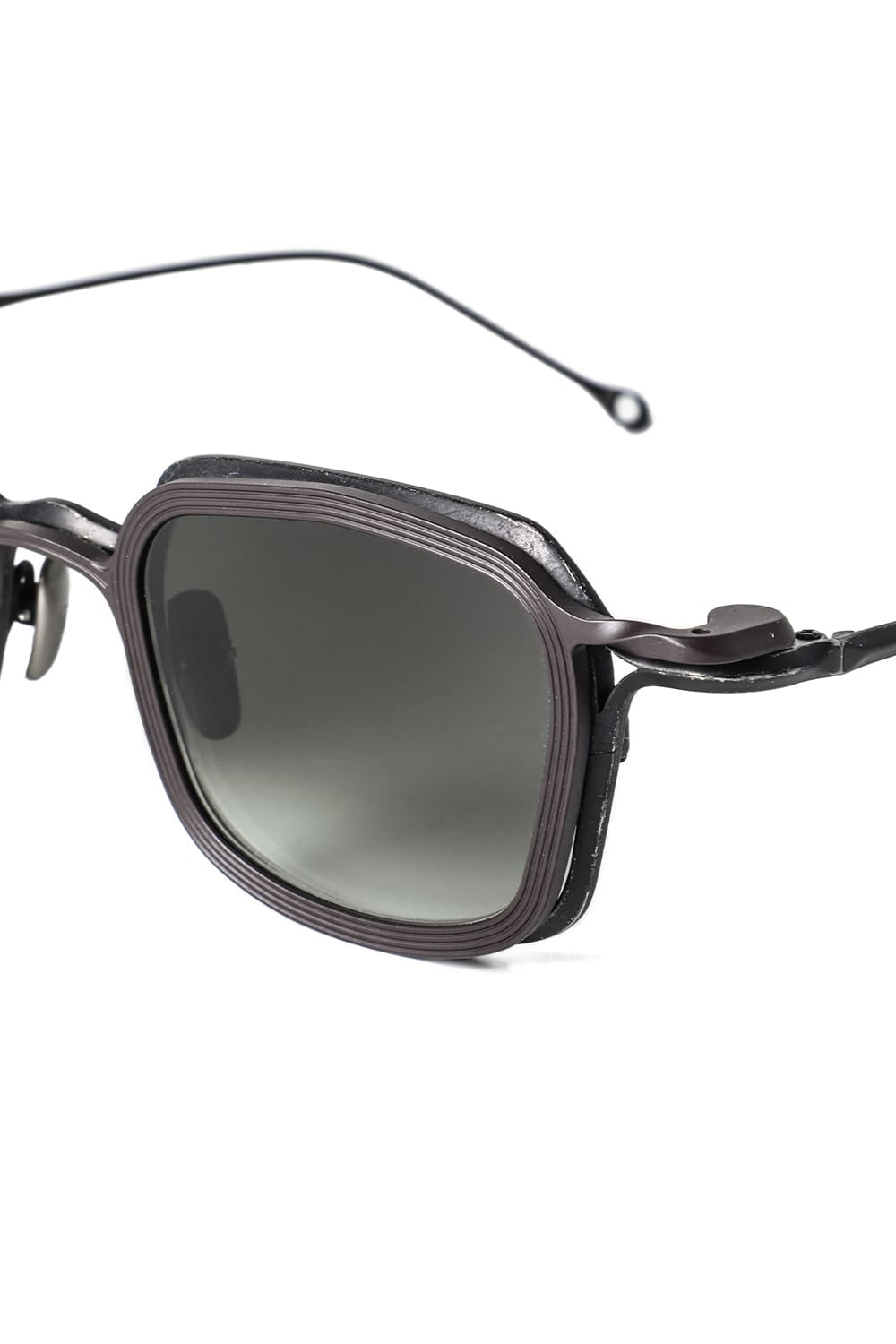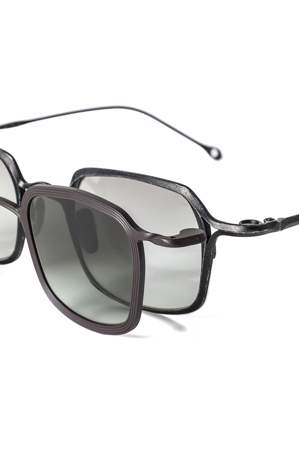 フレームはブラックのライトグレーレンズ、素材はチタニウム。クリップはダークブラウンのダークグレーレンズ、素材はアルミニウムを用いて制作。