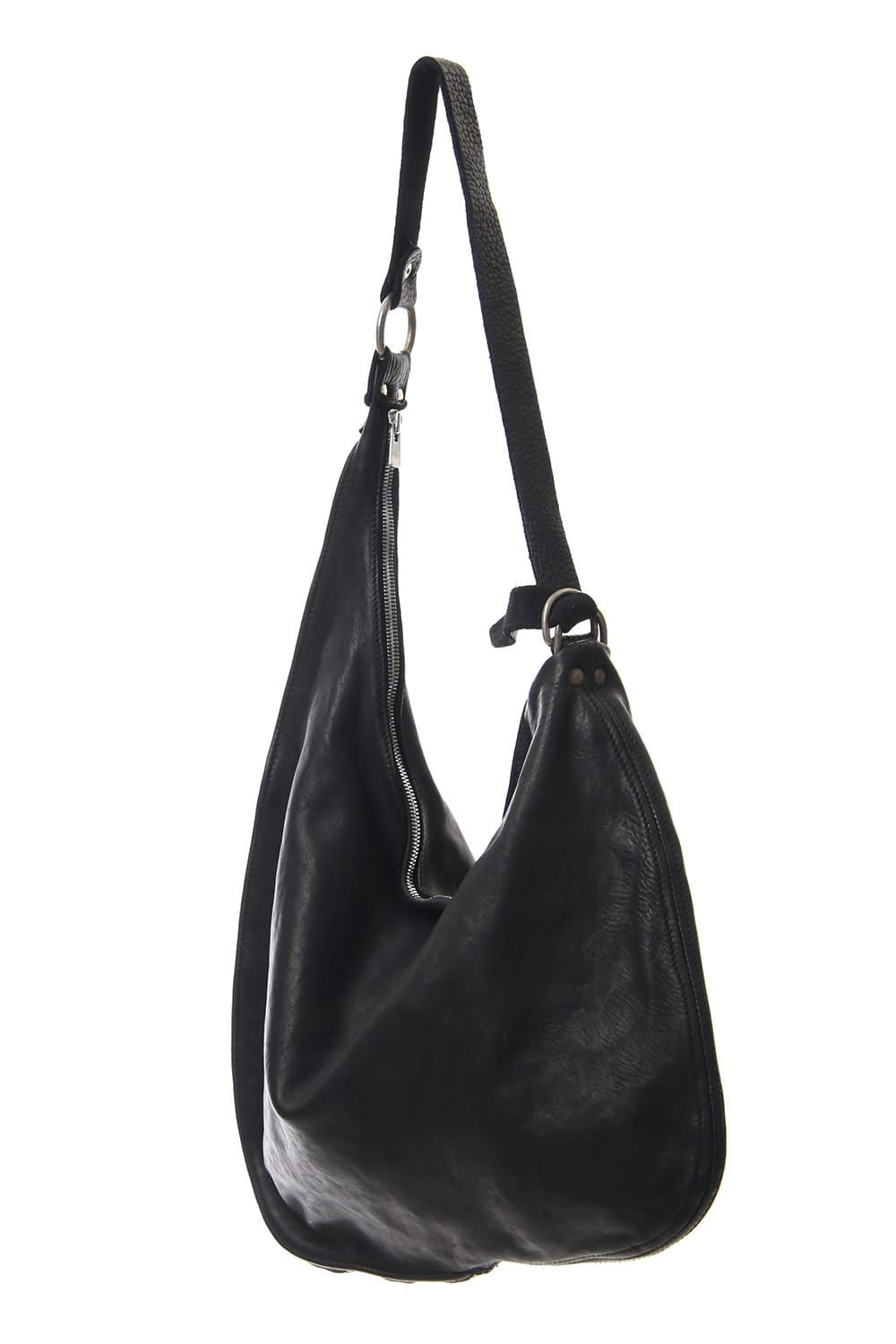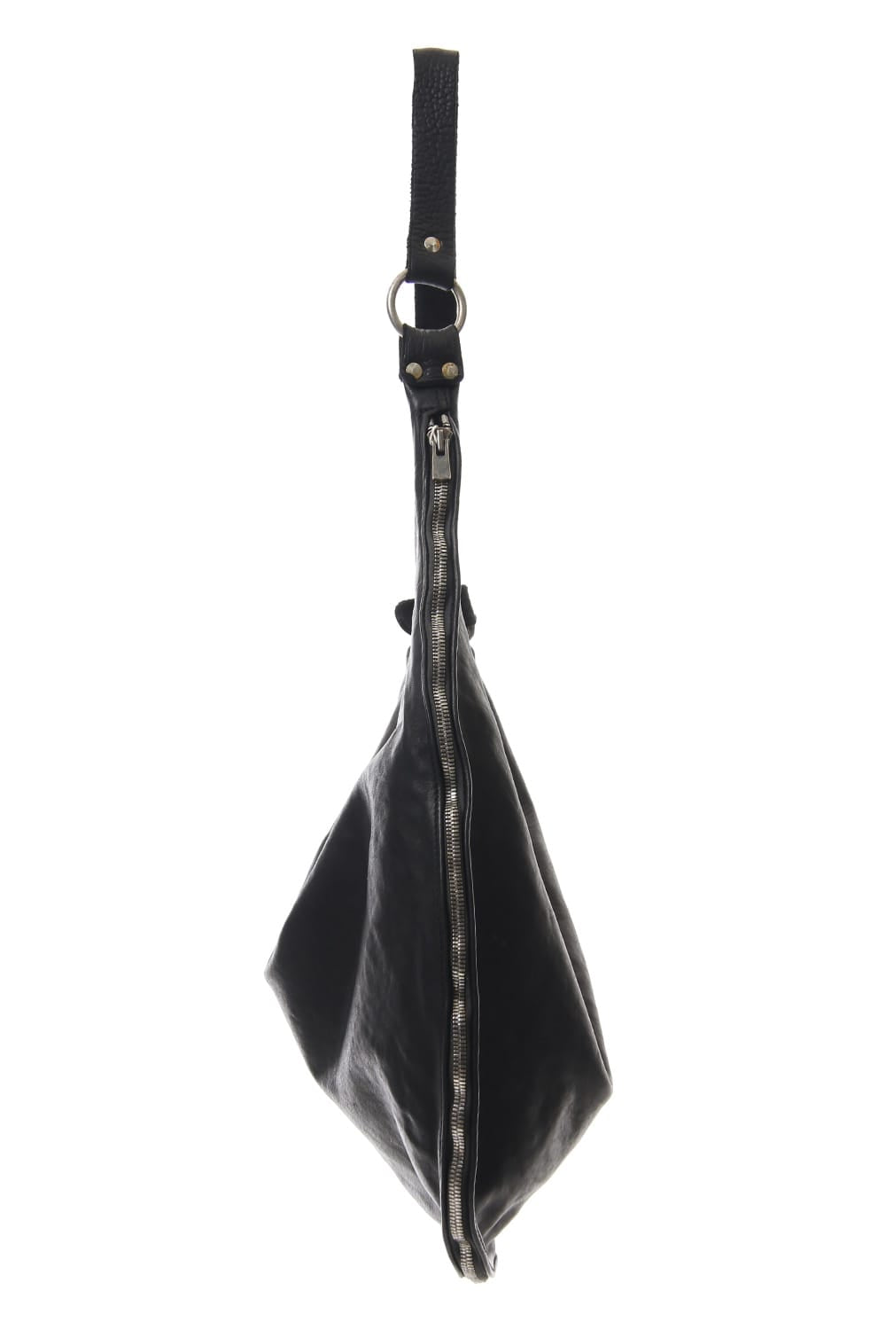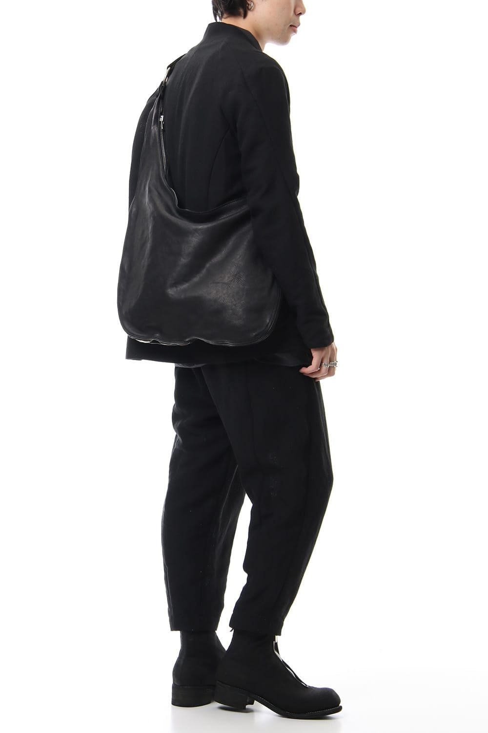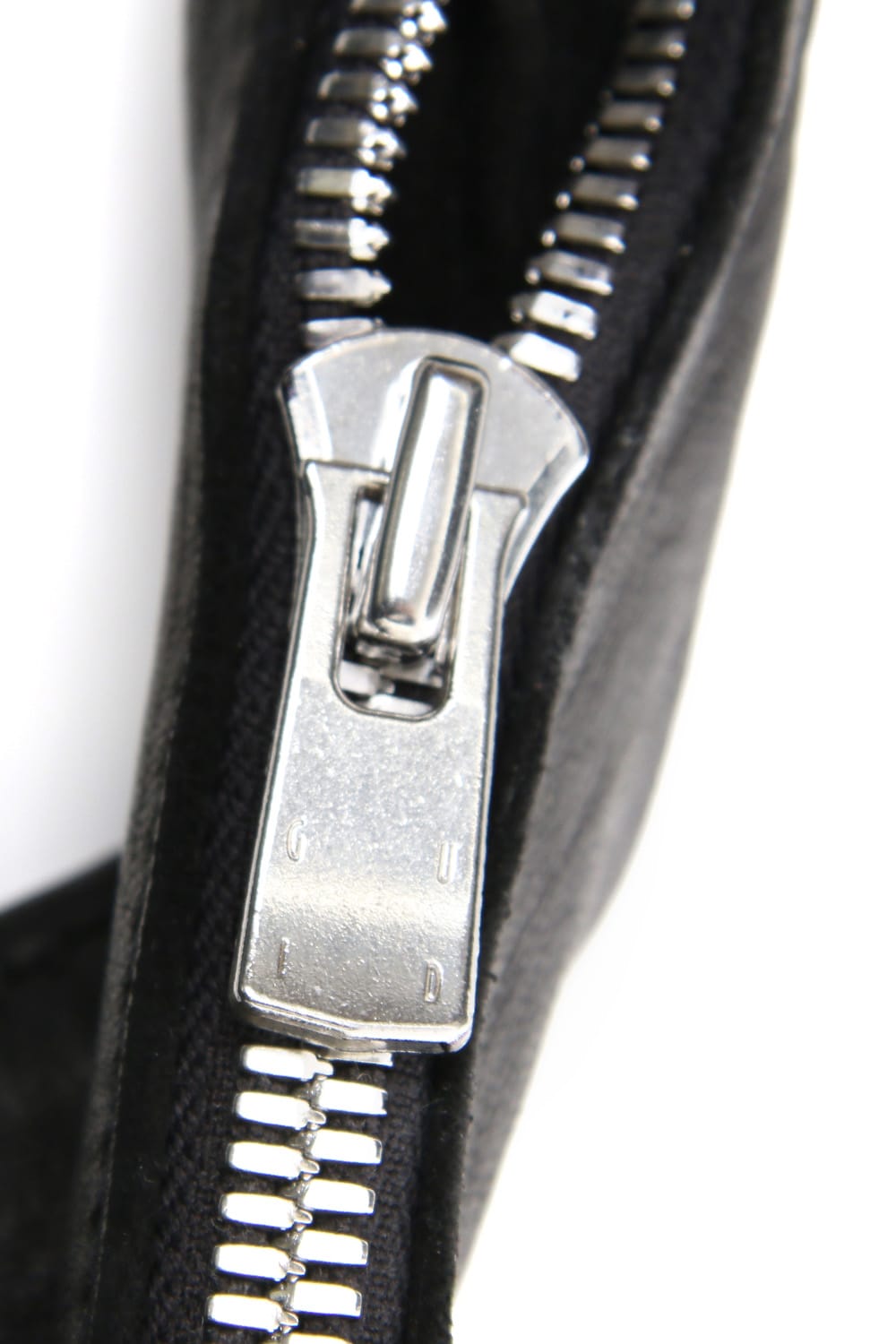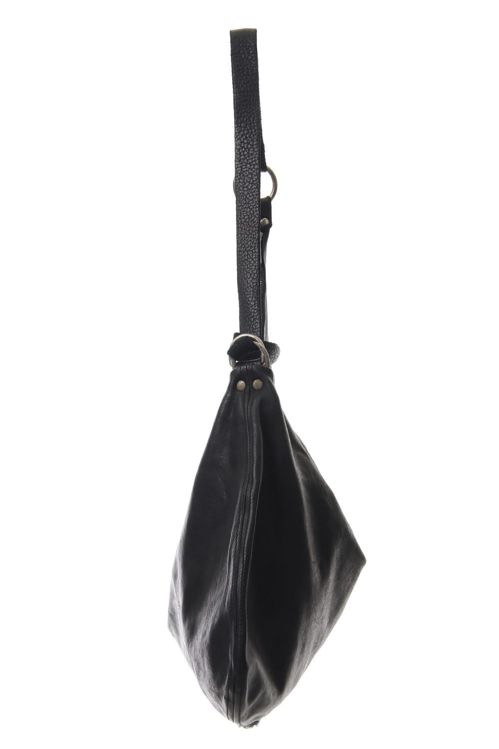 底から側面にかけて外側に走るファスナーはデザインだけではなく内側でメインポケットとは別の部屋に割れ、2層構造となった独特な機構となっています。また、ショルダーベルトとの継ぎ目に使用された荒々しい質感の丸カンもアクセントとなっています。