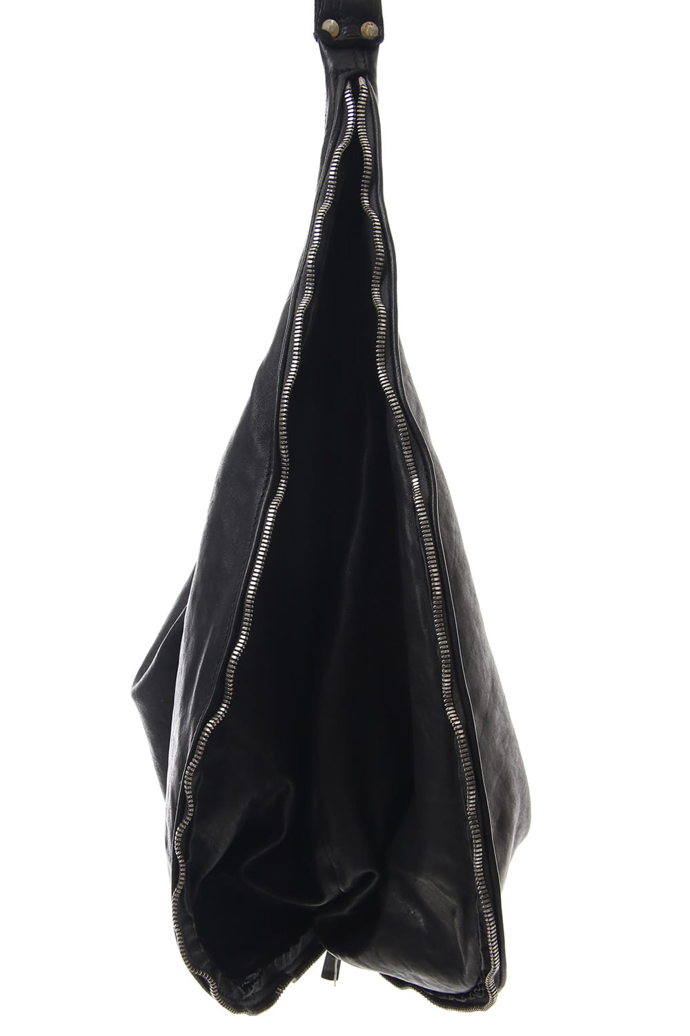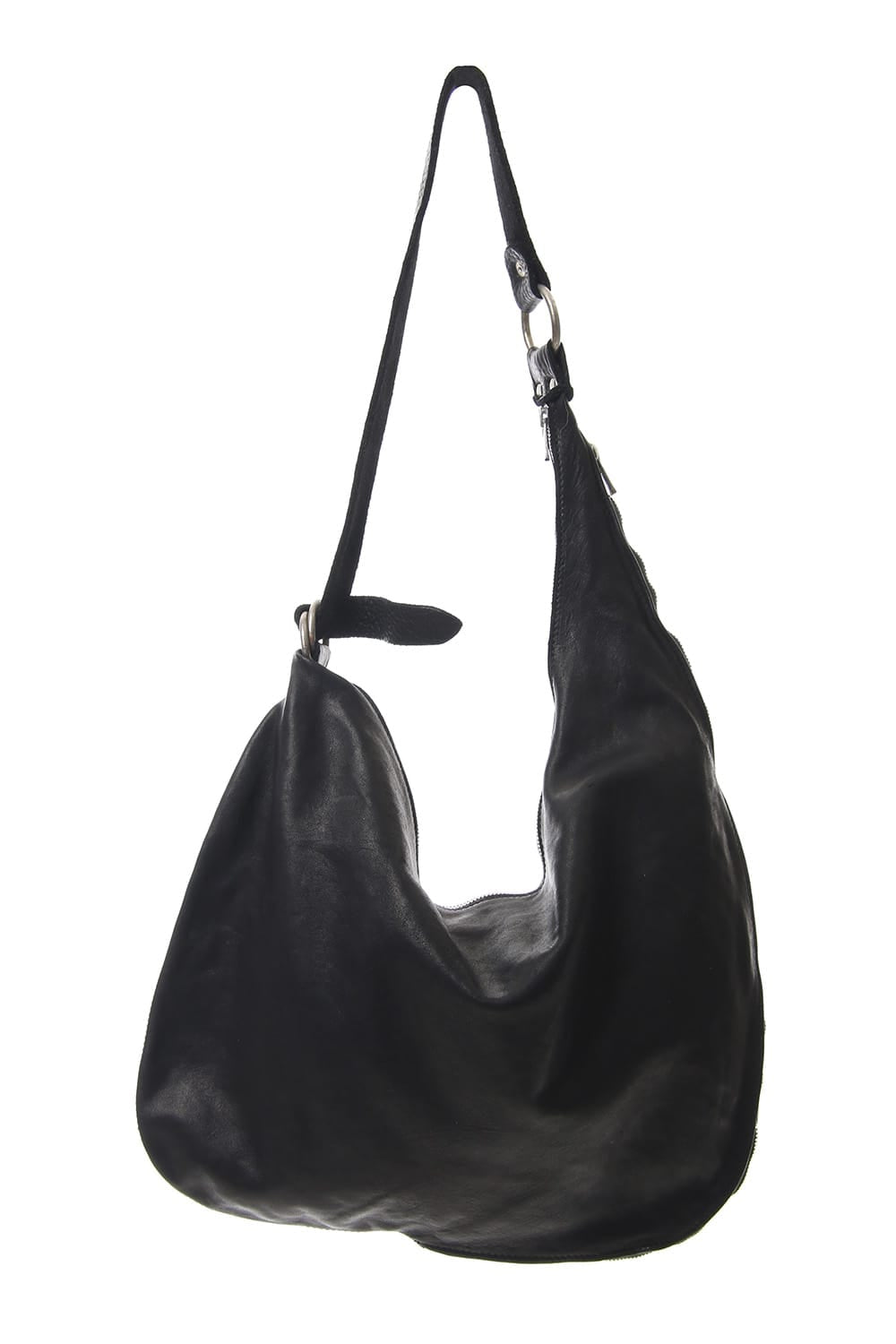 バッグ上部と底の中心から側面にかけてファスナーが配されたレザーショルダーバッグ。