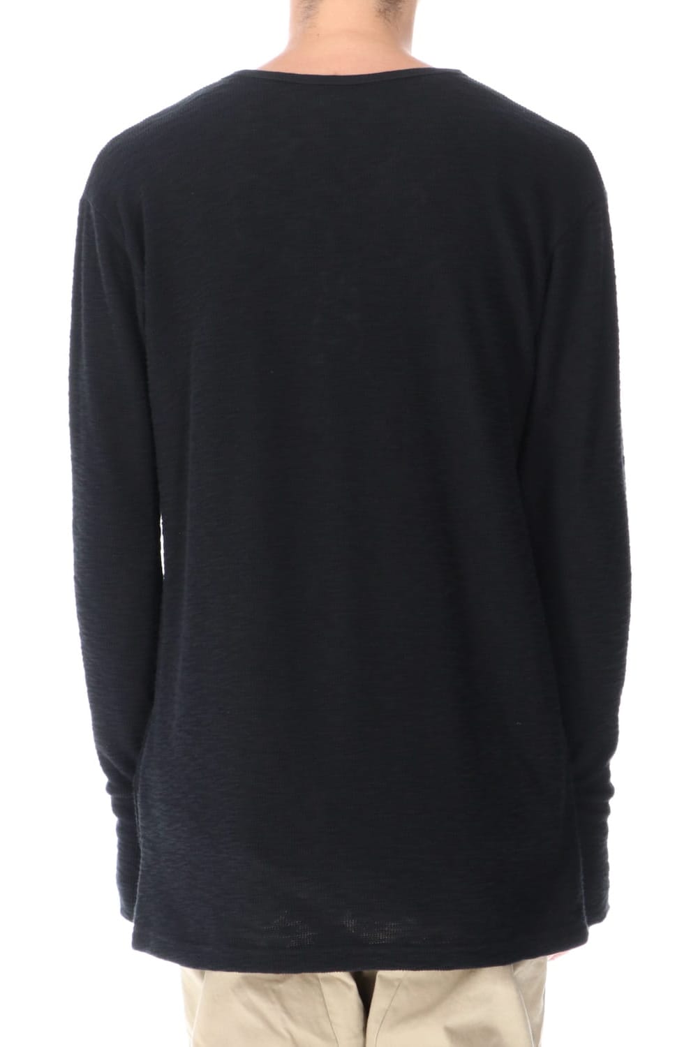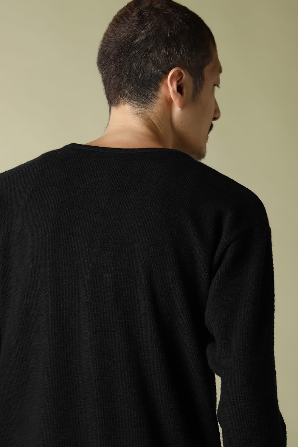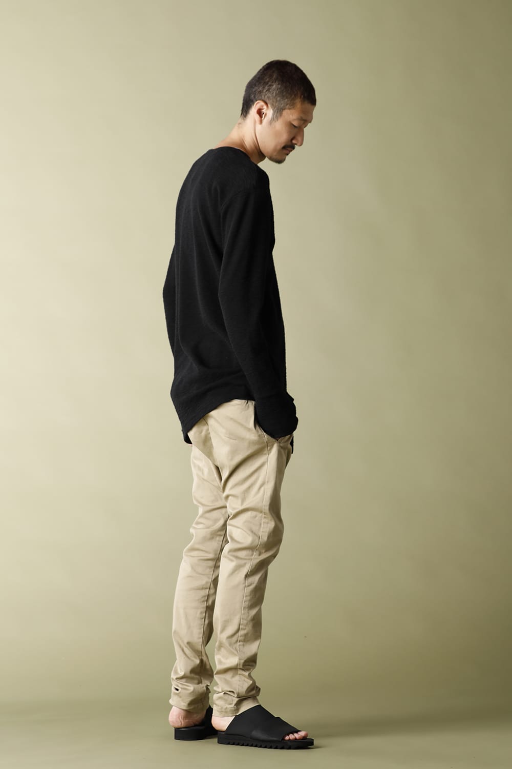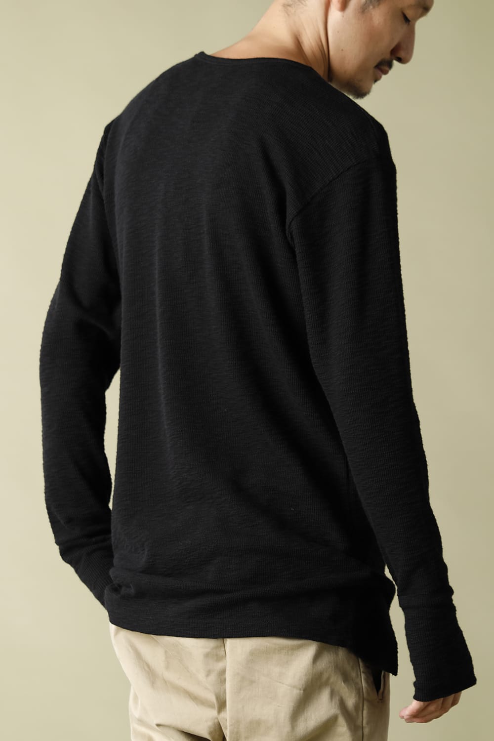 糸染めをしたスラブ糸と、染無しのスラブ糸を編立てた後に、オーバーダイを施すことで絶妙なムラ感と独特な風合いな表情を持つ素材です。