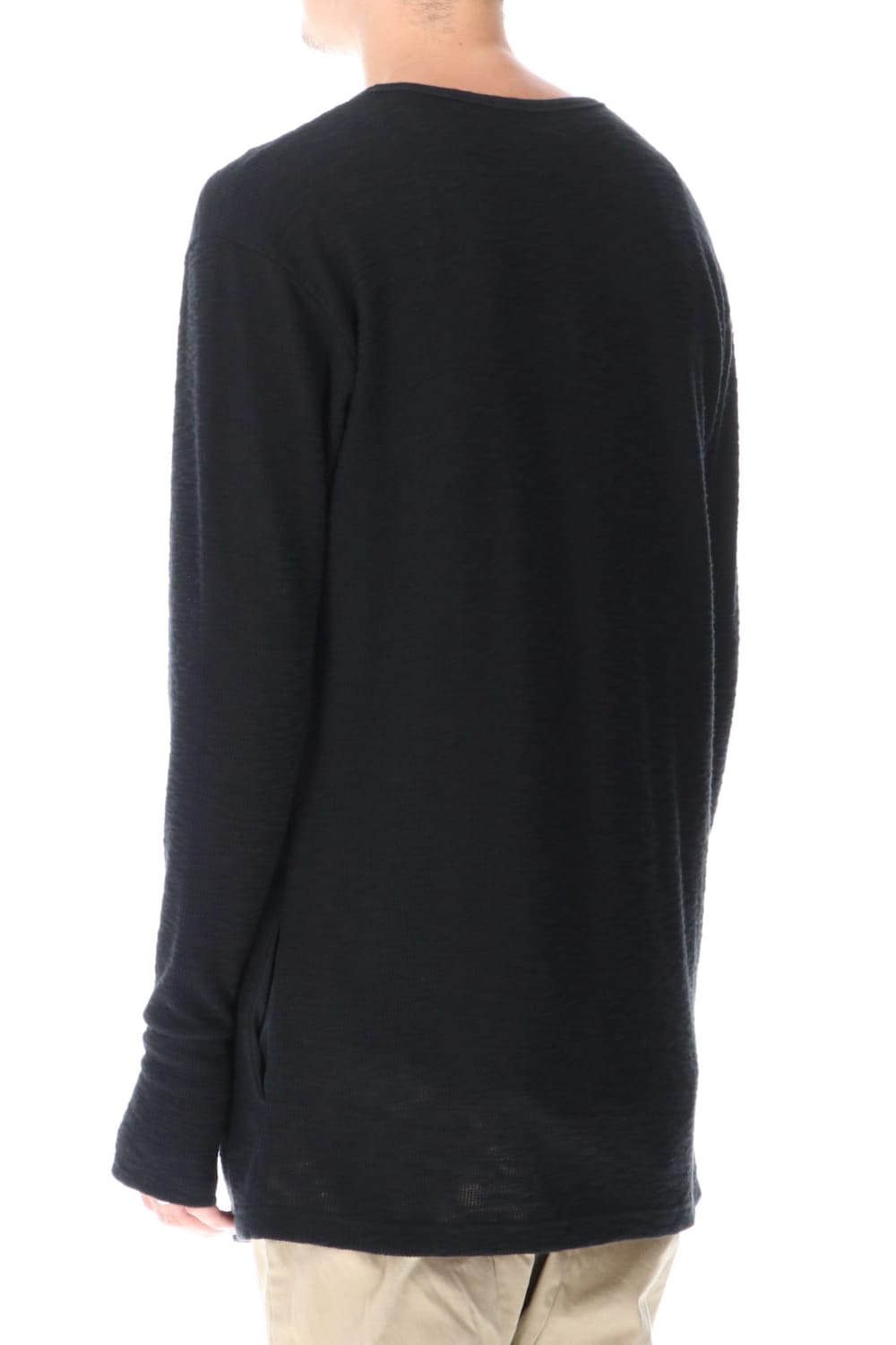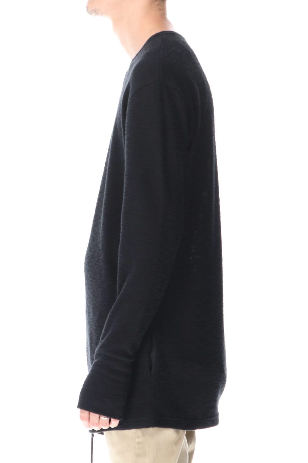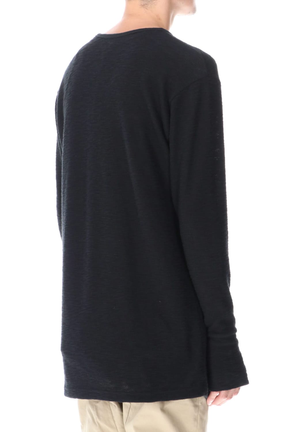糸染めをしたスラブ糸と、染無しのスラブ糸を編立てた後に、オーバーダイを施すことで絶妙なムラ感と独特な風合いな表情を持つ素材です。