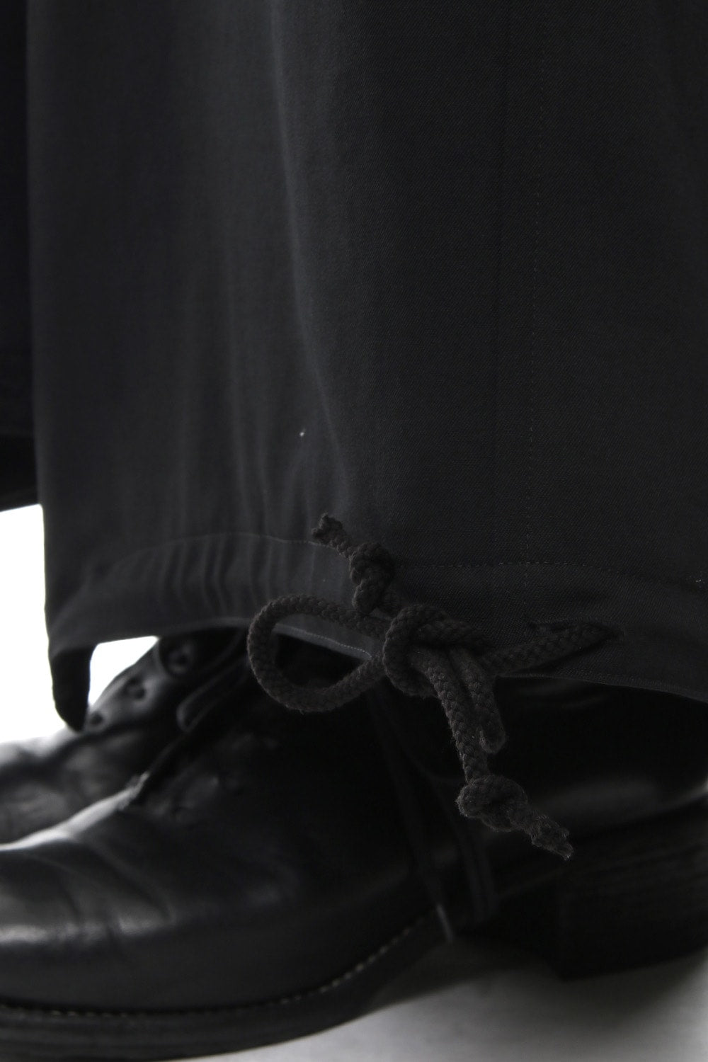 裾に11個のボタンと、ドローストリングが入っており、ボタンを閉めるとサルエルシルエット。ボタンを空けるとスカート。ドローストリングの使い方によっては、バルーンのようなシルエットも作ることが可能なボトムスです。生地はシワギャバを使用。シワギャバとは、ウールの仕上げ工程で極小のシワやシボをつけウール本来の風合いをだし、生地の落ち感で美しいドレープを生み出すヨウジヤマモトが数十年使い続けている定番の生地です。生地量も多いので、シワギャバ特有の美しい落ち感を楽しんでいただけます。