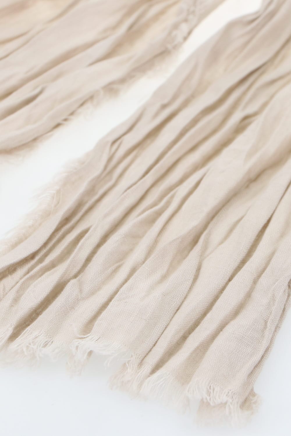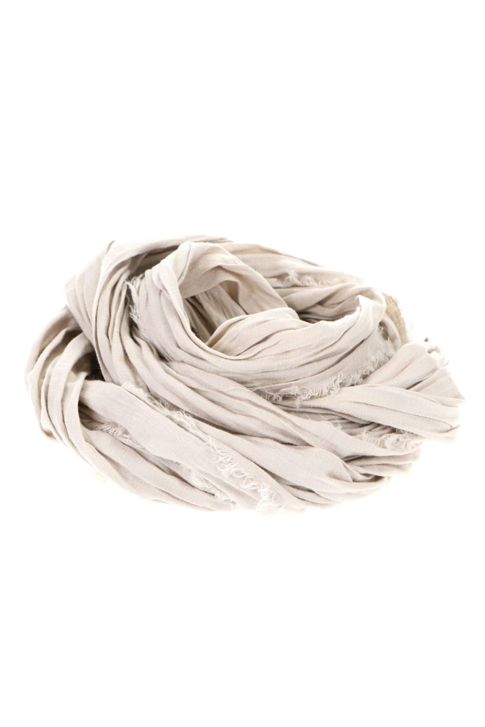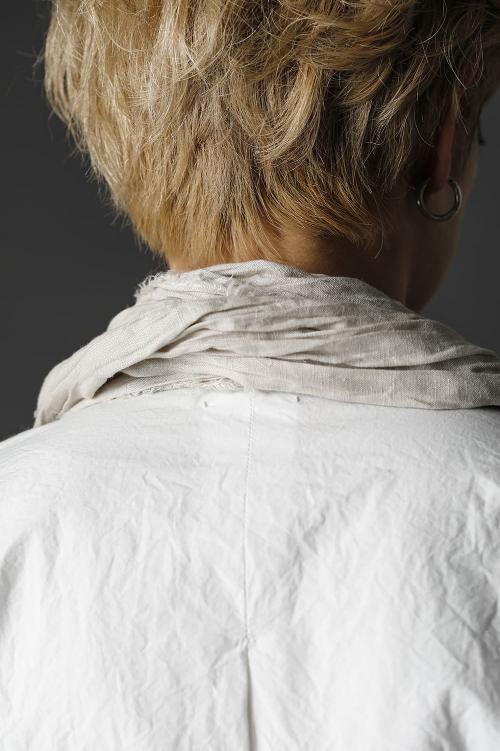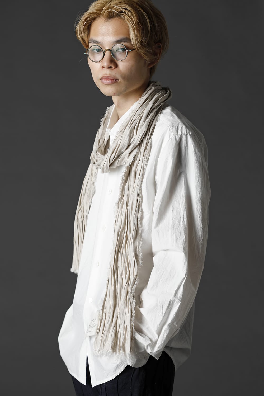 存在感のある皺が特徴的なストール。デザイナーによって選び抜かれた上質なフレンチリネンに敢えて洗いを掛けていただき、シュリンクさせ生み出されたANNASTESIAのエクスクルーシブモデル。 程良く品を残しながら飾らないアルチザンの表情がうまく融合した玄人感滲み出る雰囲気に仕上げていただきました。 皺により醸し出される空気を含んだような佇まいは春夏のトップスにアクセントを与えてくれる適度なボリューム感。着用感も軽快で涼しく愉しむことができるアイテムです。