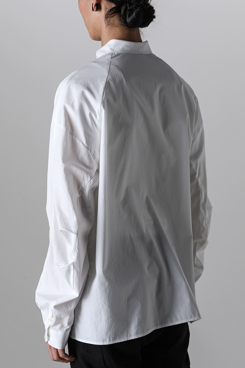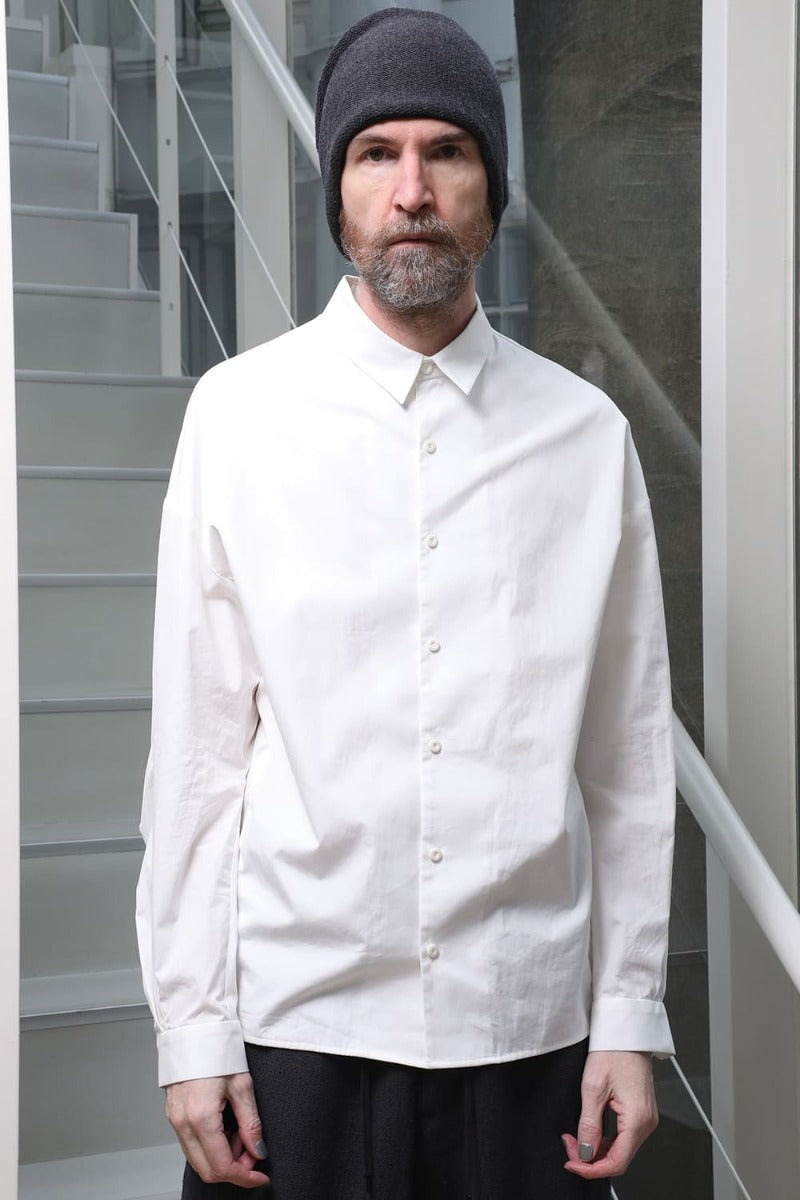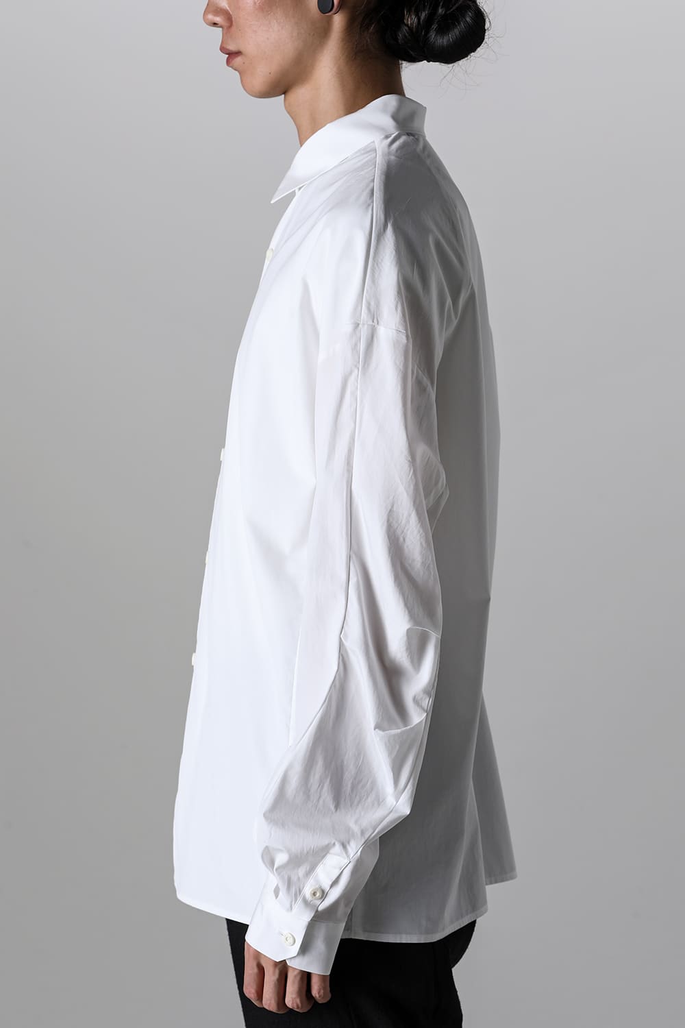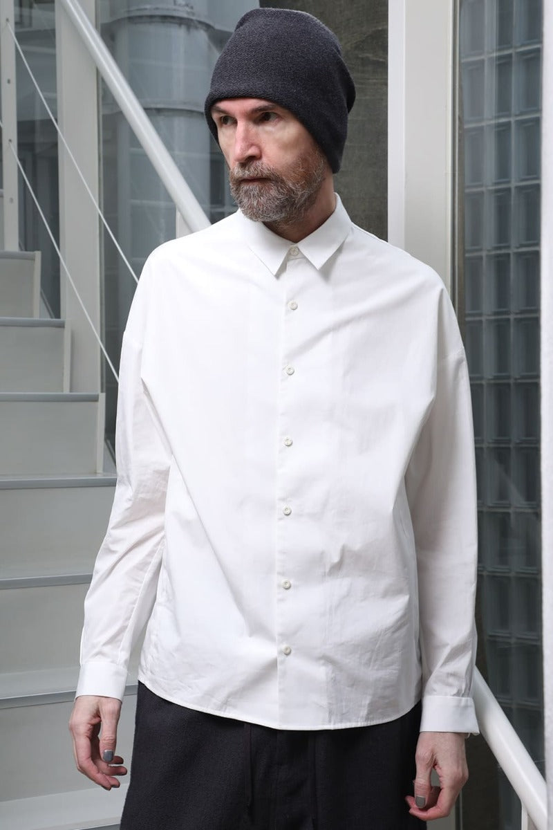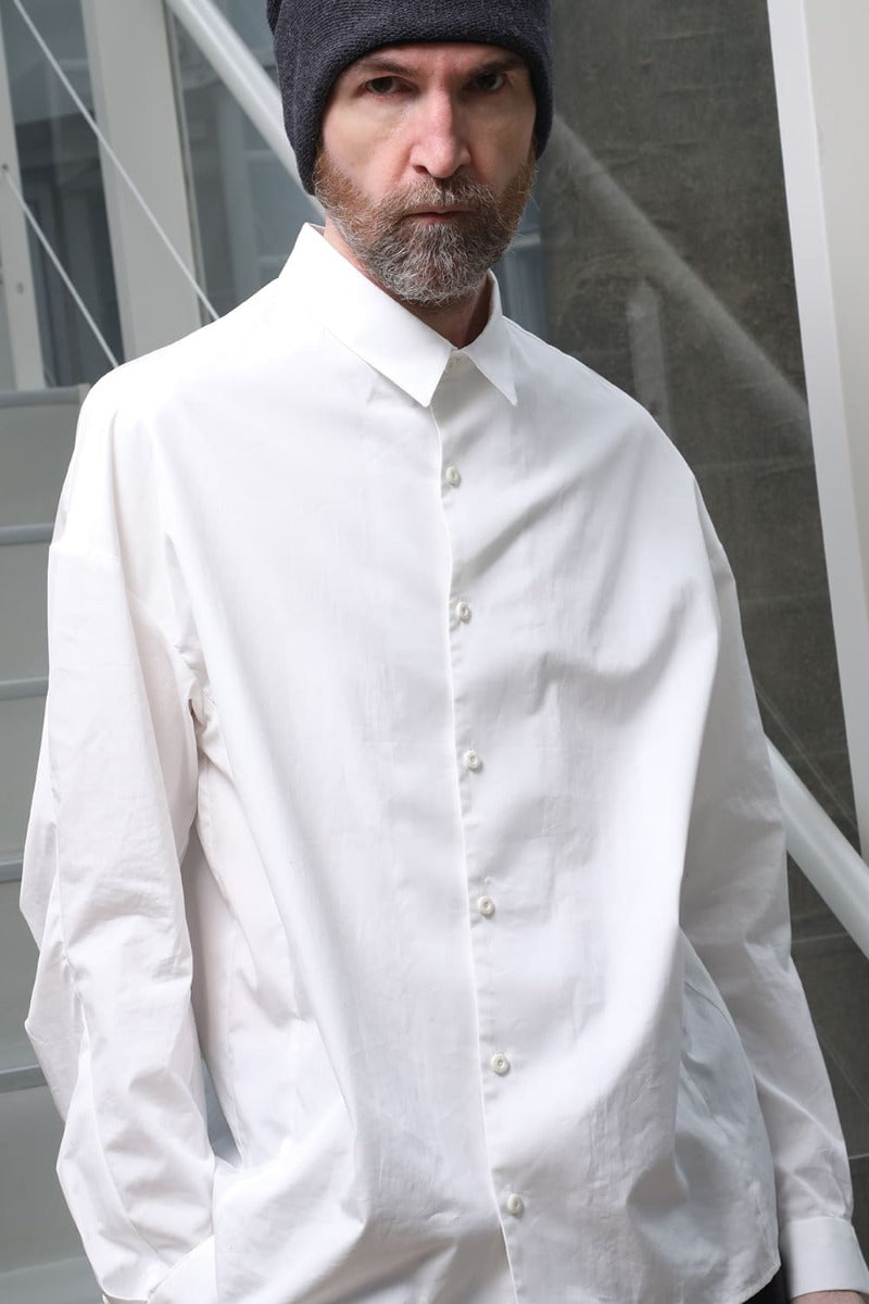 ドロップショルダーで身幅も大きく取った全体的にルーズフィットに製作されたレギュラーカラーシャツ。