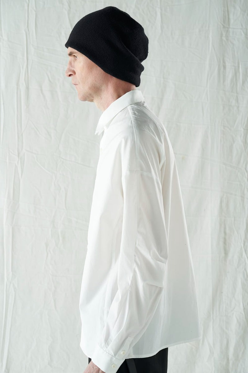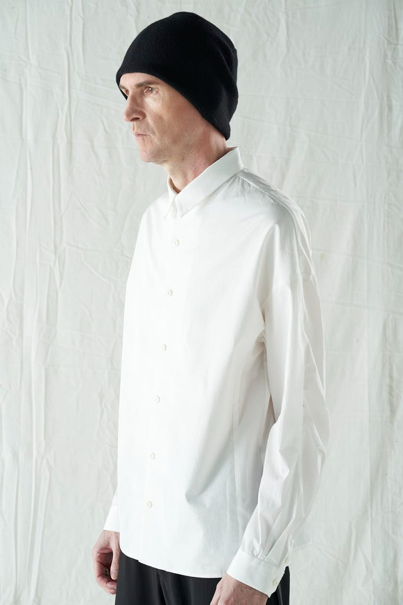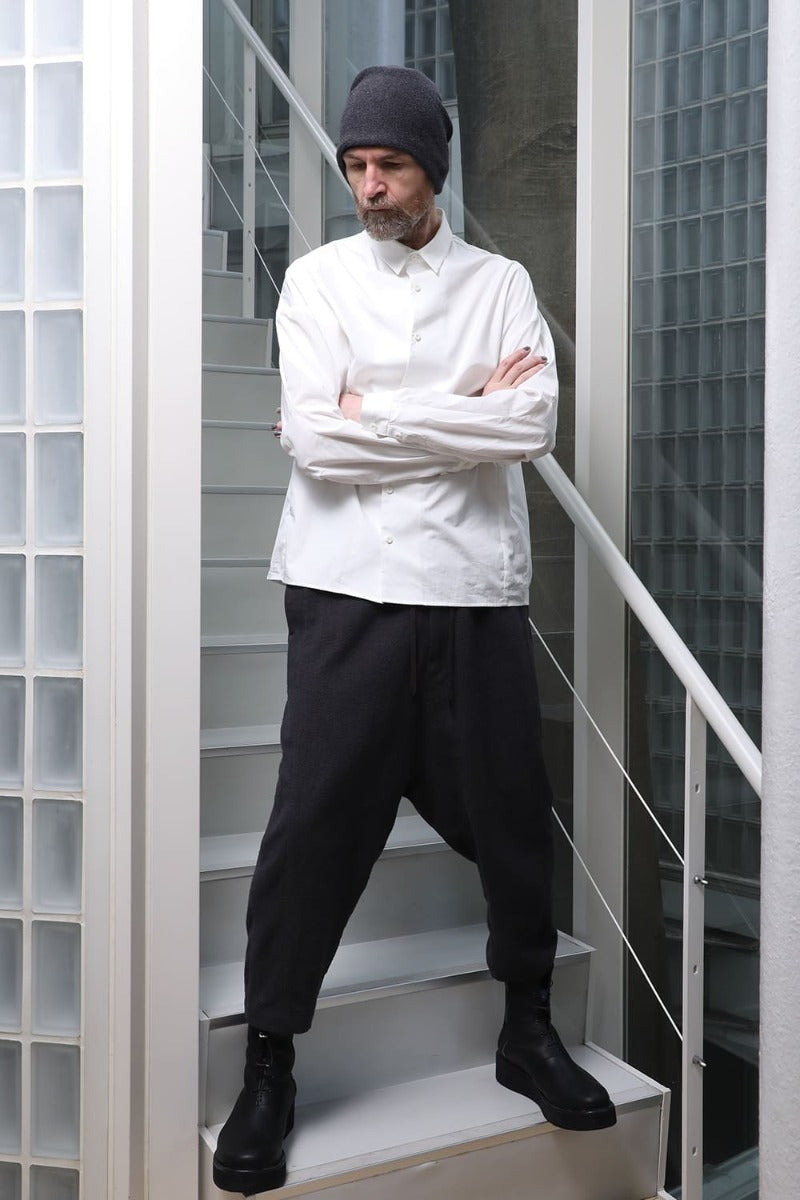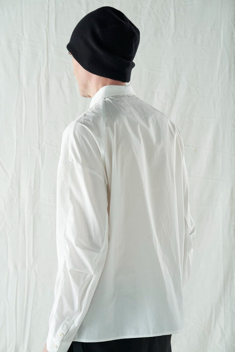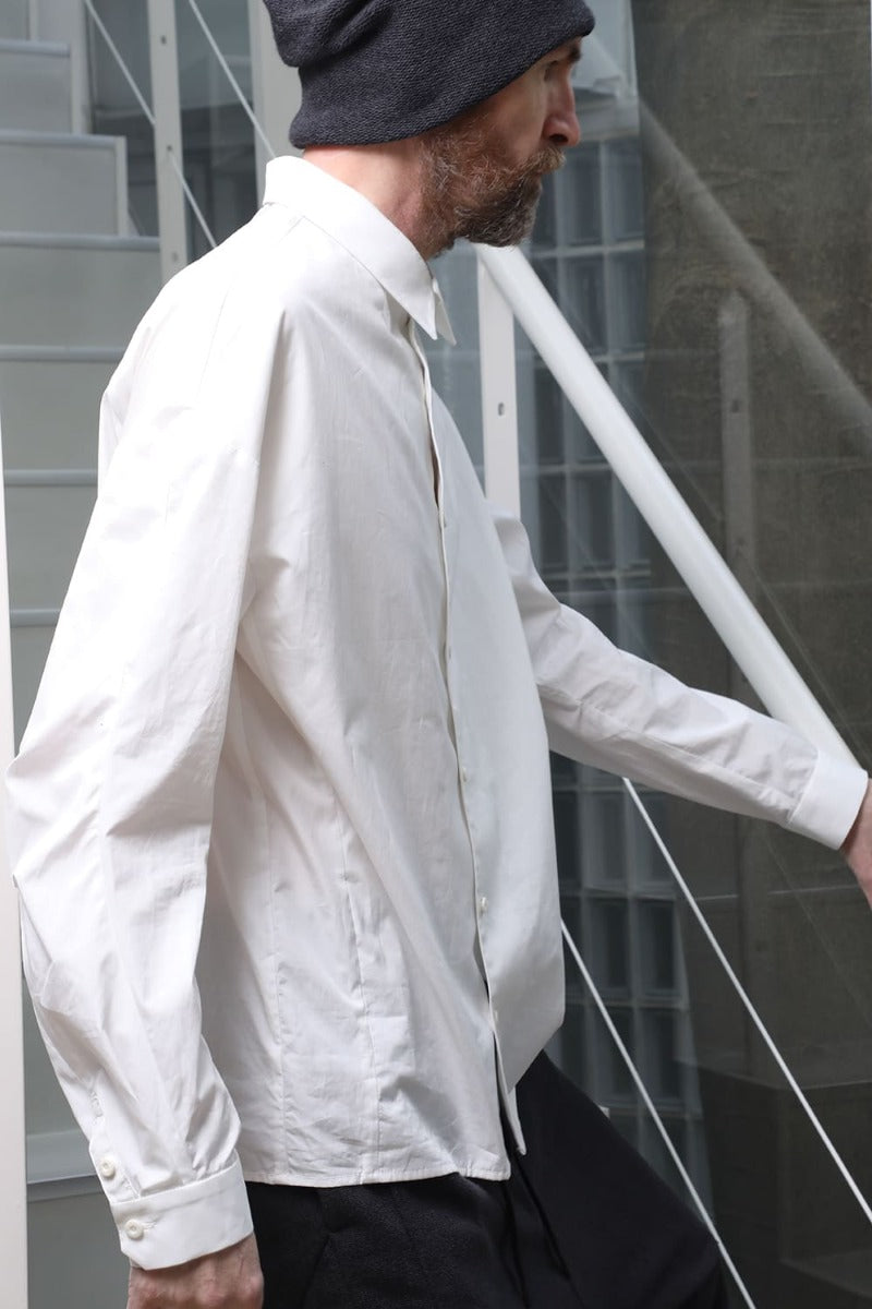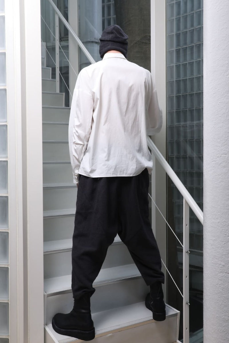 ドロップショルダーで身幅も大きく取った全体的にルーズフィットに製作されたレギュラーカラーシャツ。