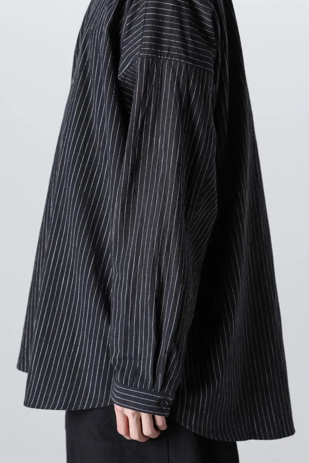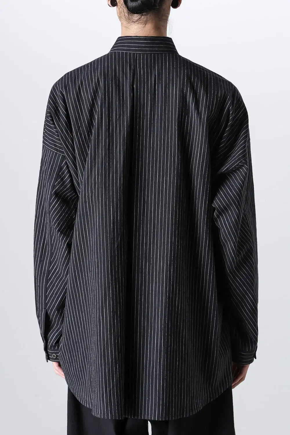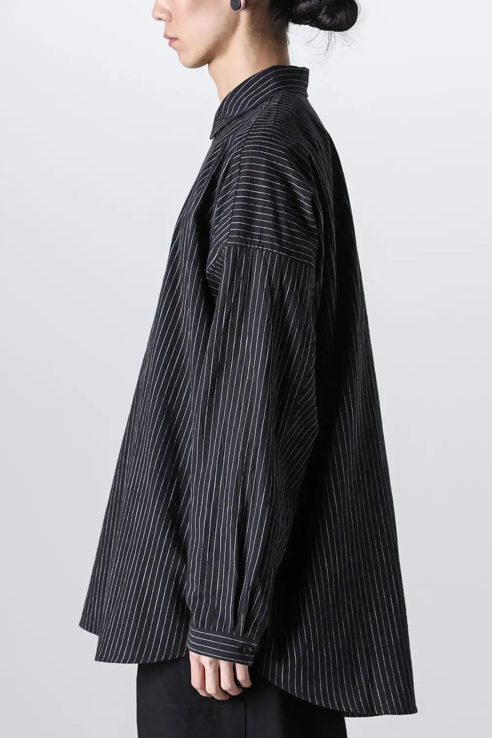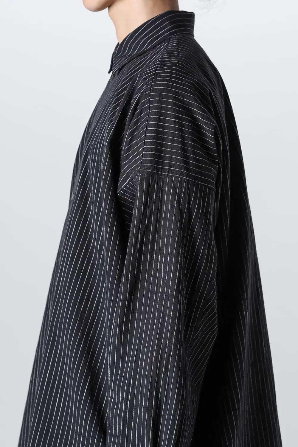 オーバーサイズのシンプルなロングスリーブシャツ。 着ていて楽なルーズシルエット、清涼感のあるドライタッチなコットン。 後ろ下りのシルエットや背中のプリーツの作り方、袖口がパススリーブ風になっていたりと、ところどころにらしいギミックが用いられています。