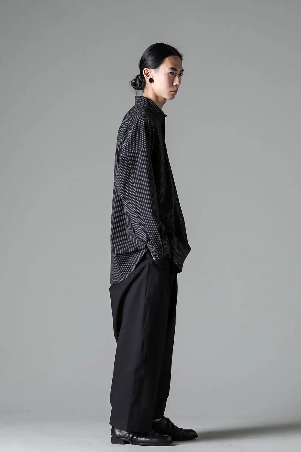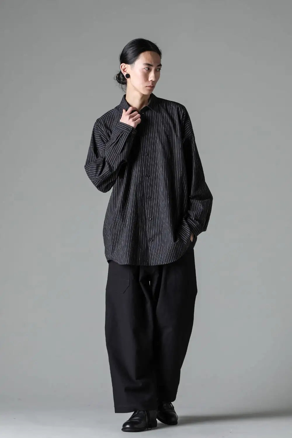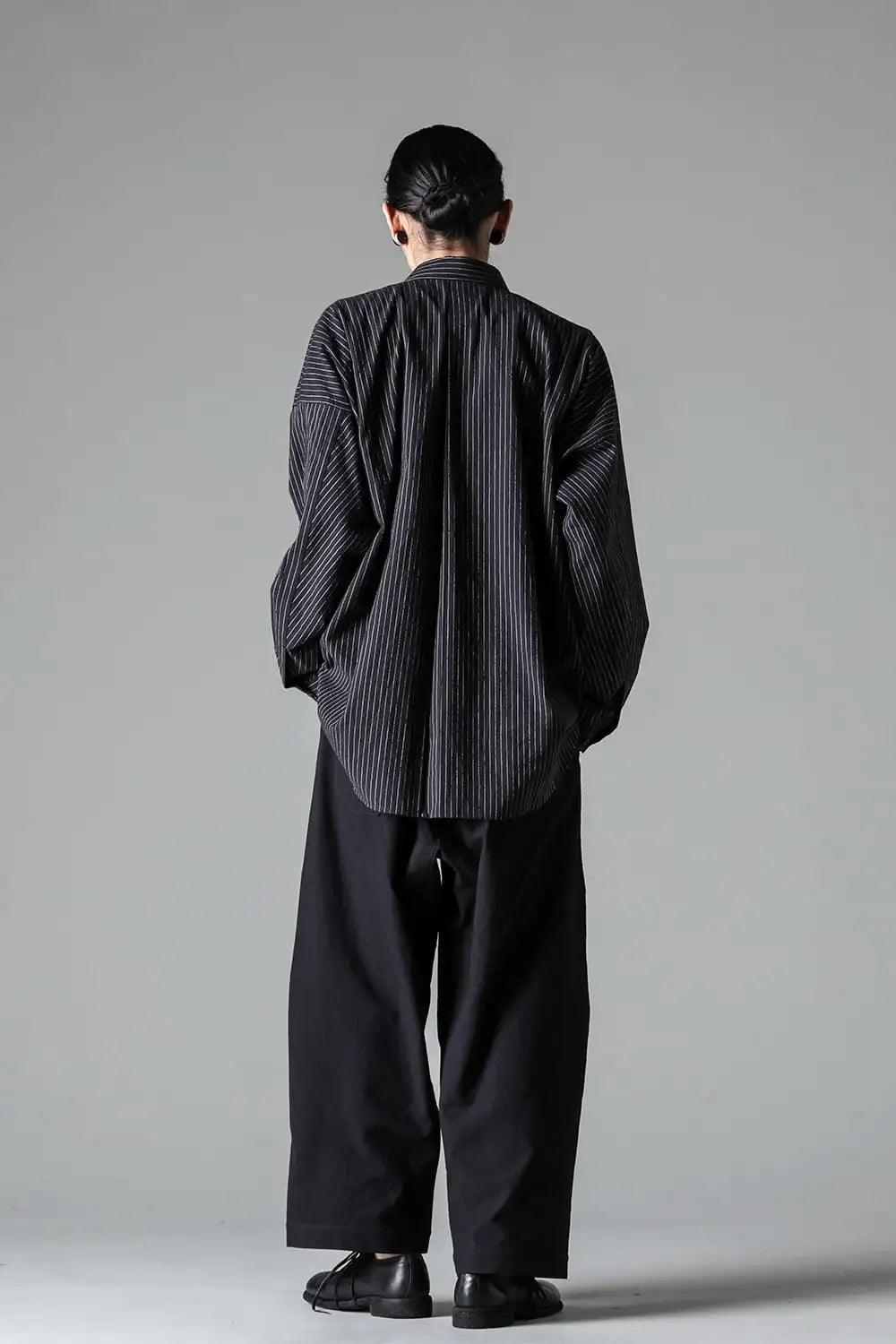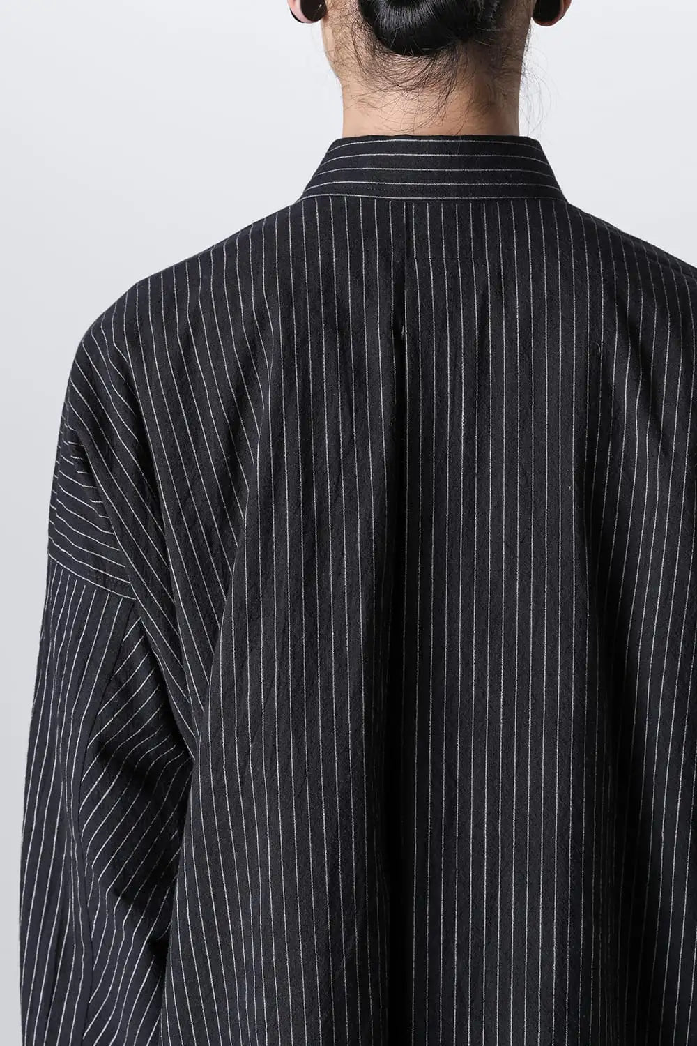 オーバーサイズのシンプルなロングスリーブシャツ。 着ていて楽なルーズシルエット、清涼感のあるドライタッチなコットン。 後ろ下りのシルエットや背中のプリーツの作り方、袖口がパススリーブ風になっていたりと、ところどころにらしいギミックが用いられています。
