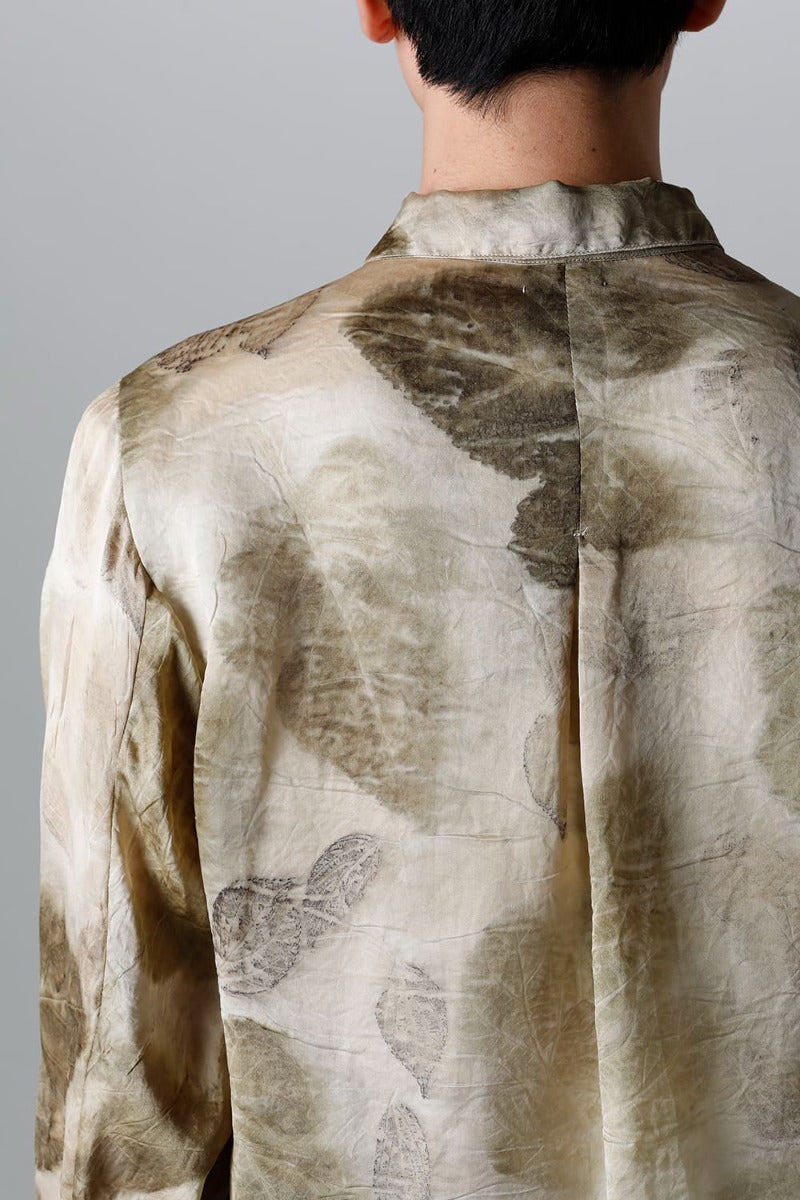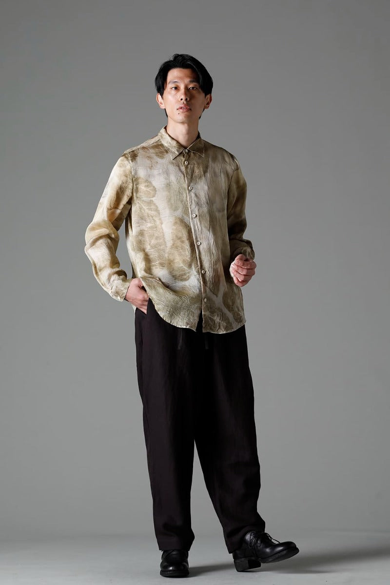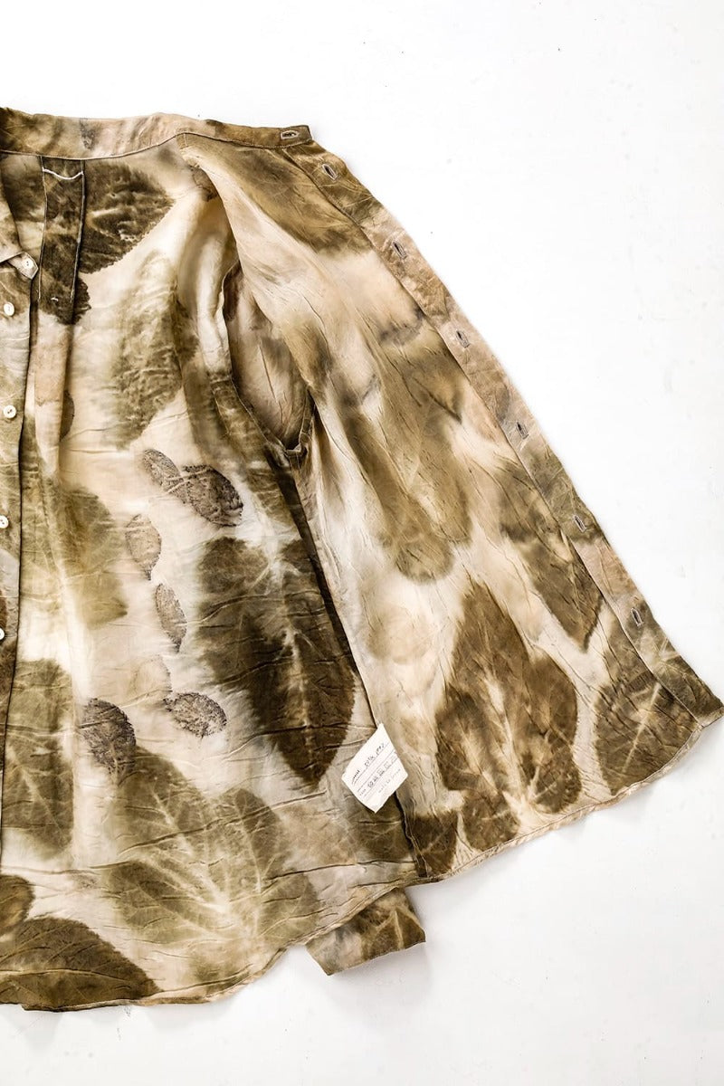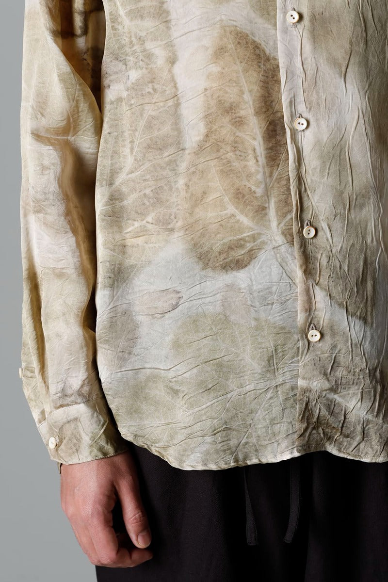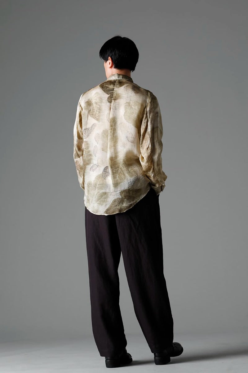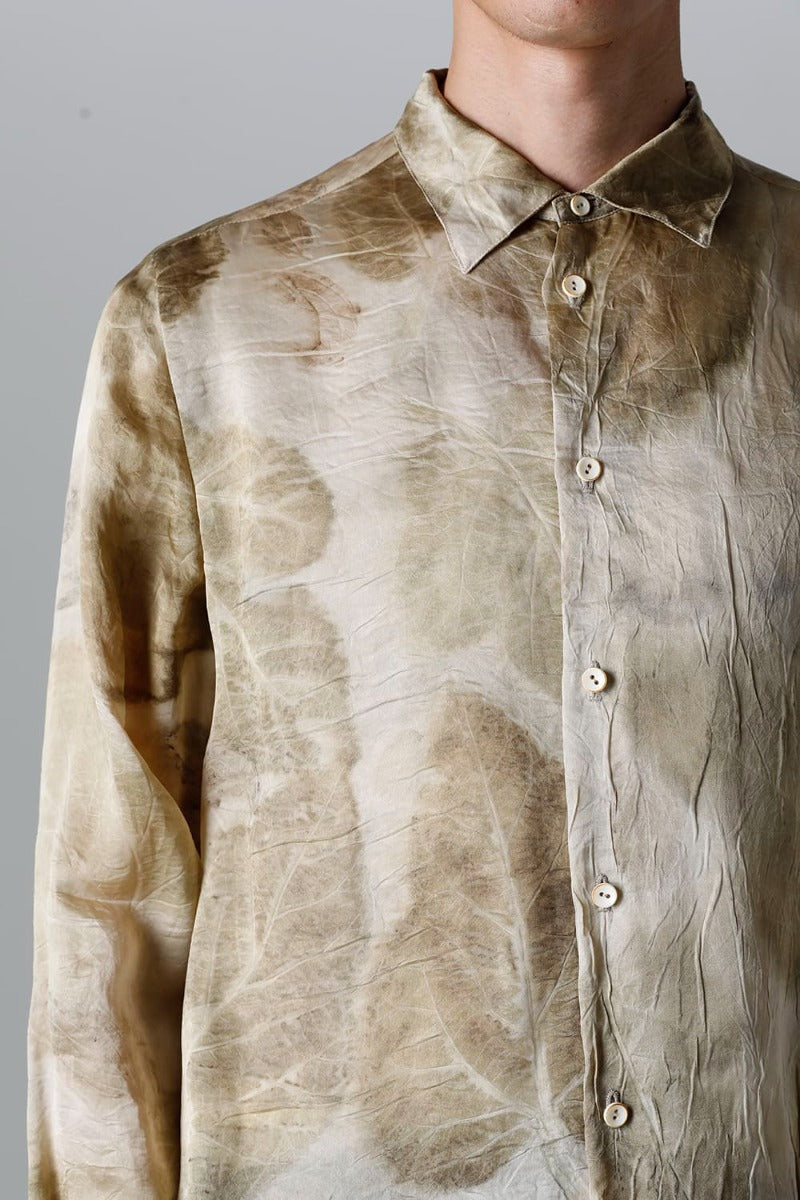 毎シーズン展開している定番シャツ。素材は、いつも使用しているシルクの工場が以前洪水に遭い、浸水して使えなくなったヴィンテージシルク。それらを引き取り、染色して新しい価値を生み出す生地へと再生した。プリントは天然の桑の葉などを生地に直接配置して熱を加えて転写した草木染。葉っぱの状態によって色の出方が異なり、自然が生み出す美しさと不均一さが面白い。同じ柄は一つとして無い一点物。