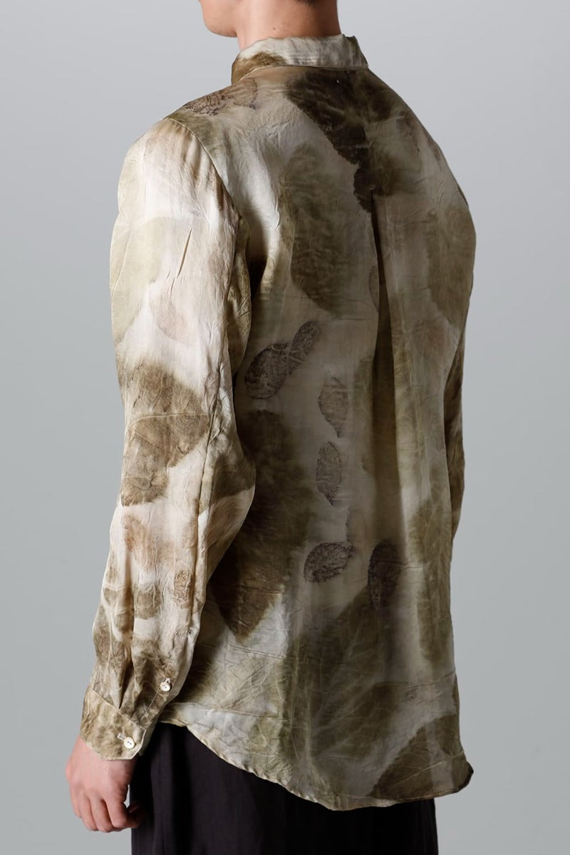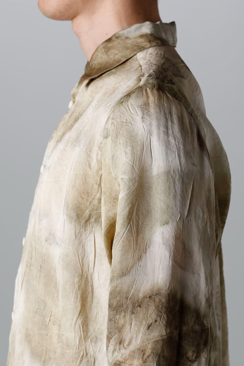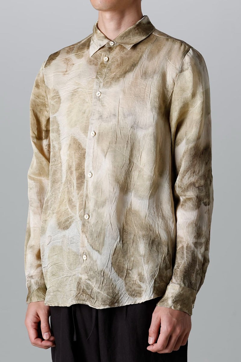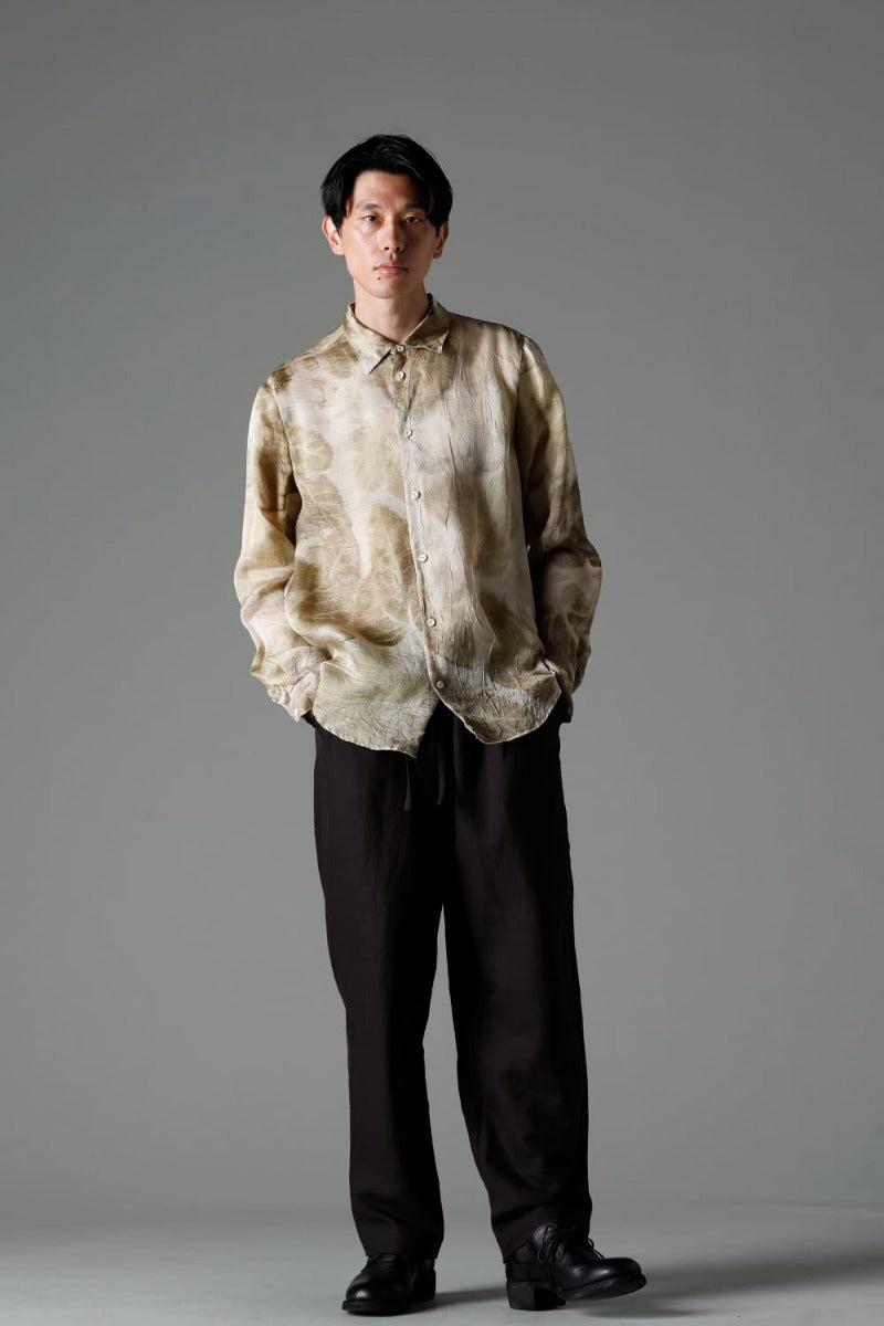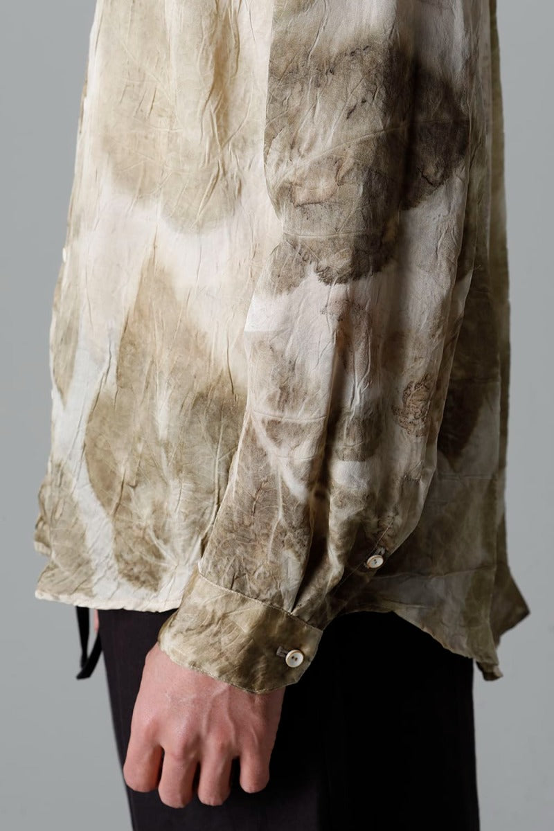 毎シーズン展開している定番シャツ。素材は、いつも使用しているシルクの工場が以前洪水に遭い、浸水して使えなくなったヴィンテージシルク。それらを引き取り、染色して新しい価値を生み出す生地へと再生した。プリントは天然の桑の葉などを生地に直接配置して熱を加えて転写した草木染。葉っぱの状態によって色の出方が異なり、自然が生み出す美しさと不均一さが面白い。同じ柄は一つとして無い一点物。