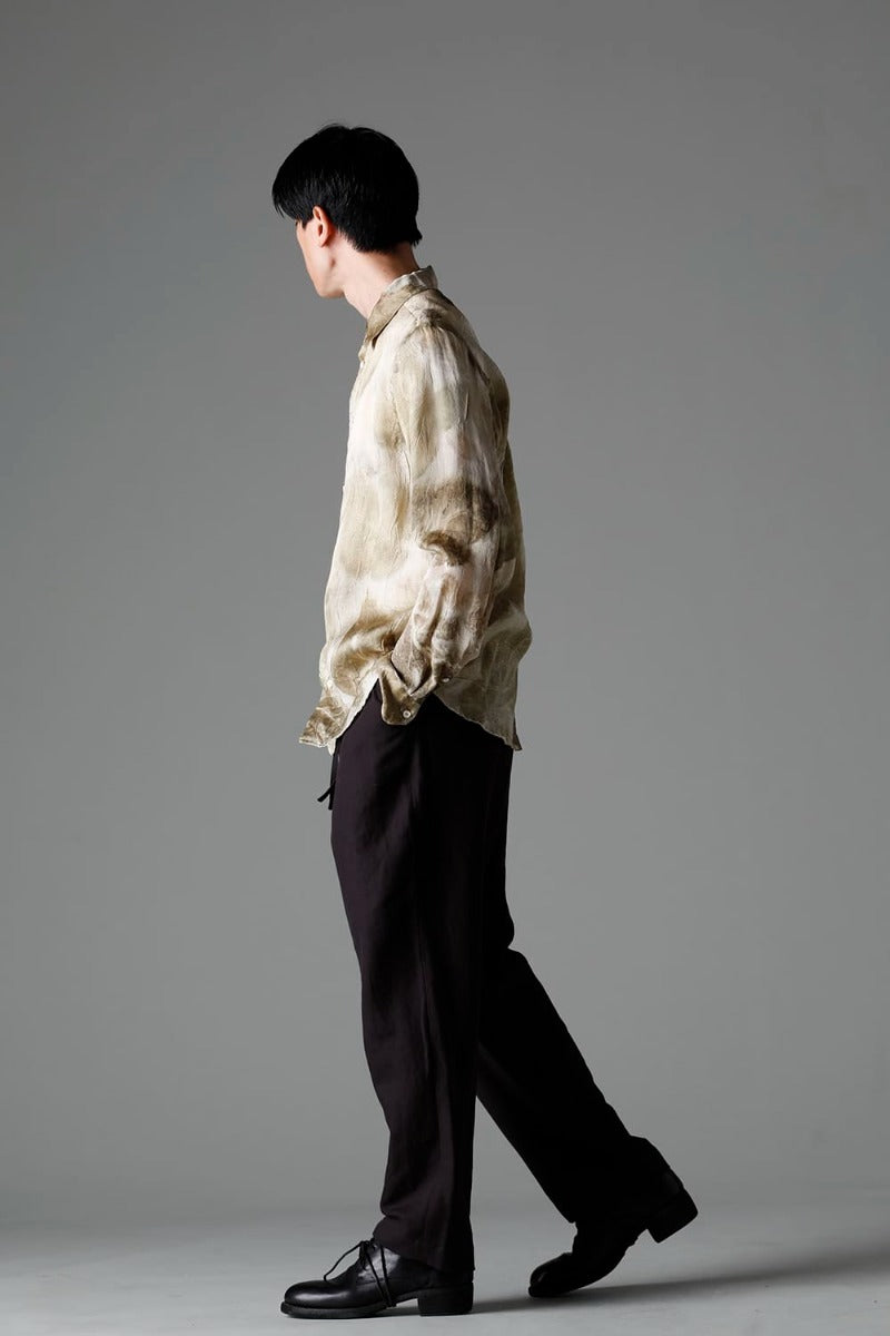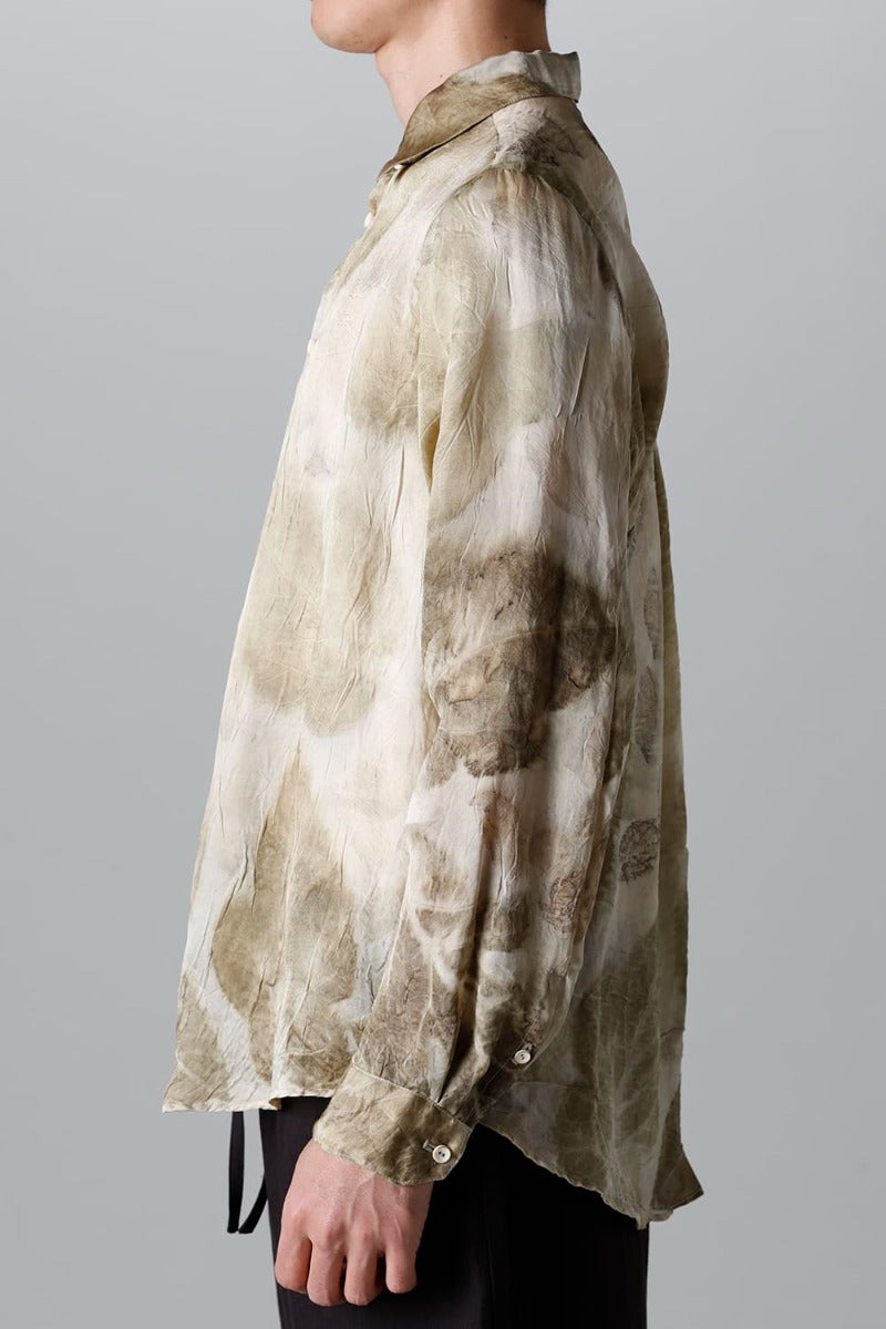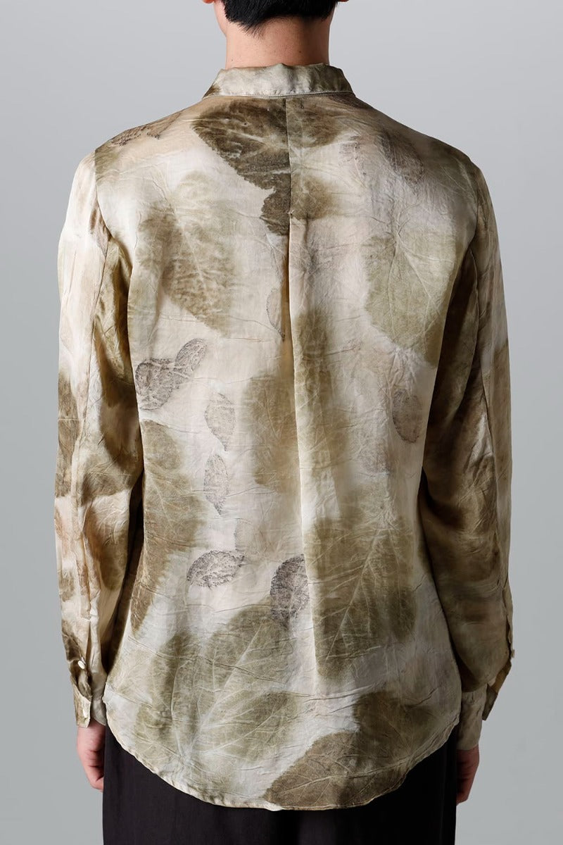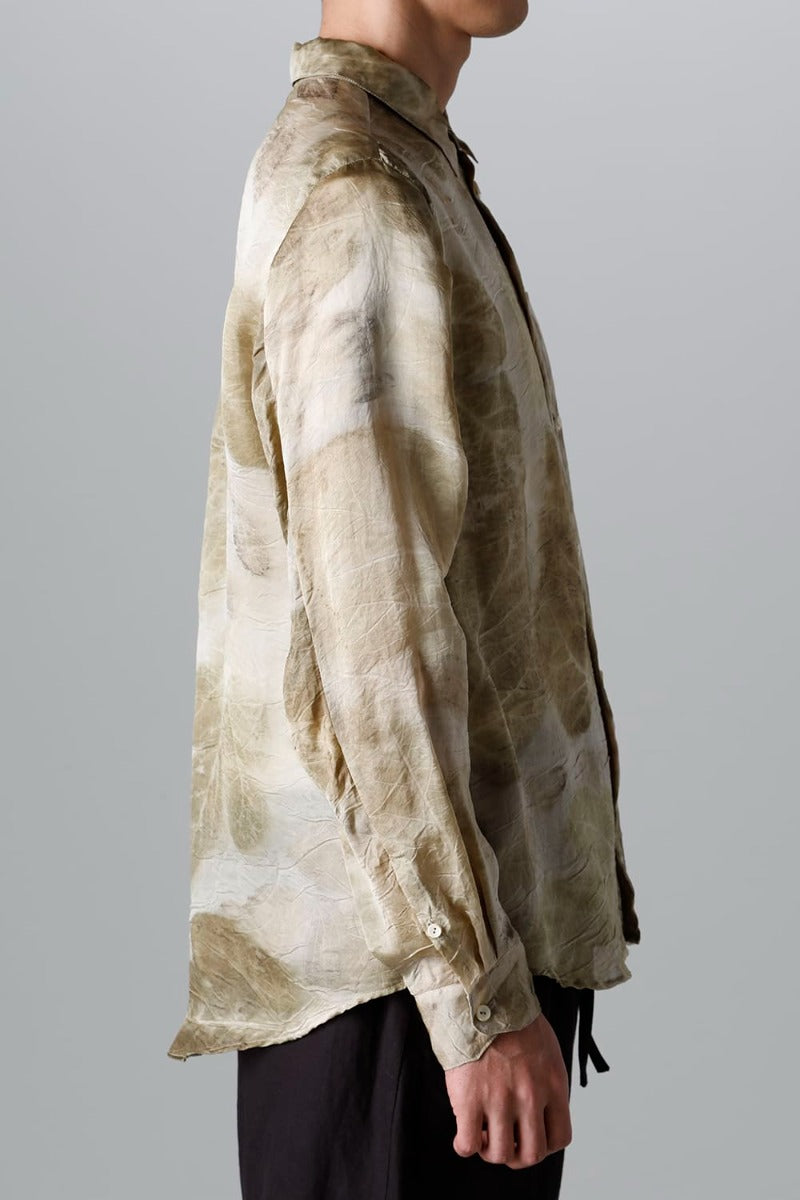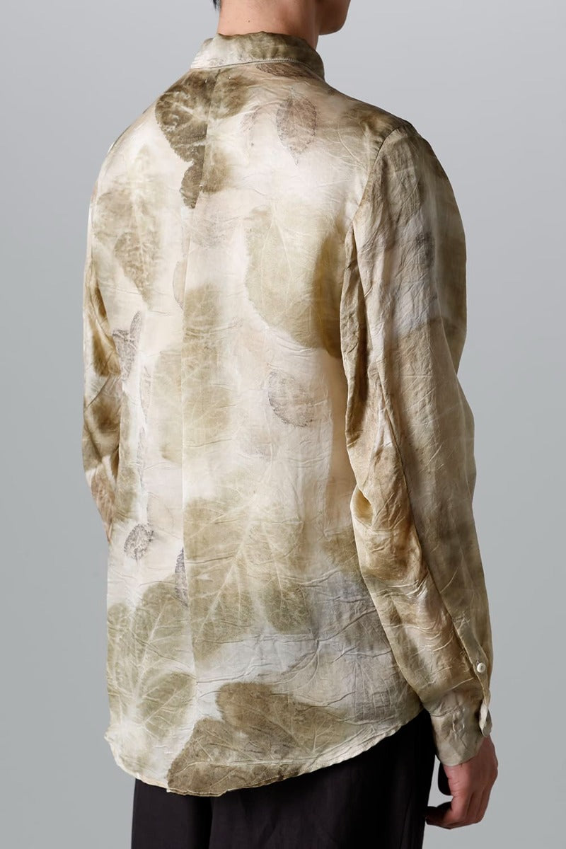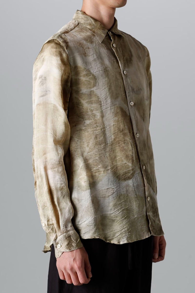 毎シーズン展開している定番シャツ。素材は、いつも使用しているシルクの工場が以前洪水に遭い、浸水して使えなくなったヴィンテージシルク。それらを引き取り、染色して新しい価値を生み出す生地へと再生した。プリントは天然の桑の葉などを生地に直接配置して熱を加えて転写した草木染。葉っぱの状態によって色の出方が異なり、自然が生み出す美しさと不均一さが面白い。同じ柄は一つとして無い一点物。