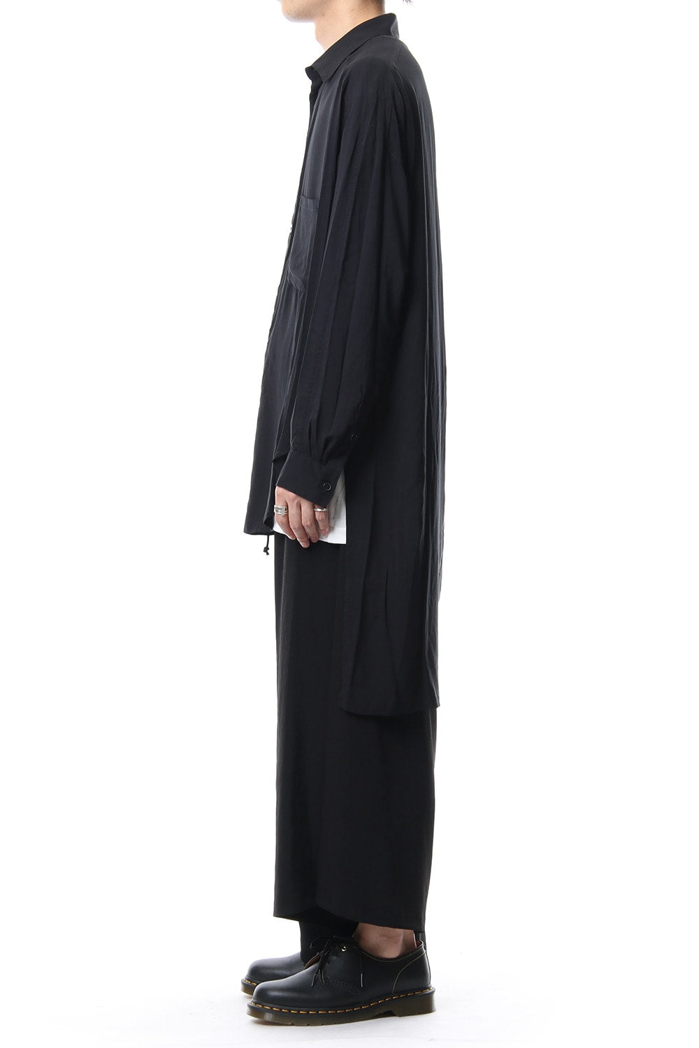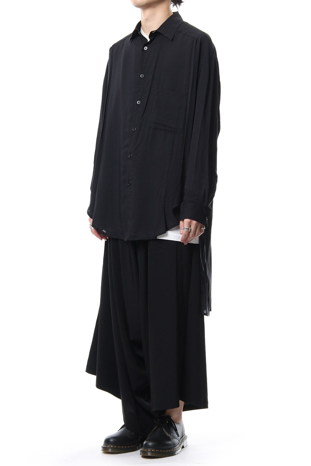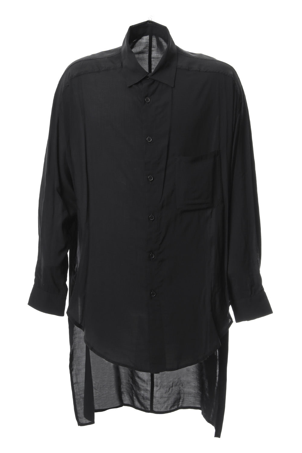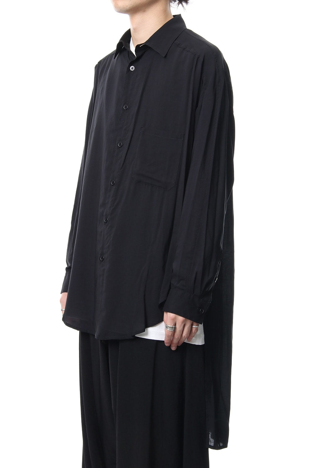 ベーシックなシャツの表情ながら、前がレギュラー、後ろがロングと段違いの丈になったレーヨンスパンローンのシャツです。前後の丈の違いを生かしたレイヤードスタイルを楽しんでいただけます。軽やかな落ち感の生地が特徴です。