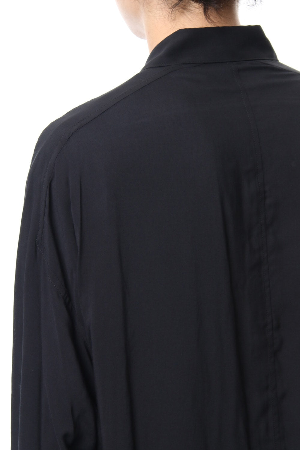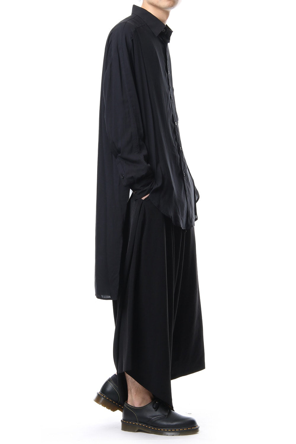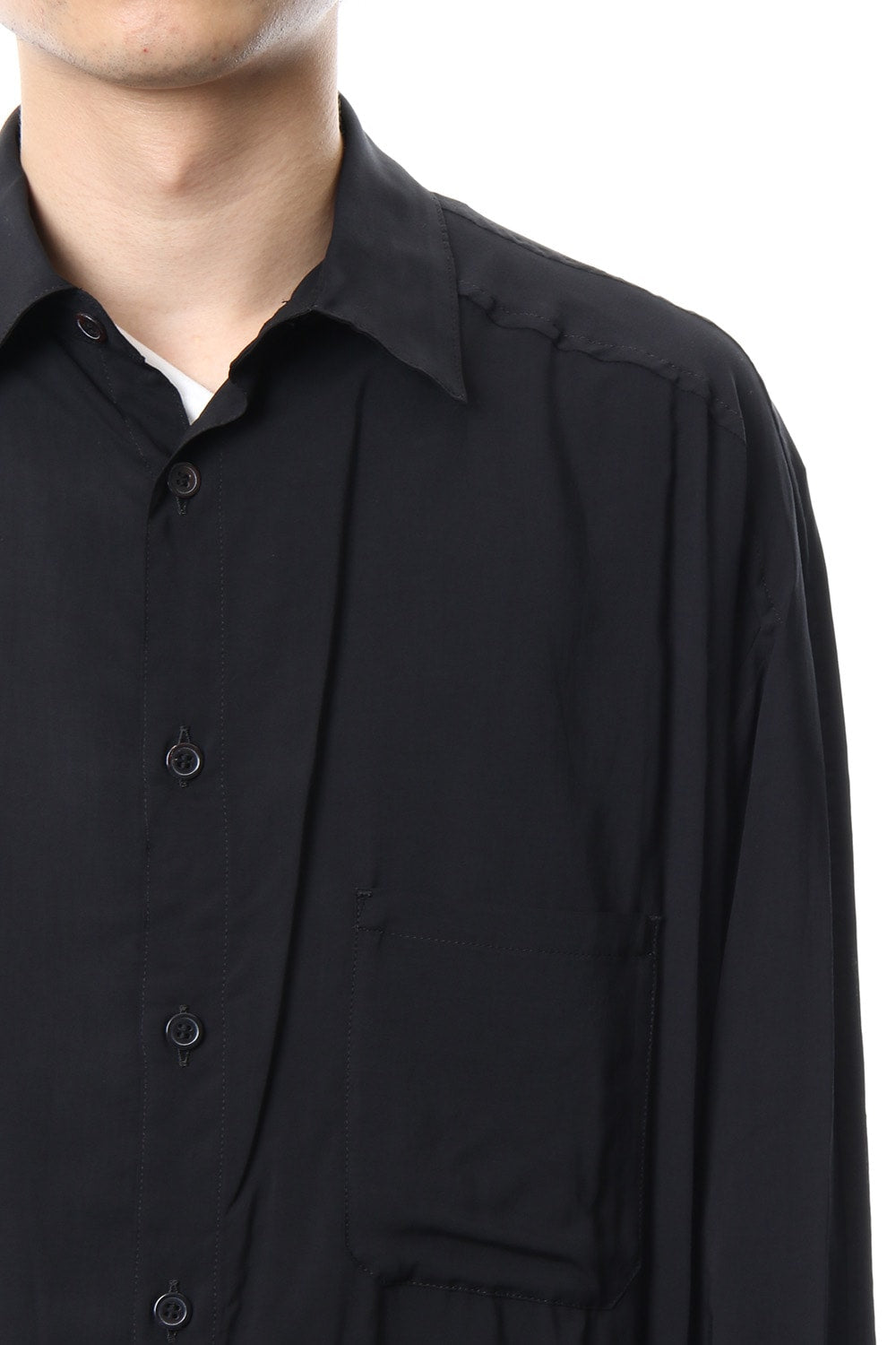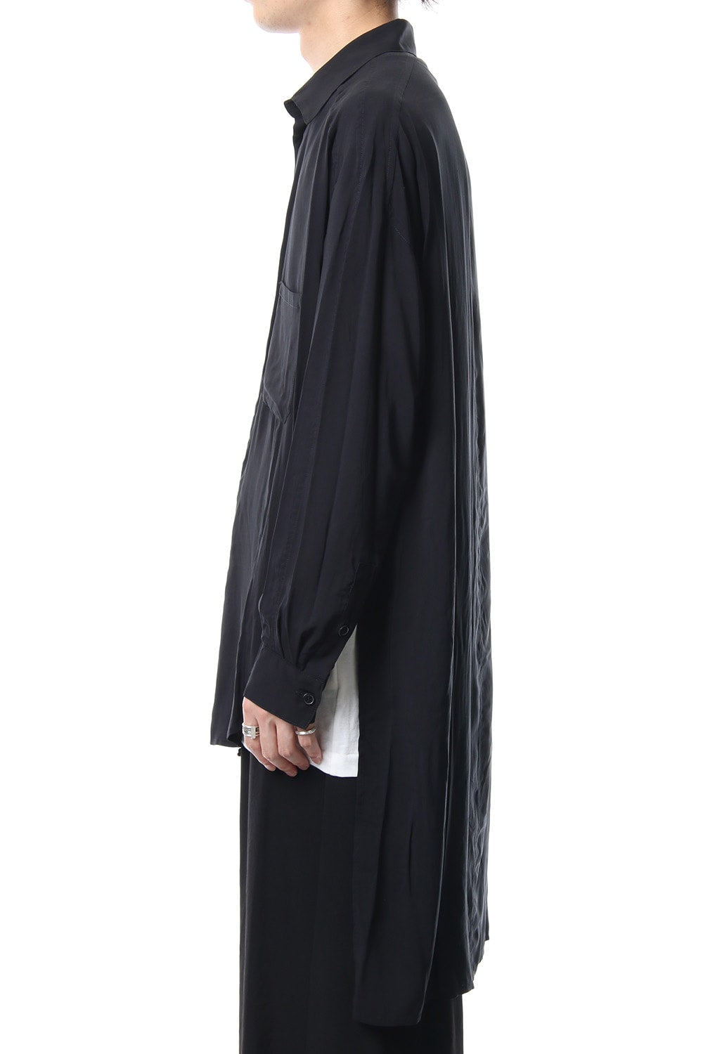 ベーシックなシャツの表情ながら、前がレギュラー、後ろがロングと段違いの丈になったレーヨンスパンローンのシャツです。前後の丈の違いを生かしたレイヤードスタイルを楽しんでいただけます。軽やかな落ち感の生地が特徴です。